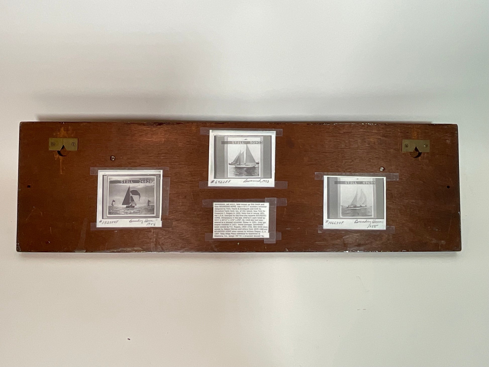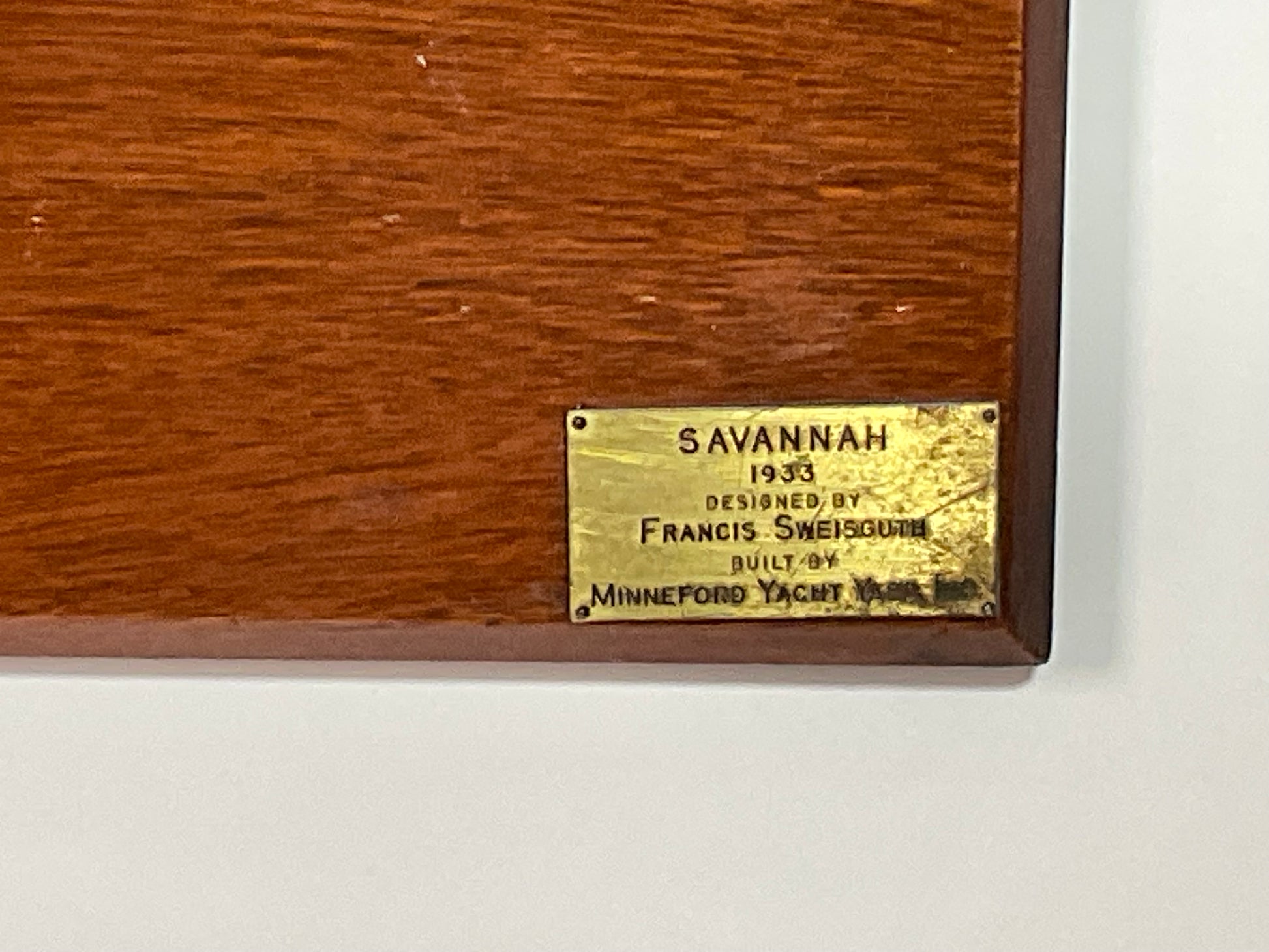 Sleek half model of a sailing yacht with engraved nameplate "Savannah 1933," designed by Francis Sweisguth, built by Minneford Yacht Yard Inc. A rare relic with hull that is painted crème over gold.