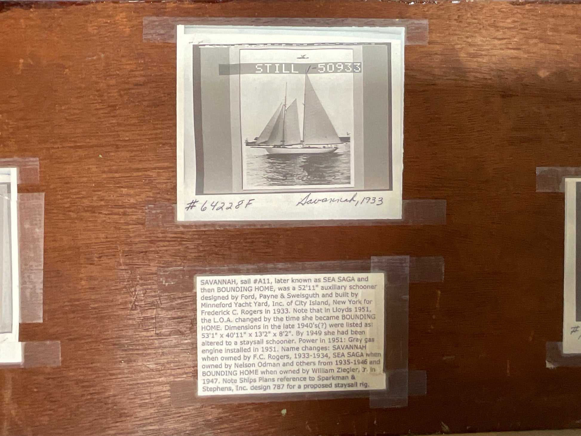 SAVANNAH, sail #A11, later known as SEA SAGA and then BOUNDING HOME, was a 52'11" auxiliary schooner designed by Ford, Payne & Sweisguth and built by Minnefords Yacht Yard, Inc. of City Island, New York for Frederick C. Rogers in 1933. Note that in Lloyds 1951, the L.O.A. changed by the time she became BOUNDING HOME. Dimensions in the late 1940's(?) were listed as: 53'1" x 40'11" x 13'2" x 8'2". By 1949 she had been altered to a staysail schooner. Power in 1951: Gray gas engine installed in 1951. Name changes: SAVANNAH when owned by F.C. Rogers, 1933–1934, SEA SAGA when owned by Nelson Odman and others from 1935–1946 and BOUNDING HOME when owned by William Ziegler, Jr. in 1947. Note Ships Plans reference to Sparkman & Stephens, Inc. design 787 for a proposed staysail rig.