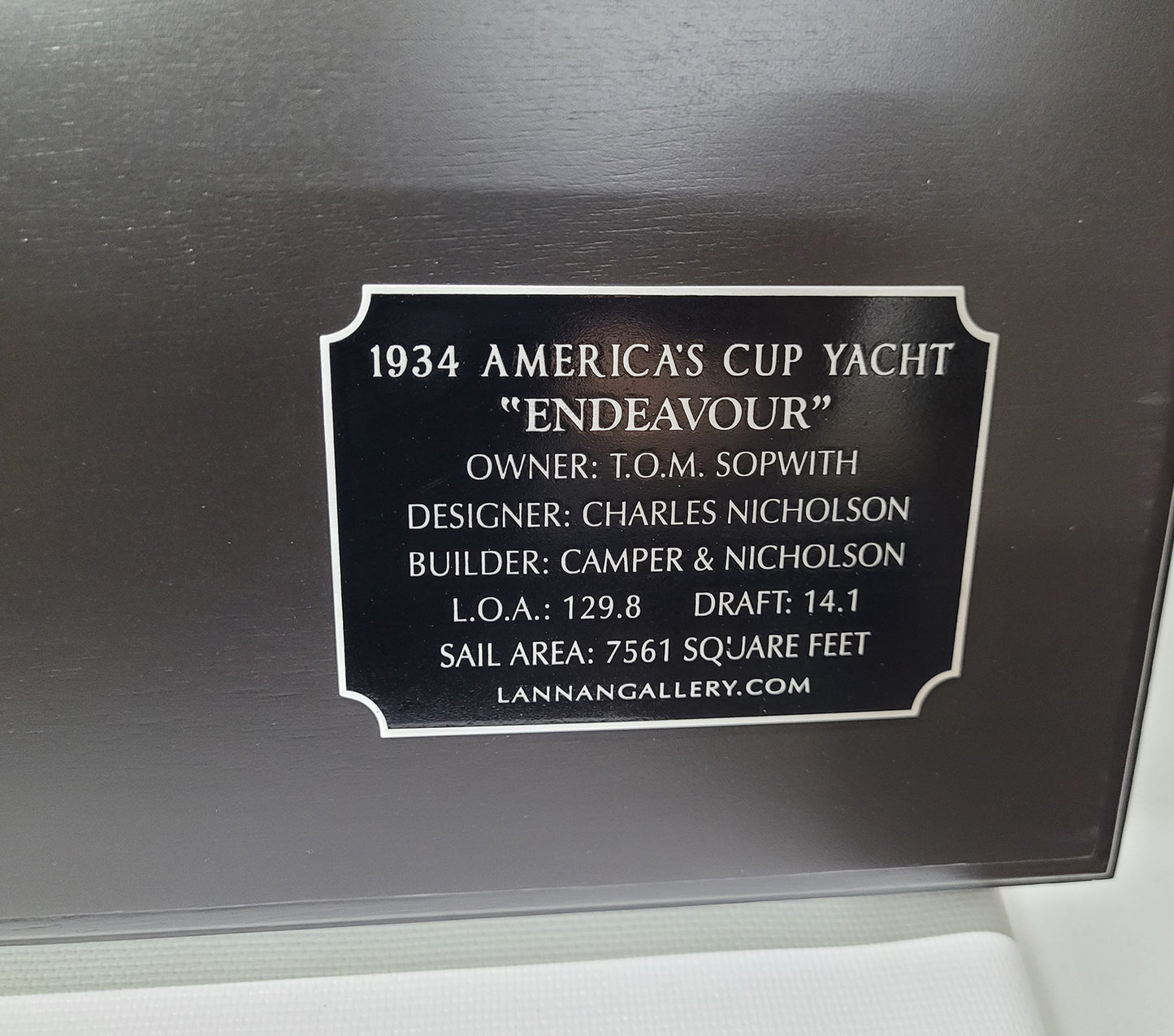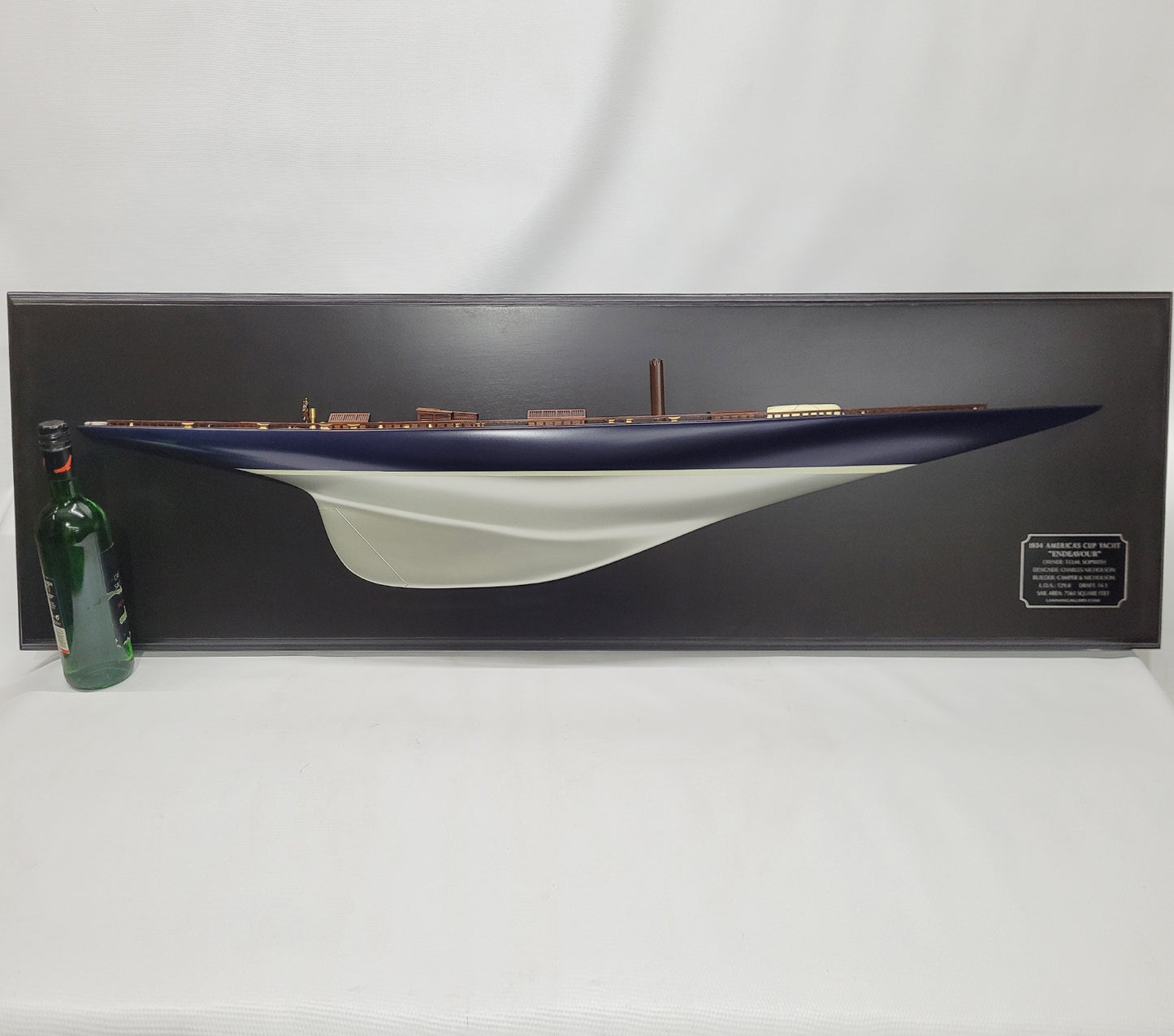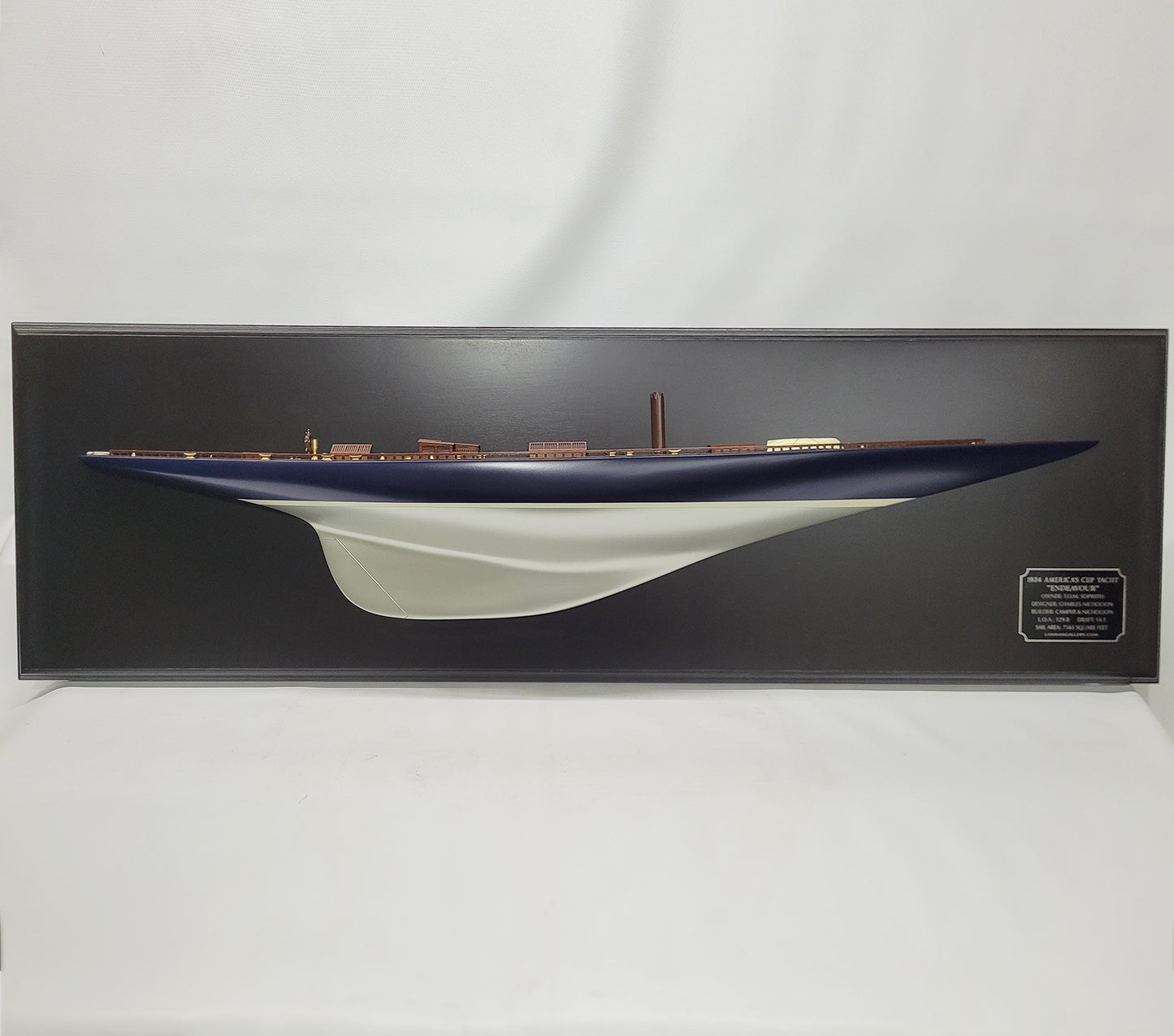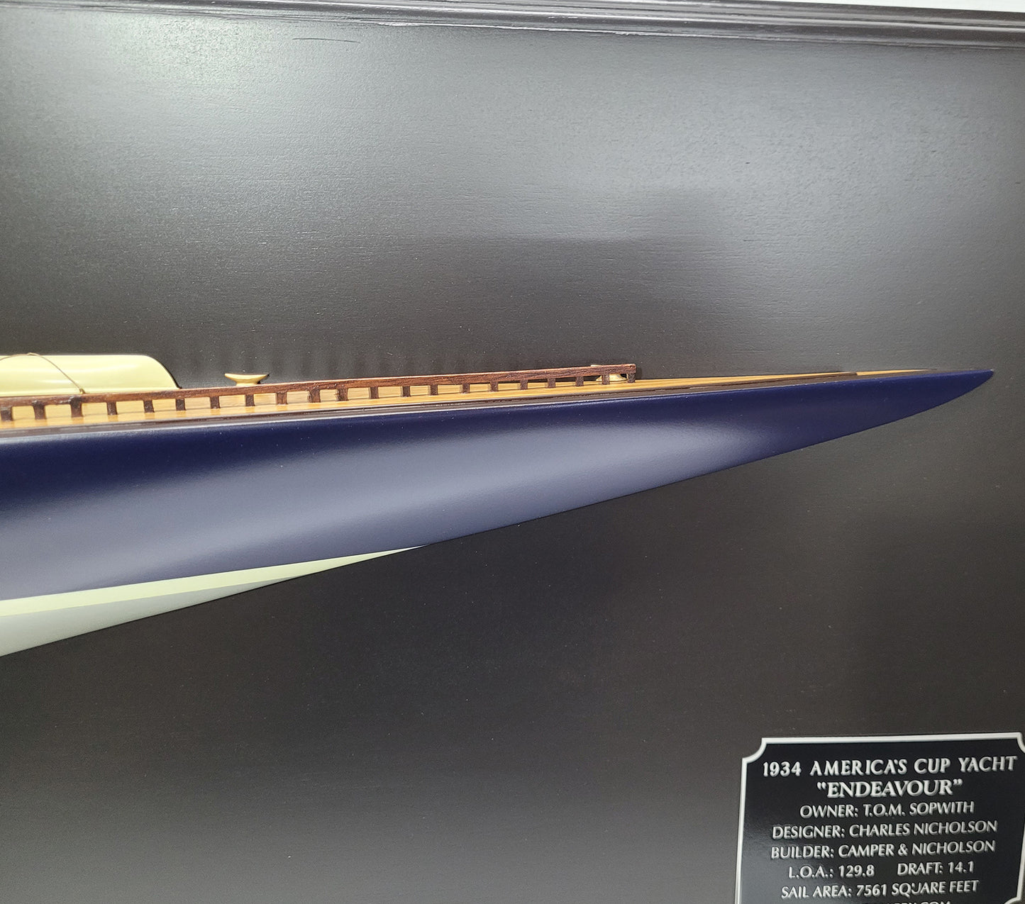 Half model of the America’s cup Yacht Endeavor. This is a 4-foot hull mounted to a blackboard. The Hull is painted blue over silver. The planked deck has skylights, Companionway, Spinnaker pole, Lifeboat, Cleats, Toe rail, Etc. Mounted to a varnished backboard with brass nameplate.