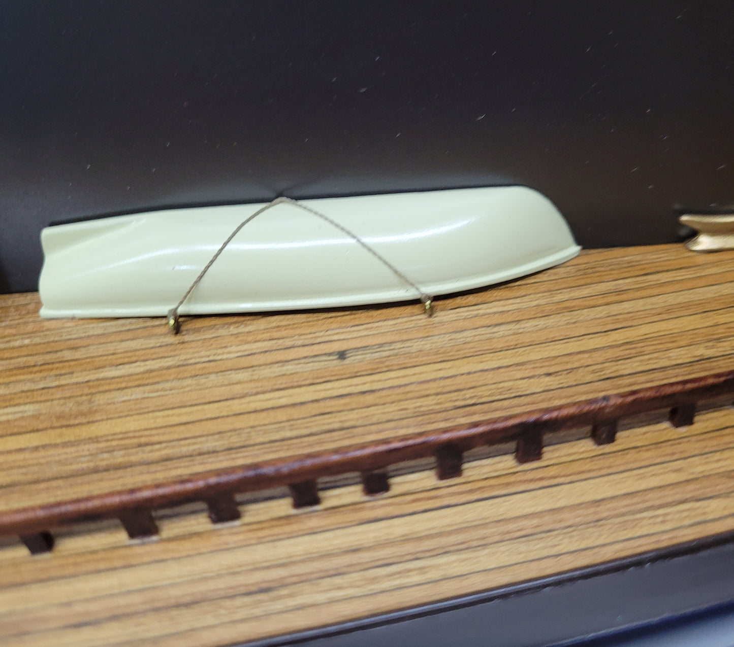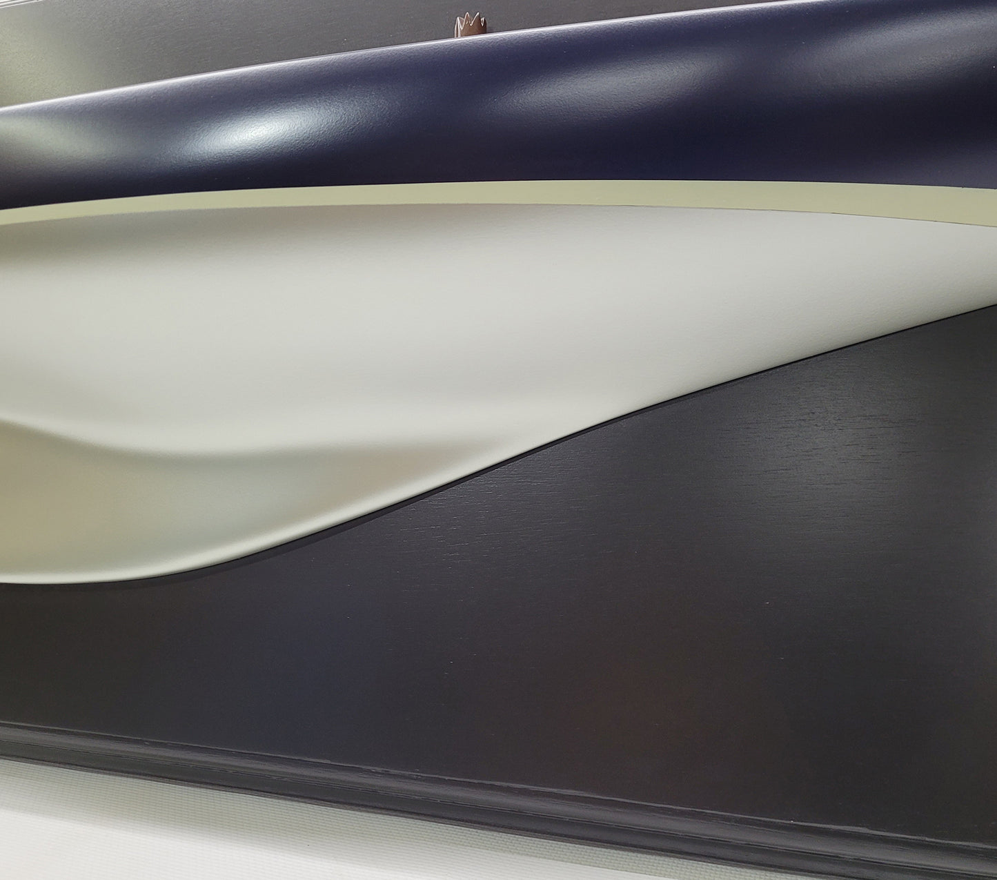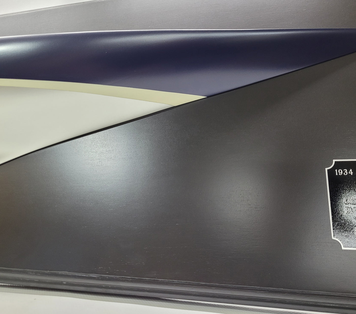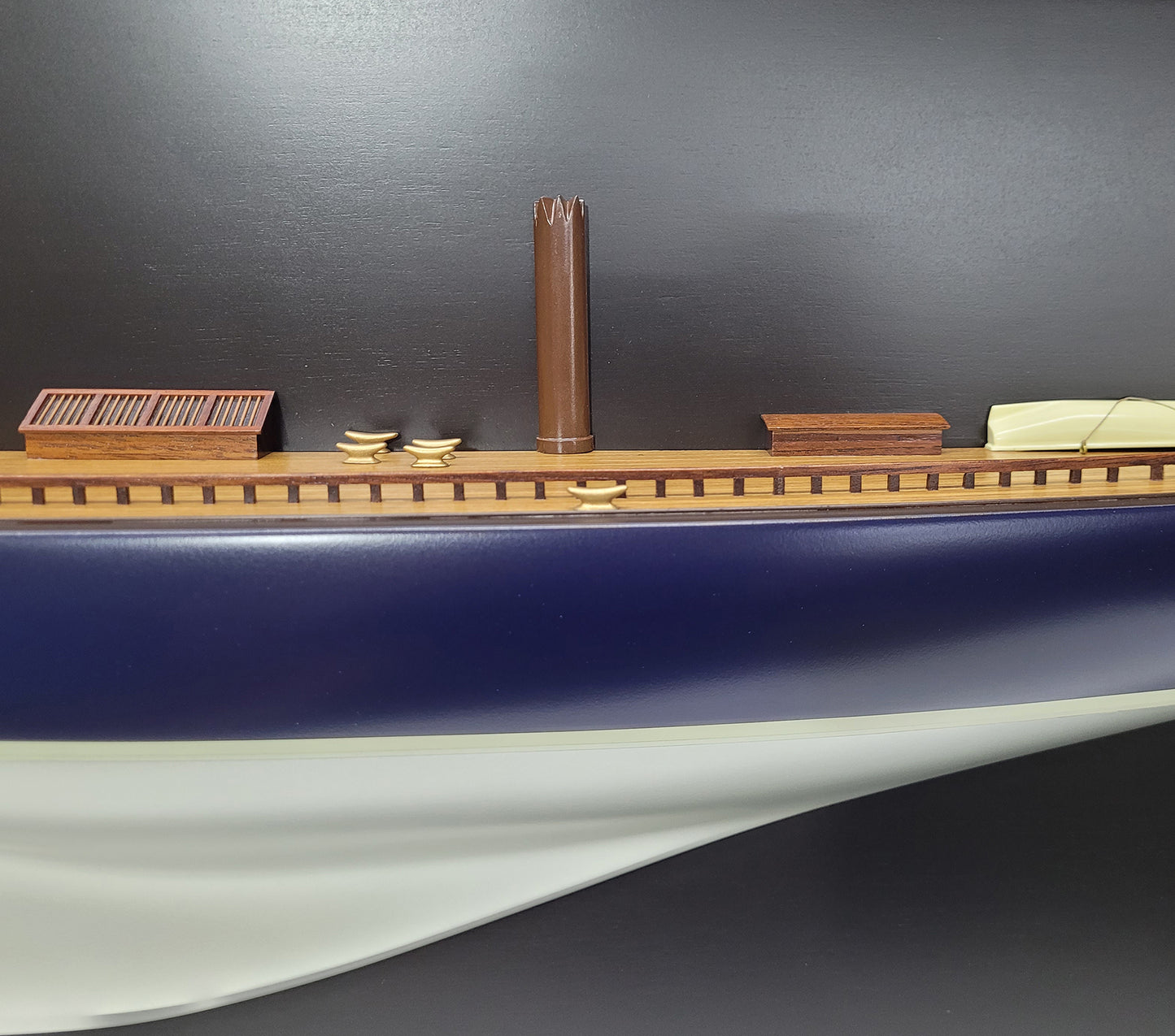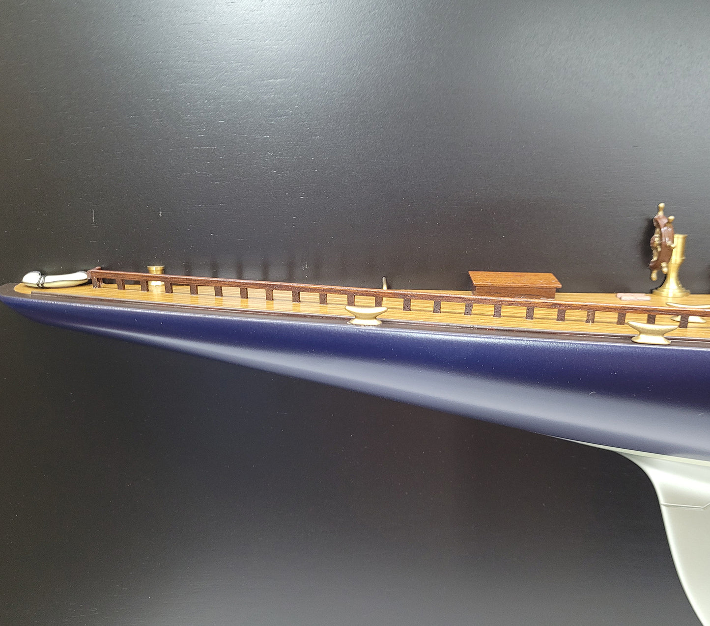 Half model of the America’s cup Yacht Endeavor. This is a 4-foot hull mounted to a blackboard. The Hull is painted blue over silver. The planked deck has skylights, Companionway, Spinnaker pole, Lifeboat, Cleats, Toe rail, Etc. Mounted to a varnished backboard with brass nameplate.