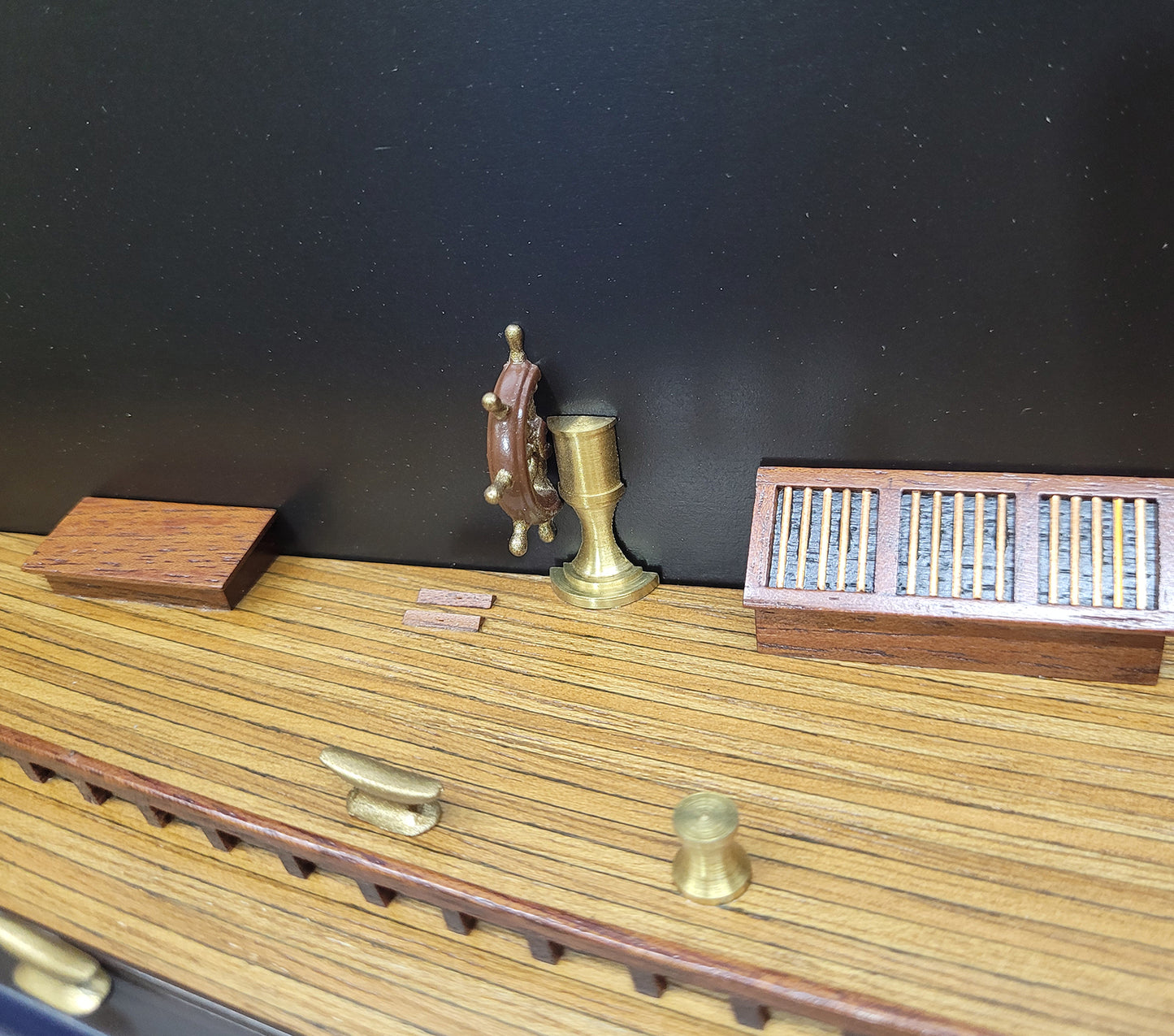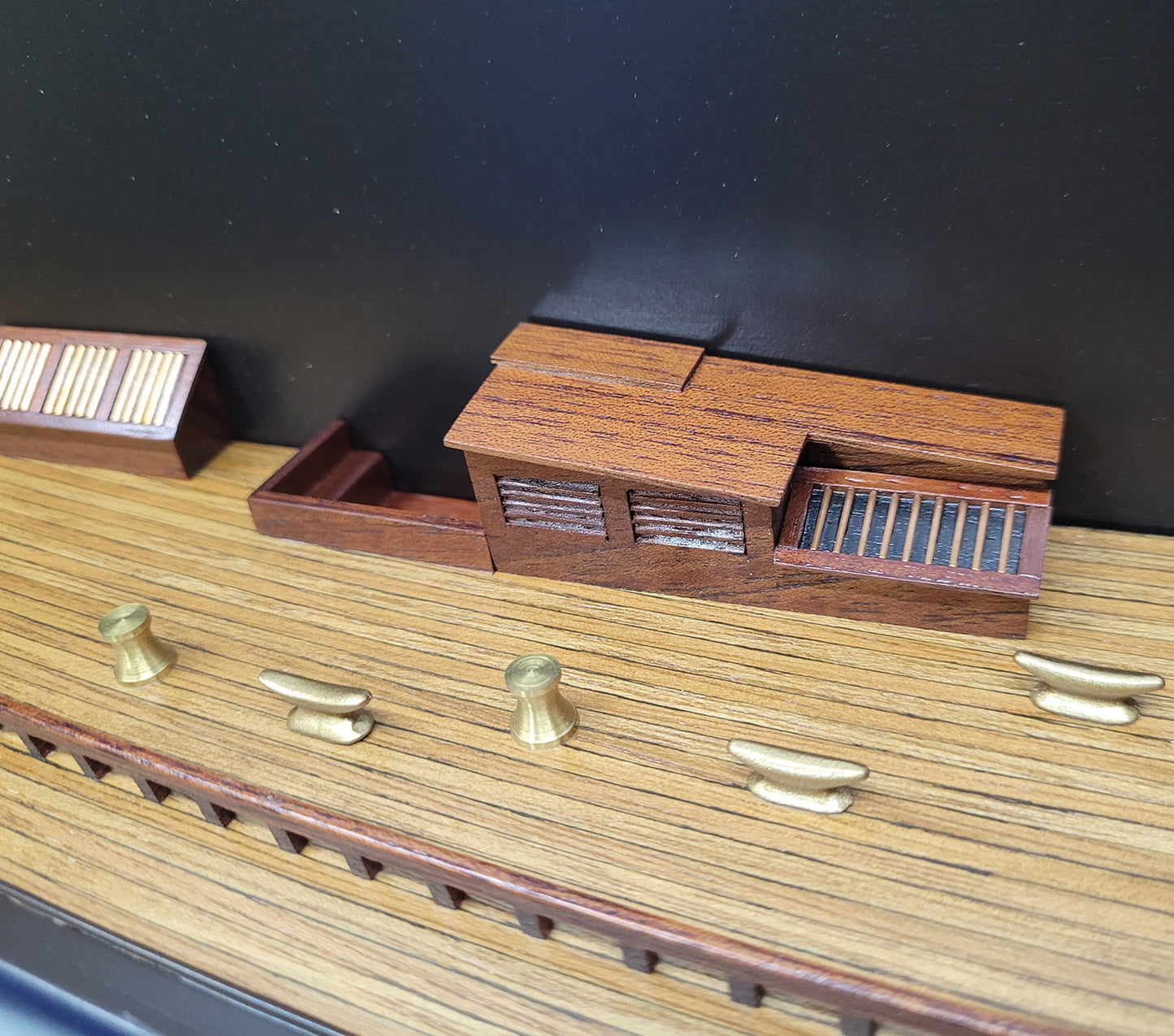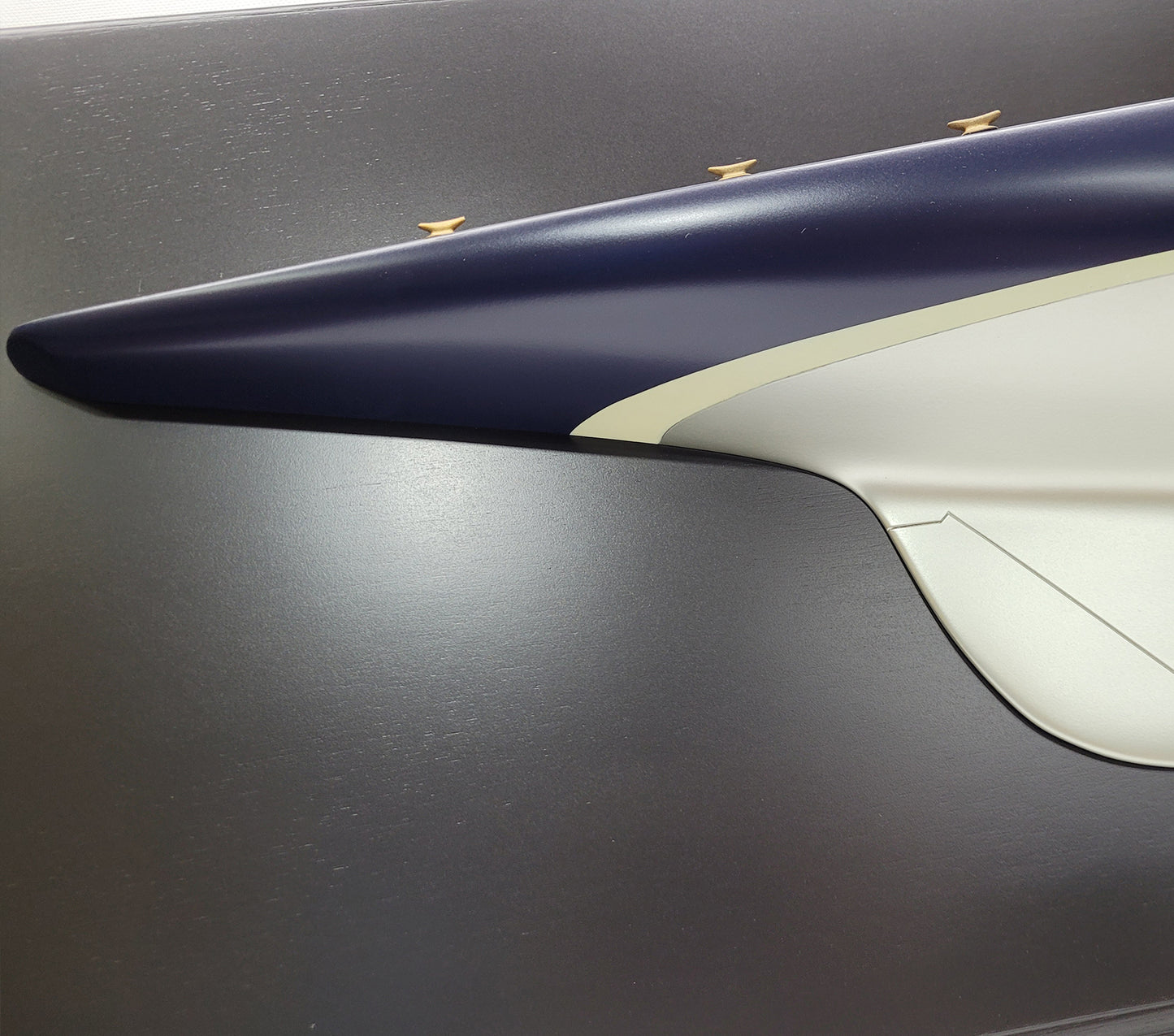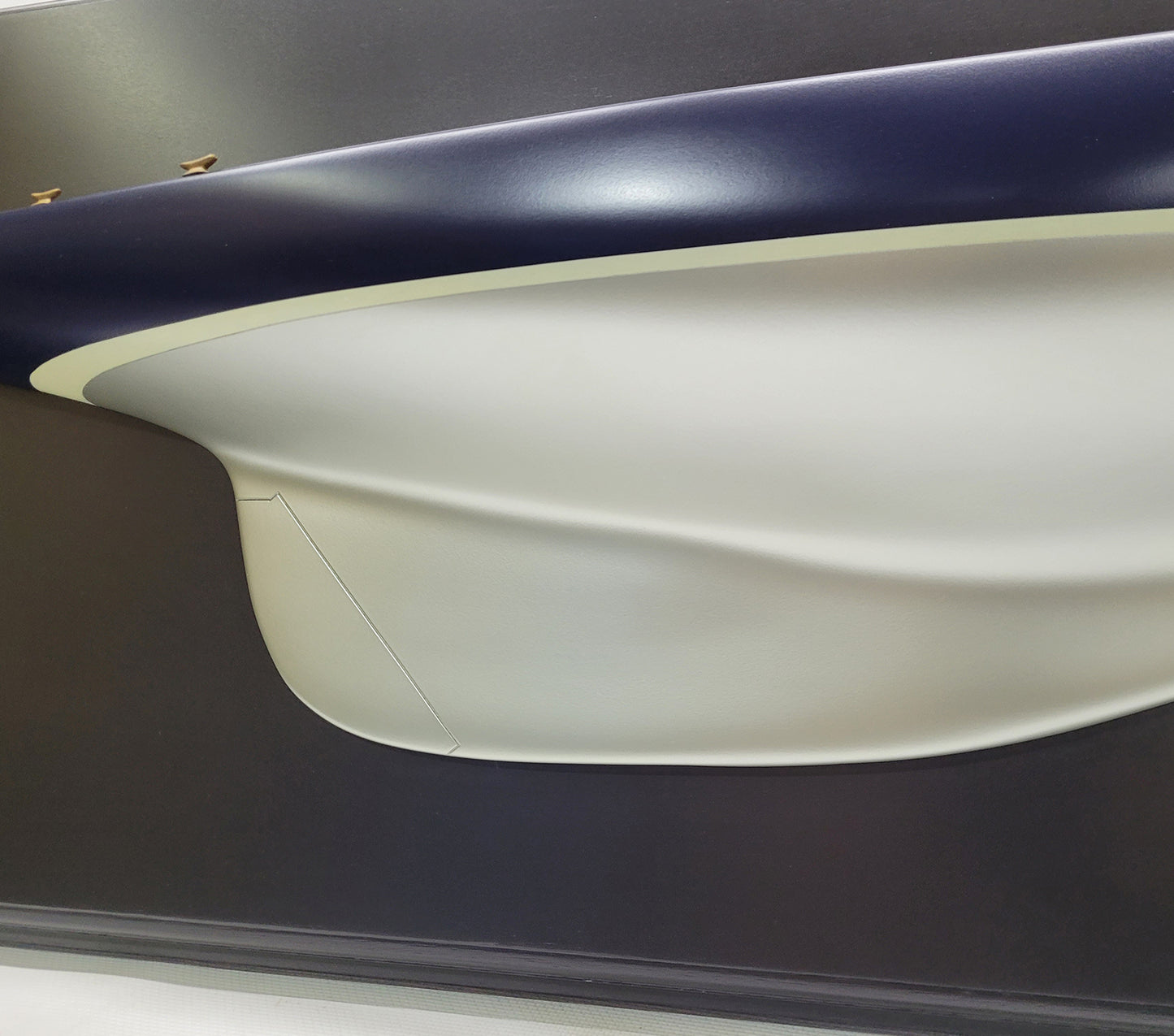 Half model of the America’s cup Yacht Endeavor. This is a 4-foot hull mounted to a blackboard. The Hull is painted blue over silver. The planked deck has skylights, Companionway, Spinnaker pole, Lifeboat, Cleats, Toe rail, Etc. Mounted to a varnished backboard with brass nameplate.