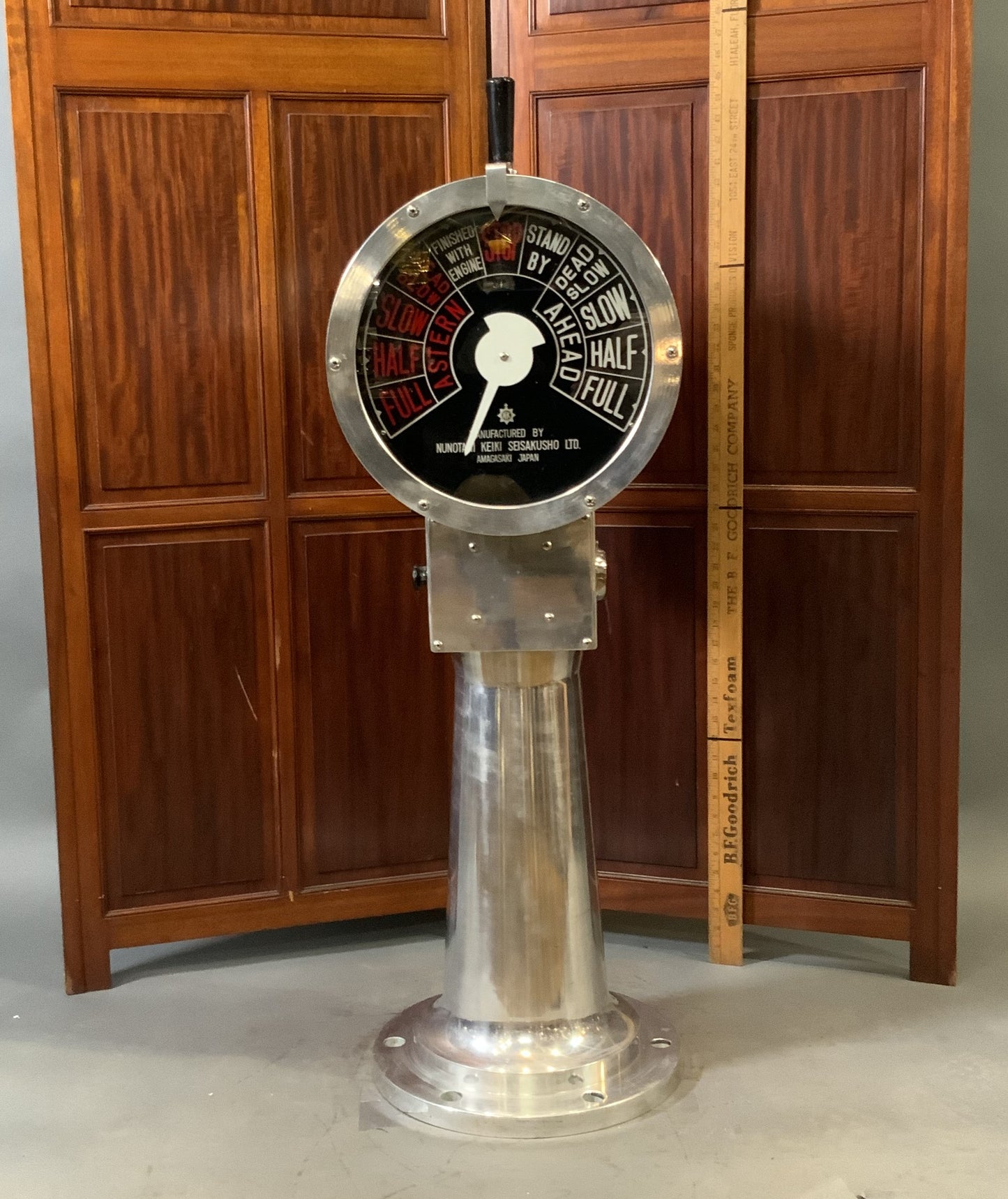 Ships bridge telegraph by Japanese Maker. Faceplate shows ships commands in english with astern and ahead, slow, half, full, finished with engines and stop.