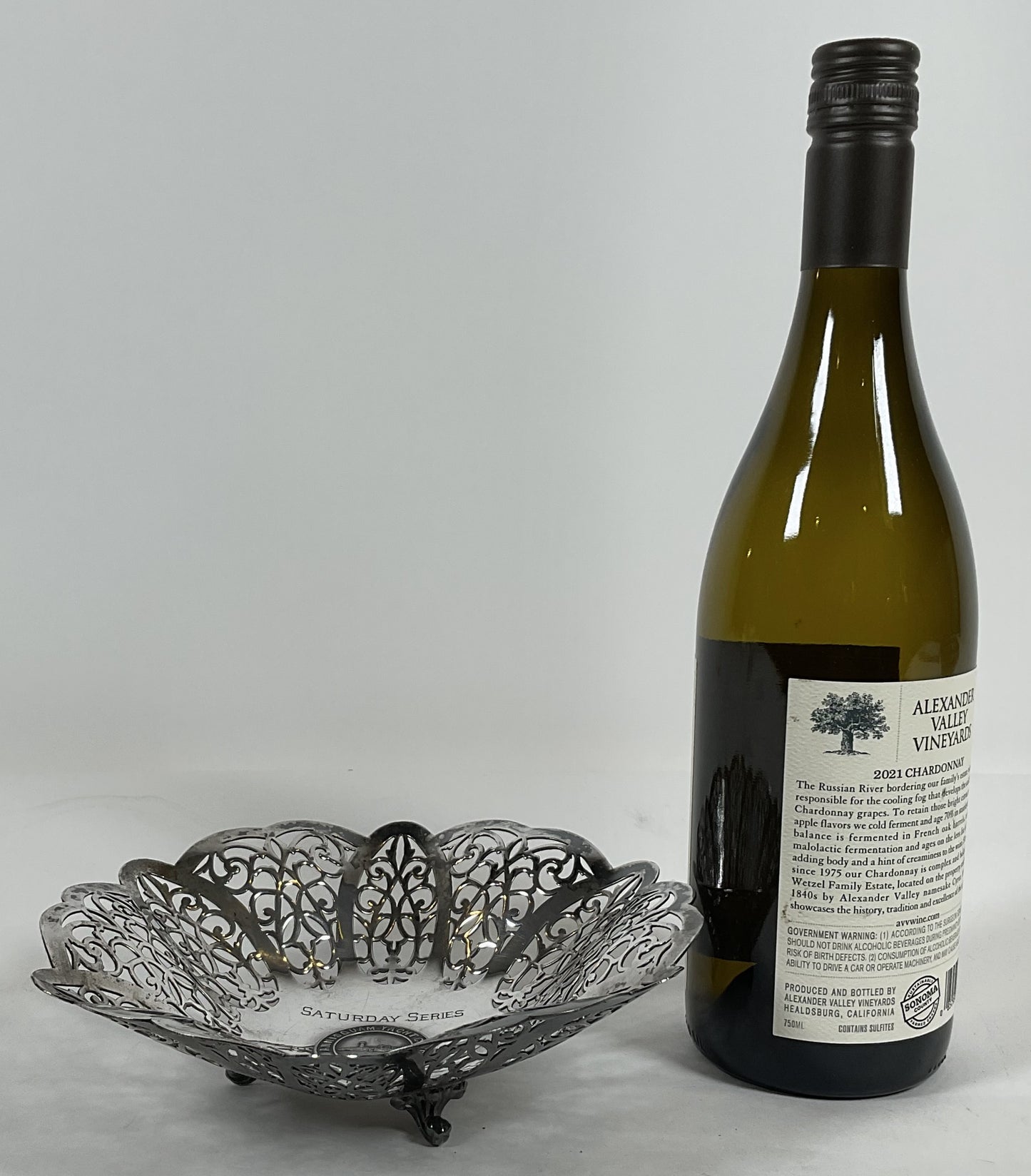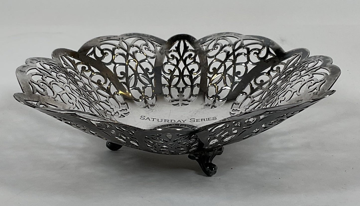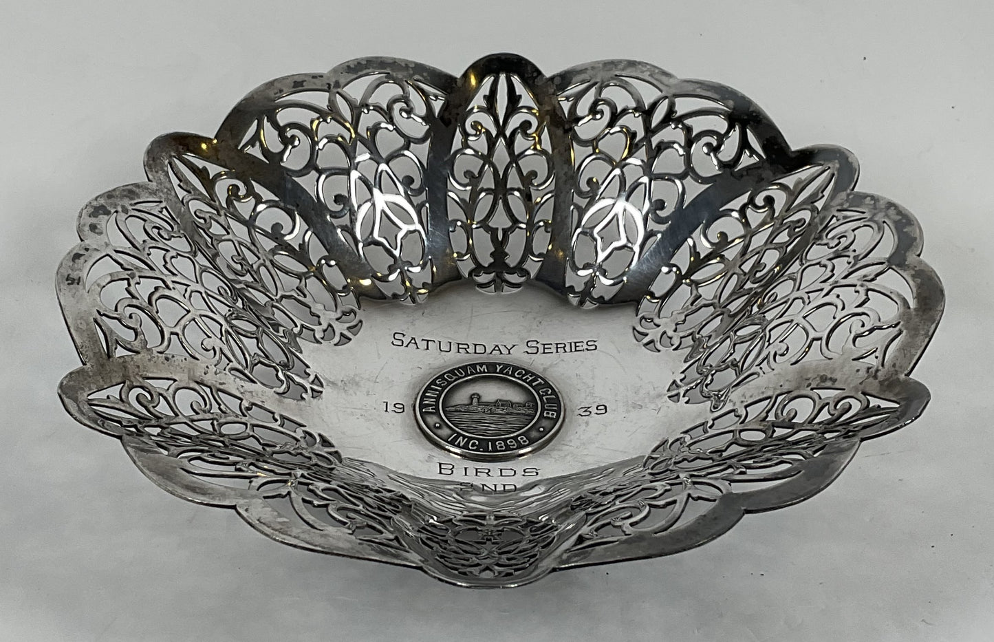 Silver plated lattice bowl that is a sailing trophy from the Annisquam Yacht Club in Gloucester, Mass. Dated 1939. Engraved "Saturday Series", "Birds" Class, 1939. Marked on Bottom WM Rogers EPNS,8010. 2" H x 8" Diameter. 1 lb.