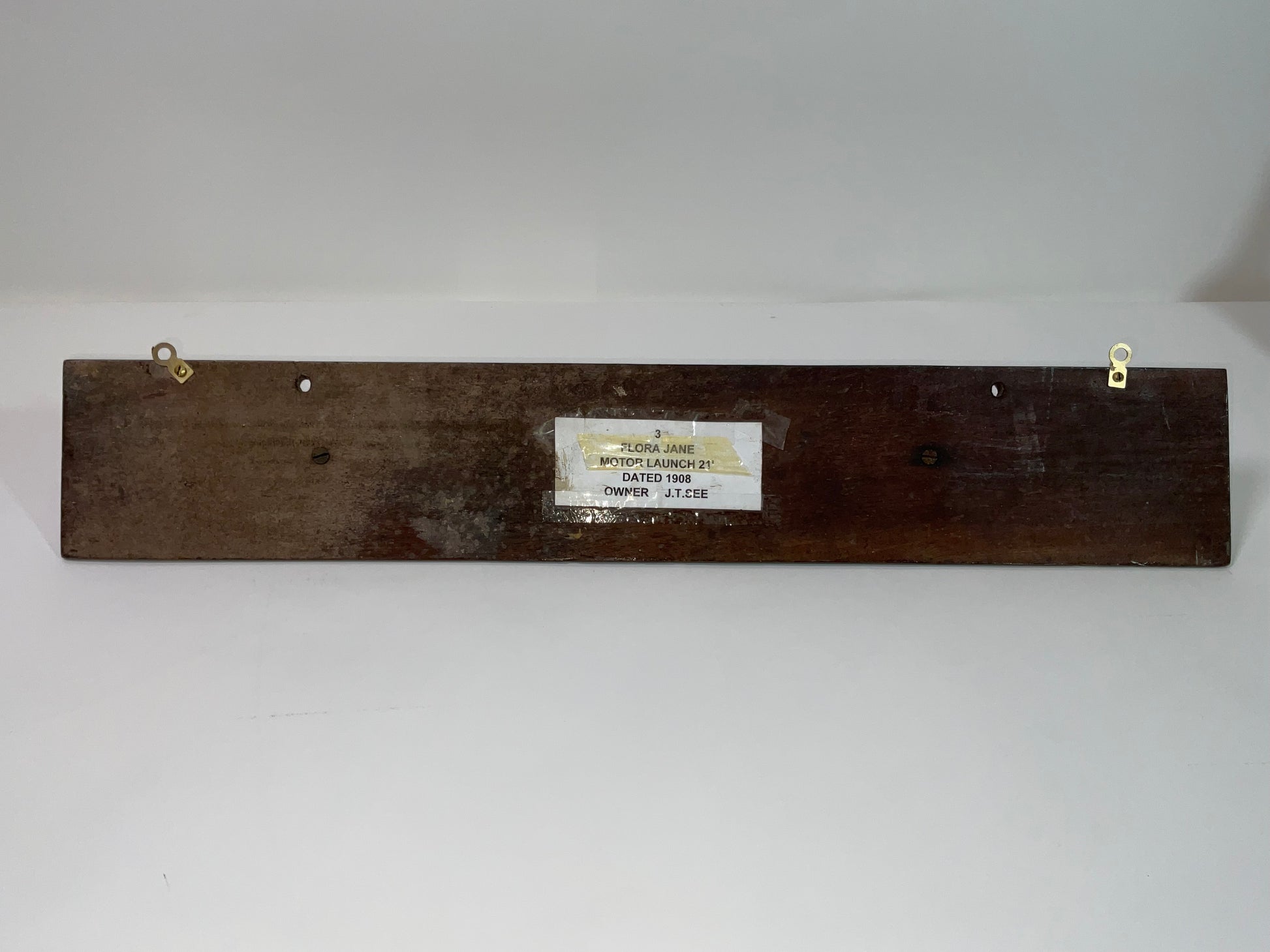Builders half model from 1908 of the Motor Launch Flora Jane. Varnished half hull model of a motor launch. Pine and mahogany hull. Reverse stern. Lettering is not original.