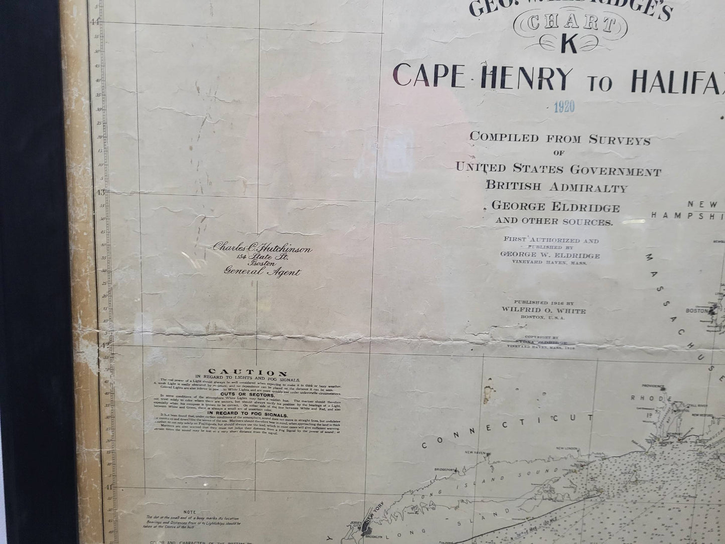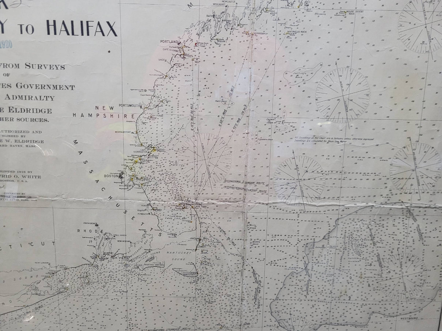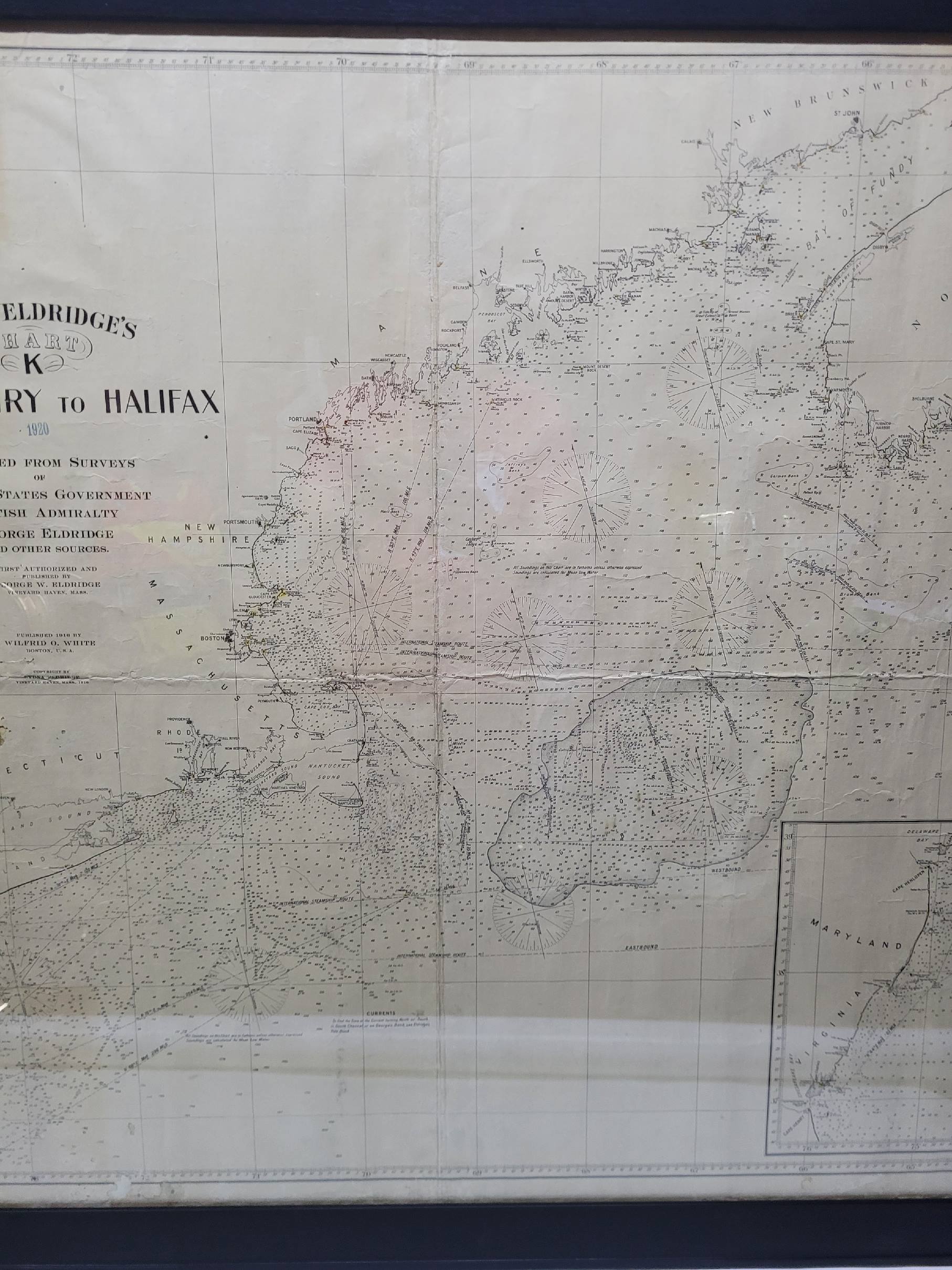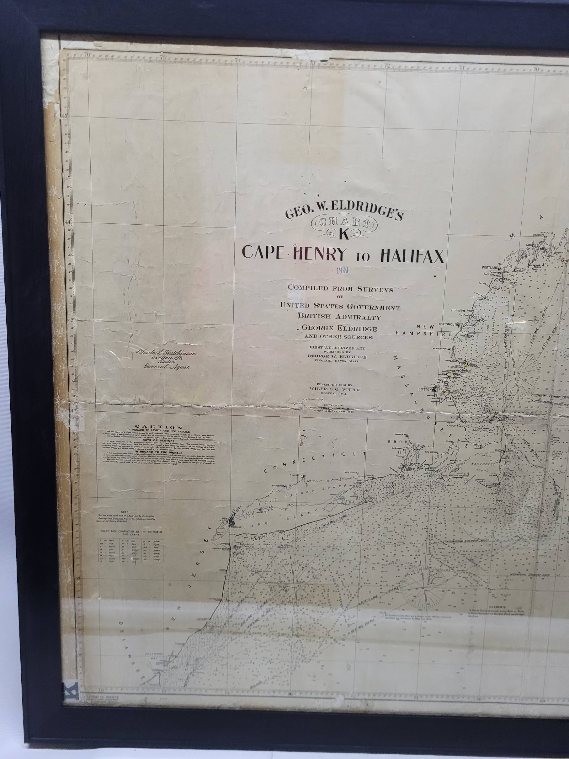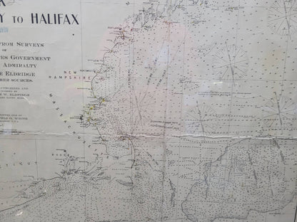 1920 nautical chart of the East Coast of the United States from Virginia to Maine, New Brunswick, and Nova Scotia. The chart shows Cape Cod, Long Island, the Connecticut coast, Jersey Shore, Maine, New Hampshire, etc. Very detailed, showing ports, lighthouses, shoals, depths, etc. The chart is by famous cartographer George W. Eldridge, compiled from surveys of the United States government, British Admiralty, George Eldridge, and others. First authorized by George Eldridge, published in 1916 by Wilfred O. White with a merchant's stamp of Charles Hutchinson, 154 State St., Boston.