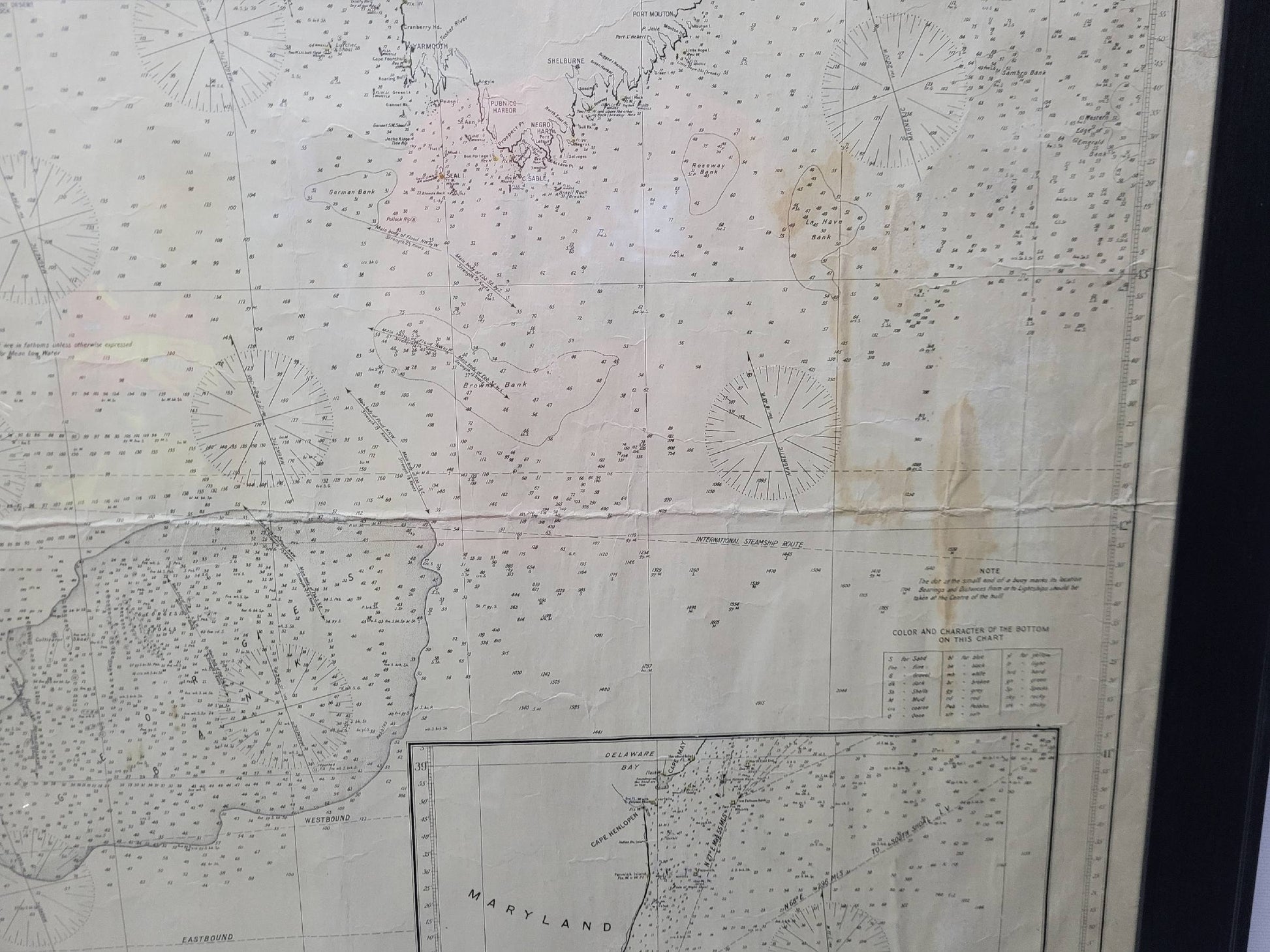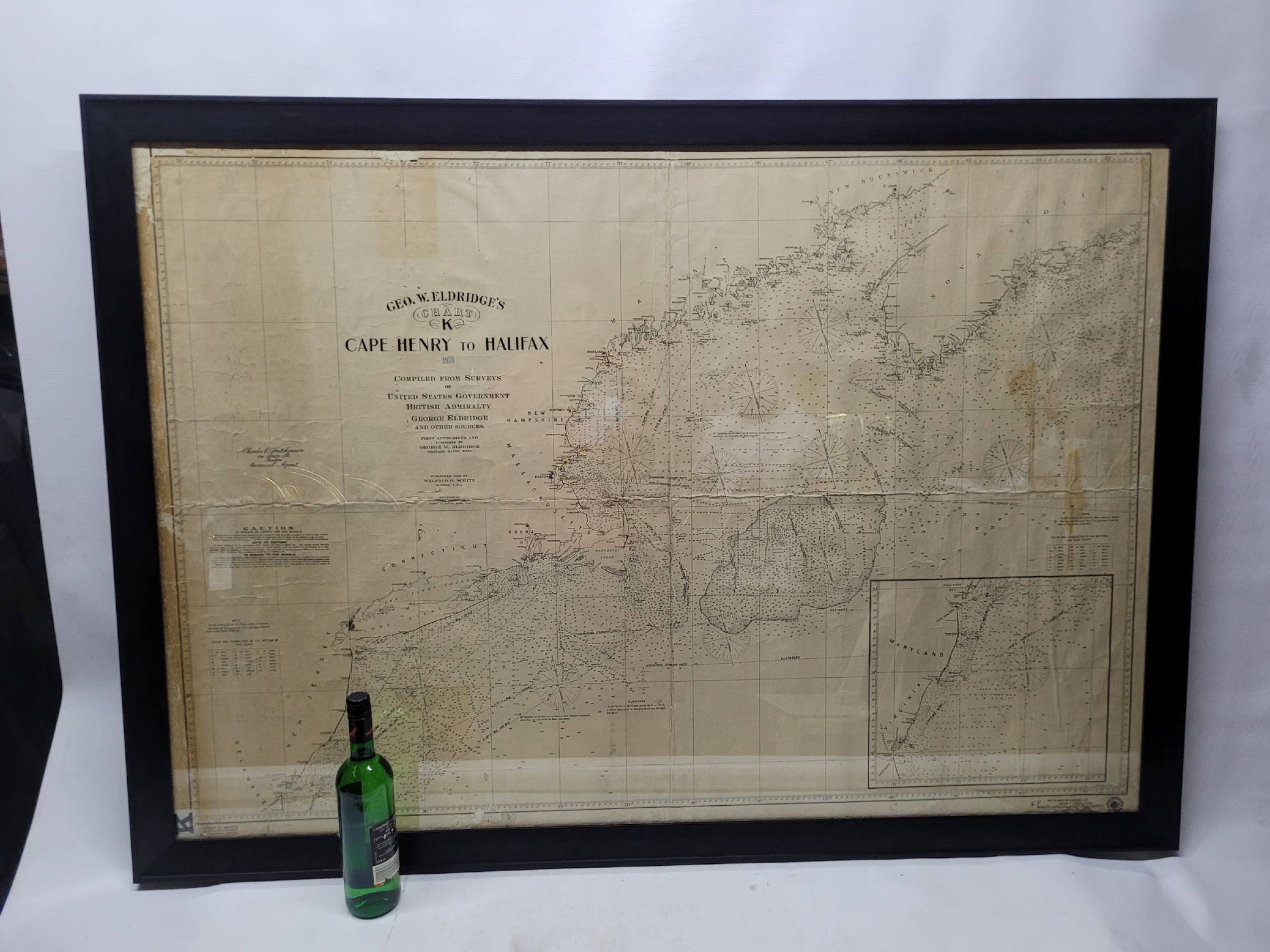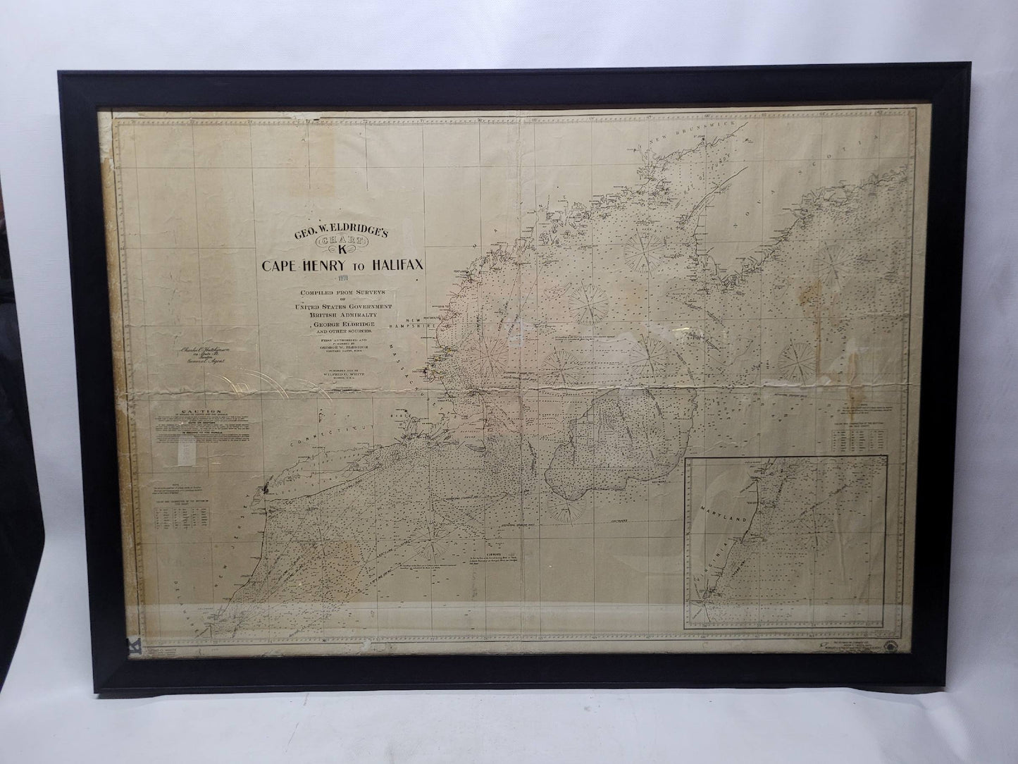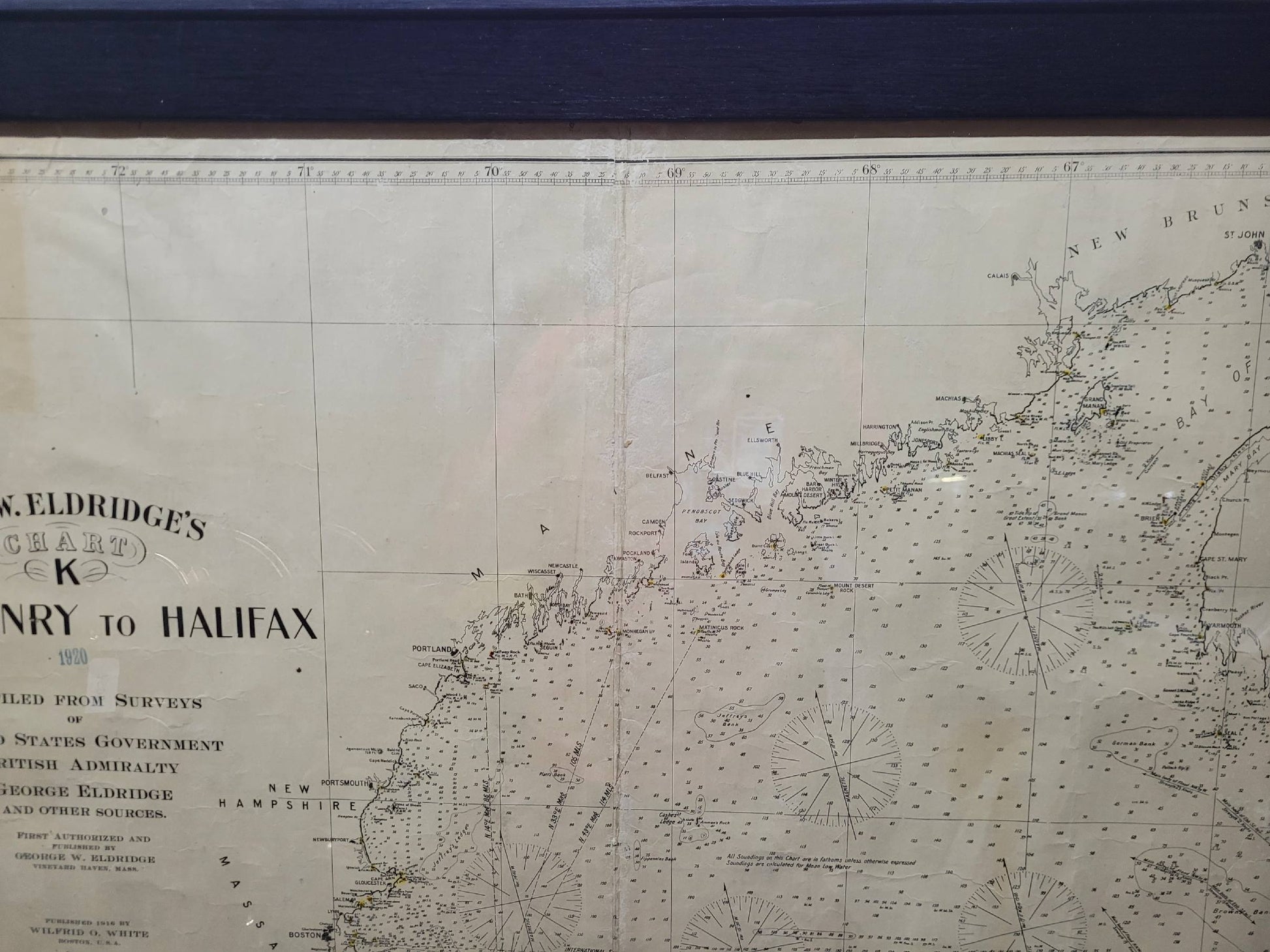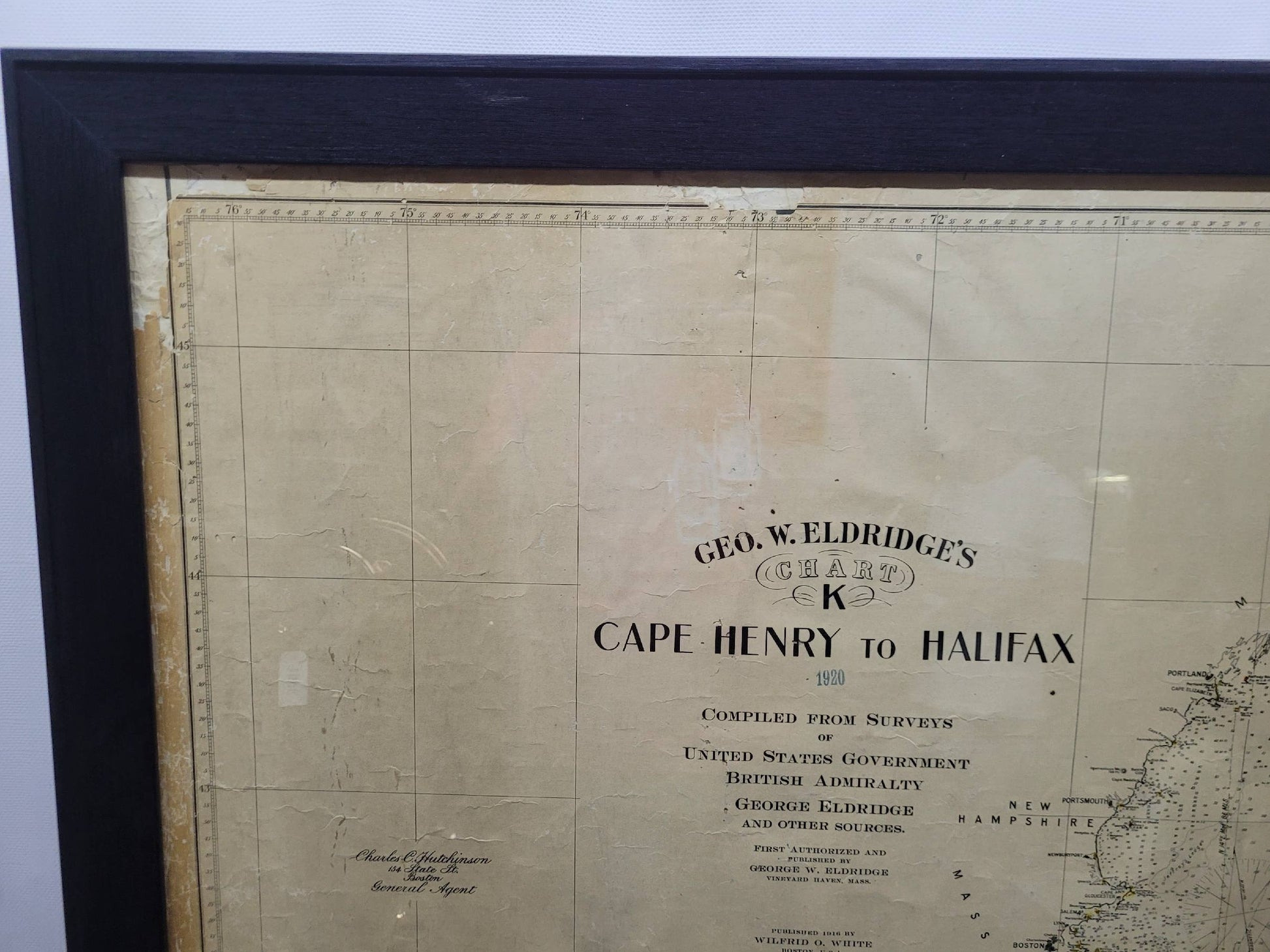 1920 nautical chart of the East Coast of the United States from Virginia to Maine, New Brunswick, and Nova Scotia. The chart shows Cape Cod, Long Island, the Connecticut coast, Jersey Shore, Maine, New Hampshire, etc. Very detailed, showing ports, lighthouses, shoals, depths, etc. The chart is by famous cartographer George W. Eldridge, compiled from surveys of the United States government, British Admiralty, George Eldridge, and others. First authorized by George Eldridge, published in 1916 by Wilfred O. White with a merchant's stamp of Charles Hutchinson, 154 State St., Boston.