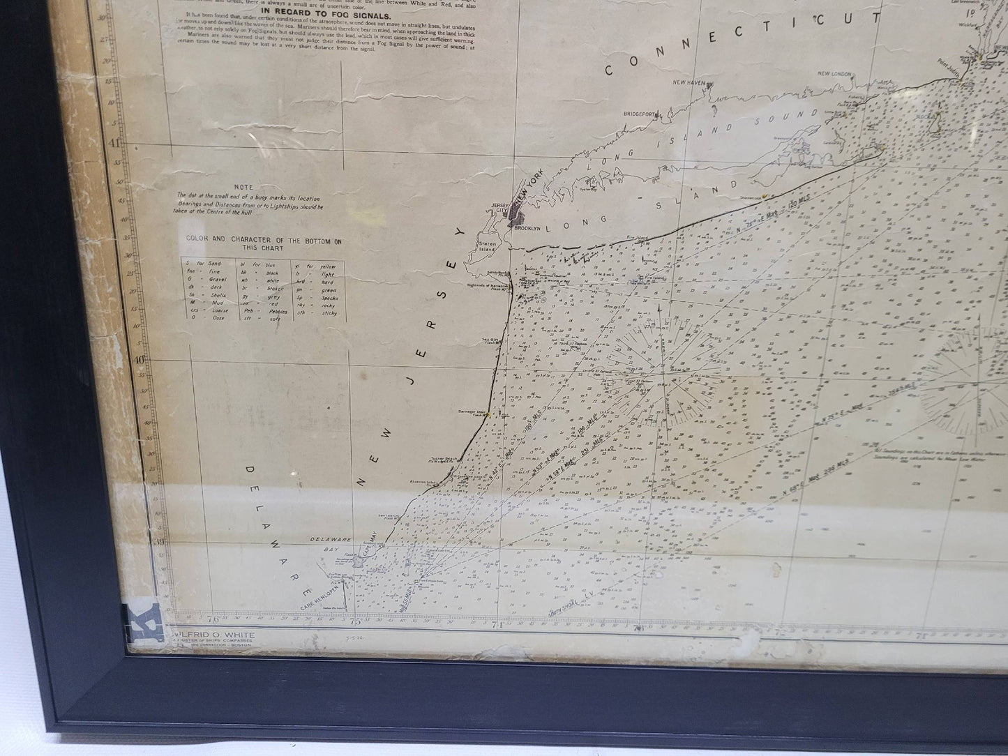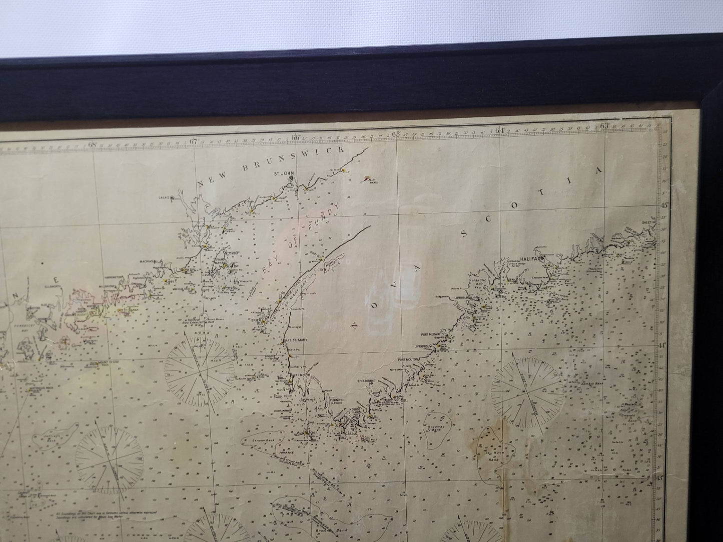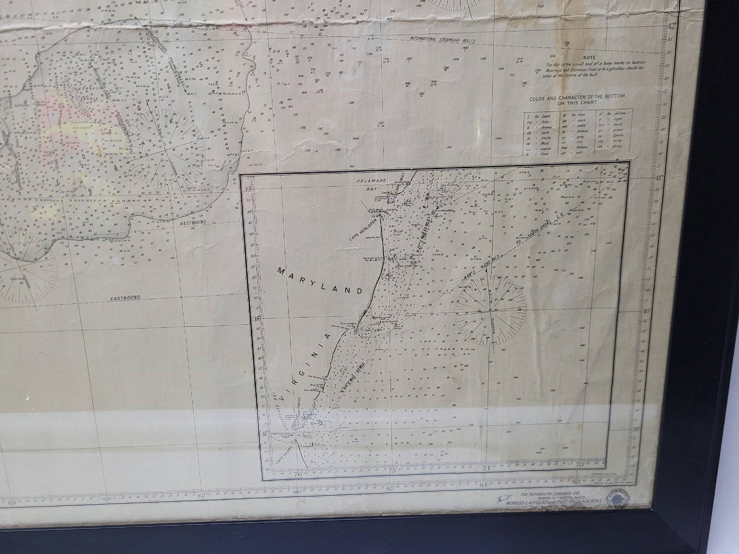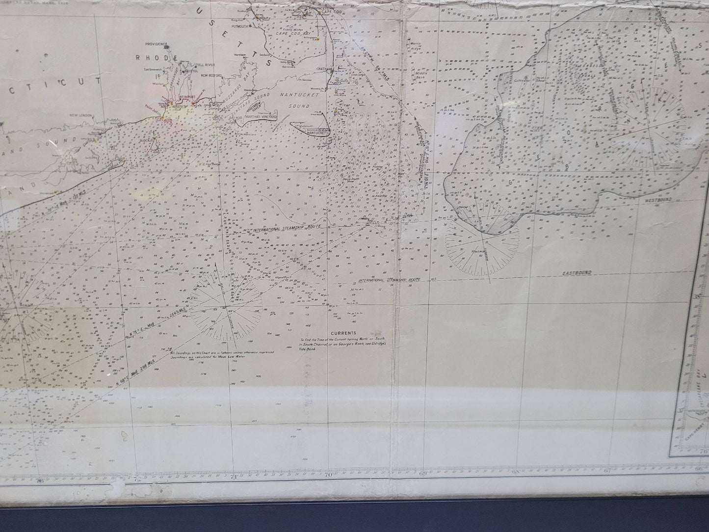 1920 nautical chart of the East Coast of the United States from Virginia to Maine, New Brunswick, and Nova Scotia. The chart shows Cape Cod, Long Island, the Connecticut coast, Jersey Shore, Maine, New Hampshire, etc. Very detailed, showing ports, lighthouses, shoals, depths, etc. The chart is by famous cartographer George W. Eldridge, compiled from surveys of the United States government, British Admiralty, George Eldridge, and others. First authorized by George Eldridge, published in 1916 by Wilfred O. White with a merchant's stamp of Charles Hutchinson, 154 State St., Boston.