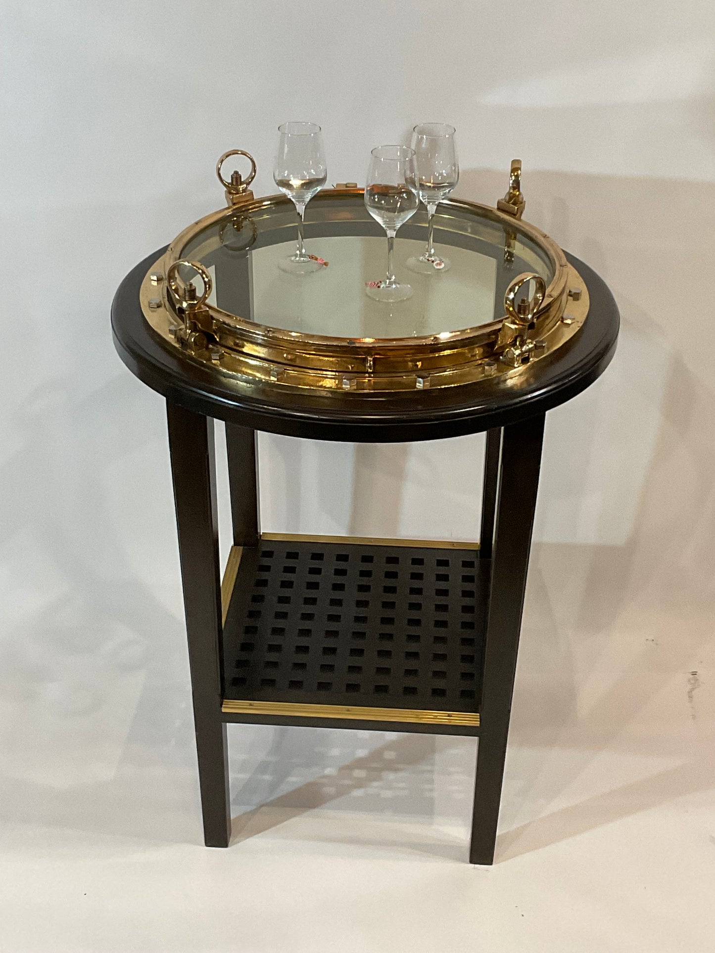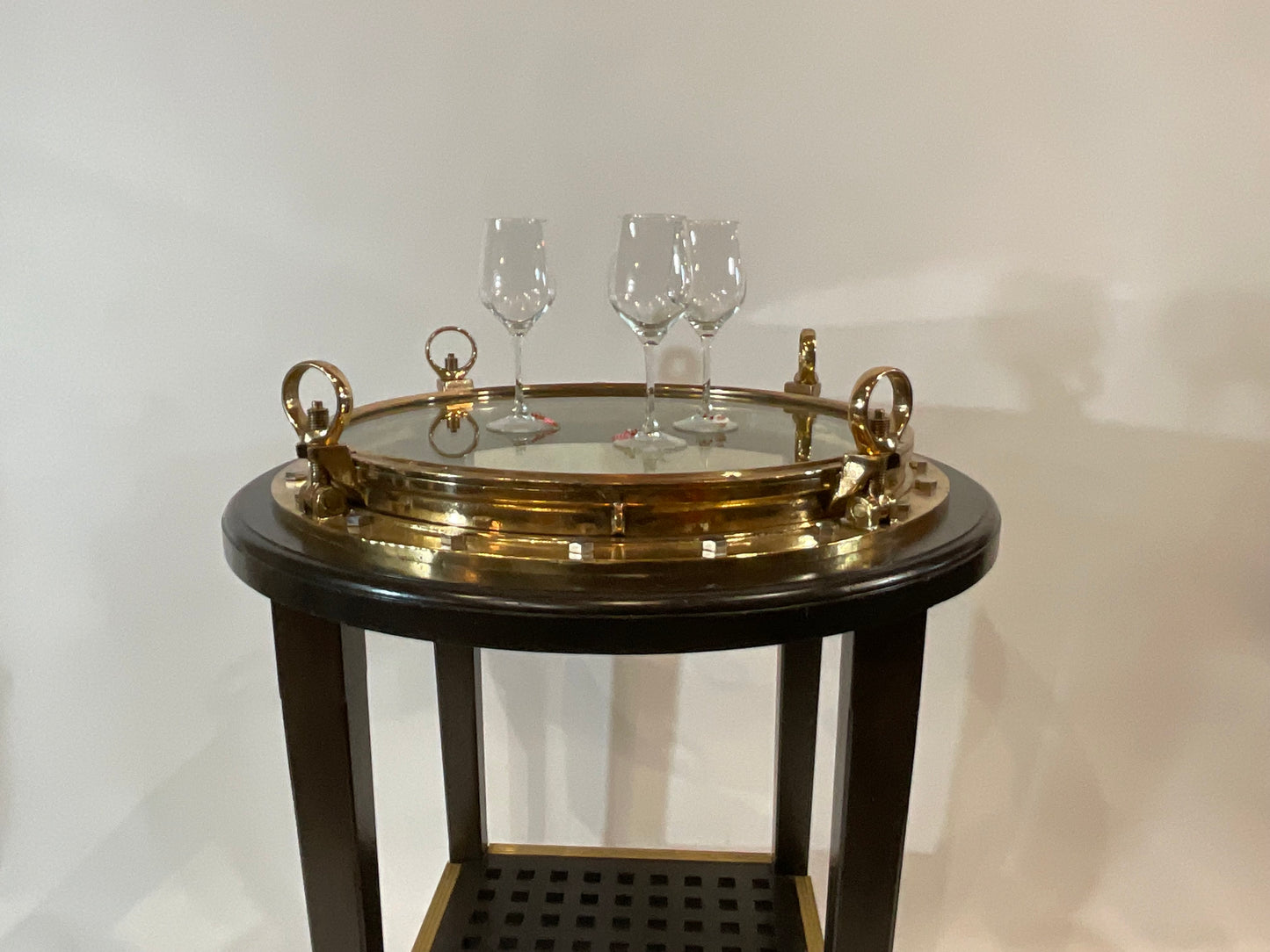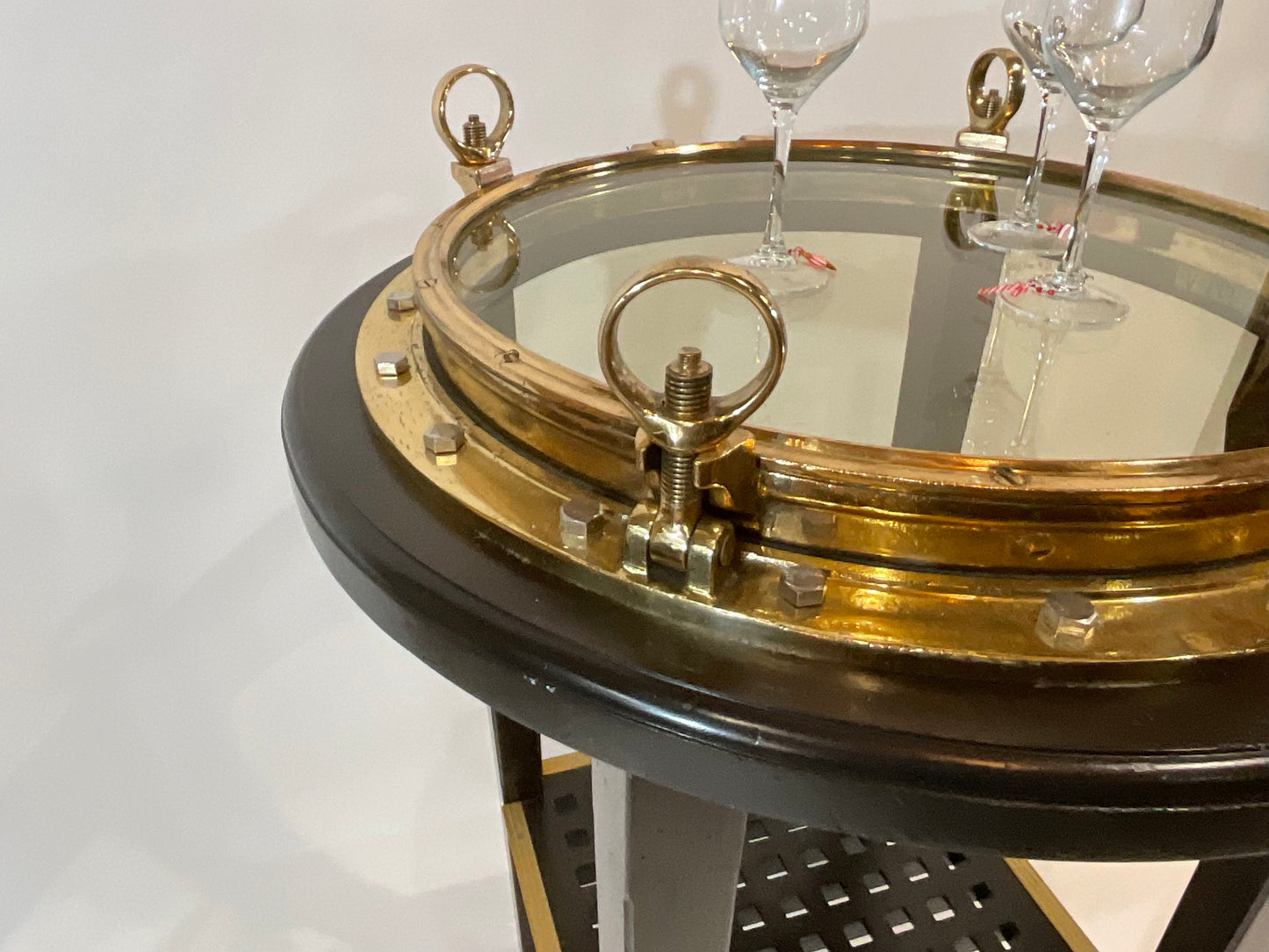 Fabulous bar height porthole table built with an absolutely massive ships porthole. Meticulously polished and lacquered. The porthole top is three feet in diameter. It is mounted into a mahogany table with a ships grating shelf below with brass foot trim. This can seat four. Porthole is as big as they come.
