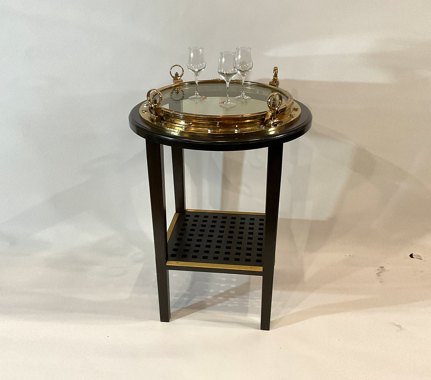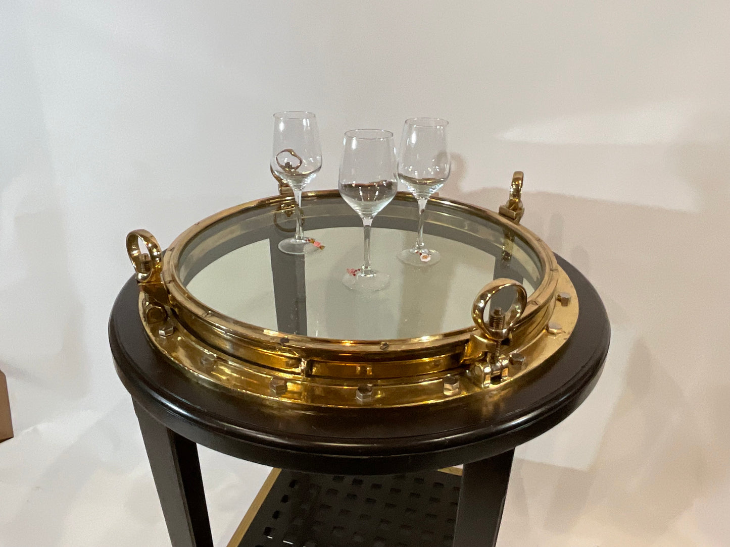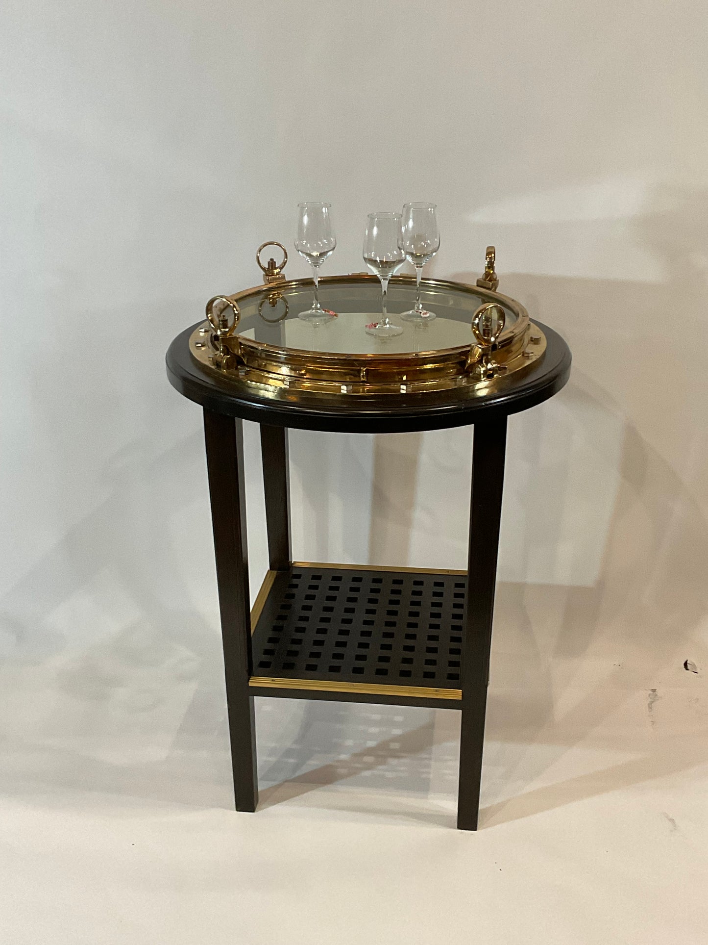 Fabulous bar height porthole table built with an absolutely massive ships porthole. Meticulously polished and lacquered. The porthole top is three feet in diameter. It is mounted into a mahogany table with a ships grating shelf below with brass foot trim. This can seat four. Porthole is as big as they come.