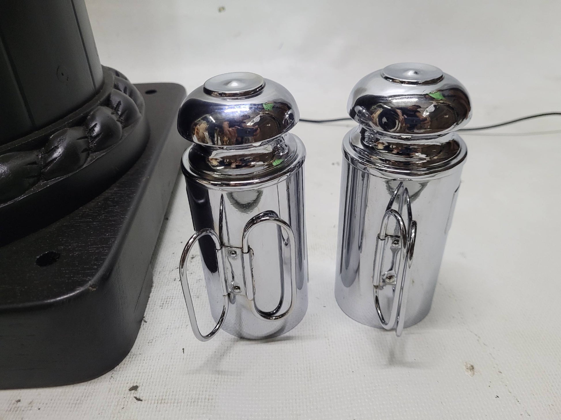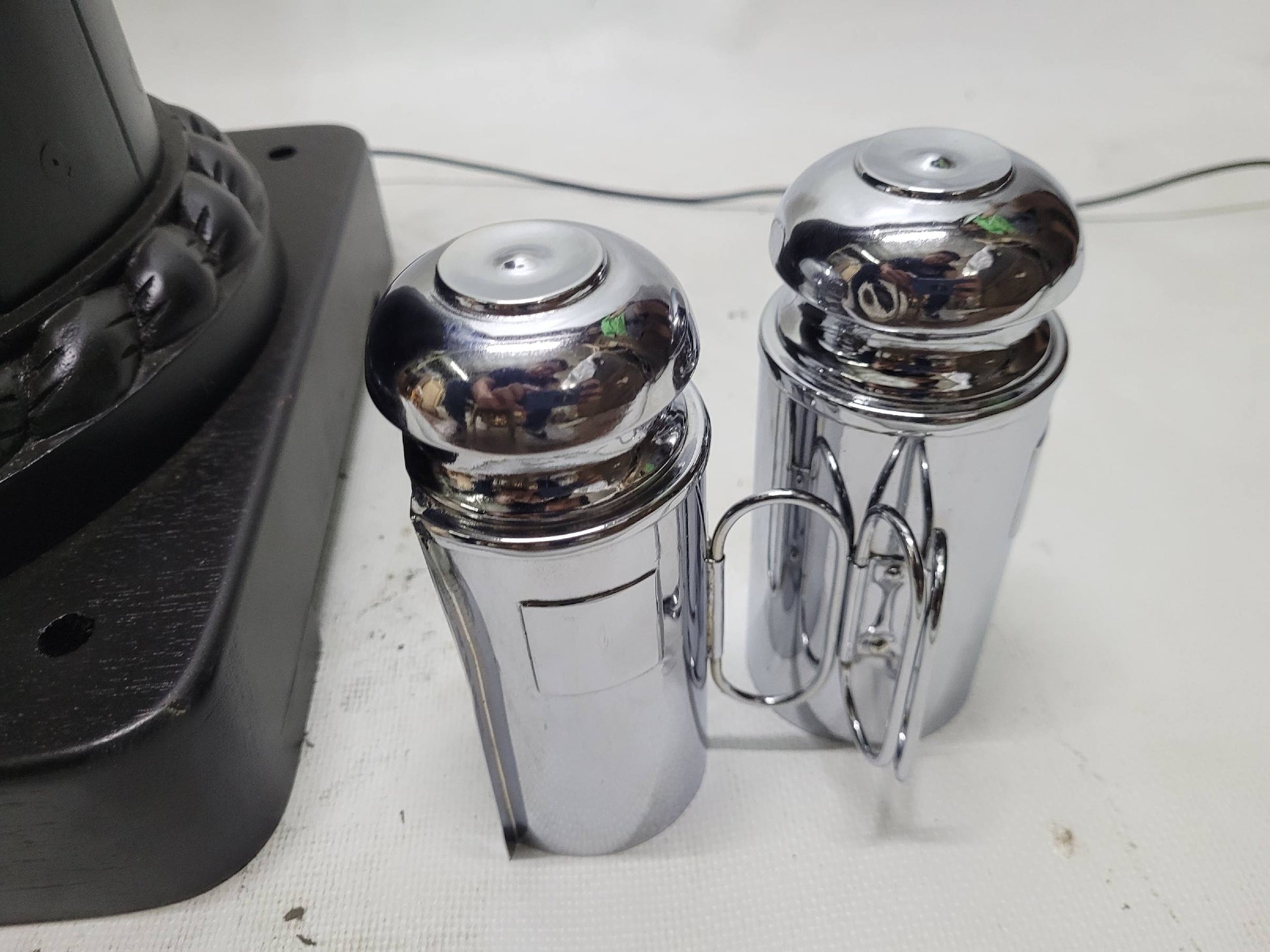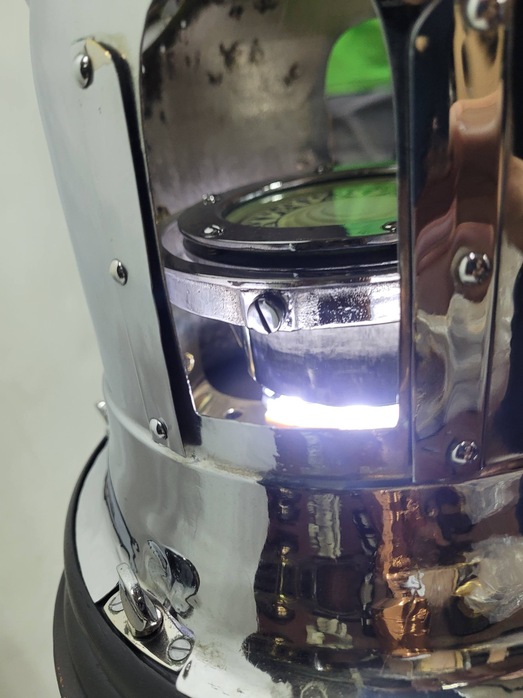 Boat binnacle with chrome finish, gimballed compass, twin lamp burners, and wood base with carved rope moulding. Fitted with a Japanese compass.