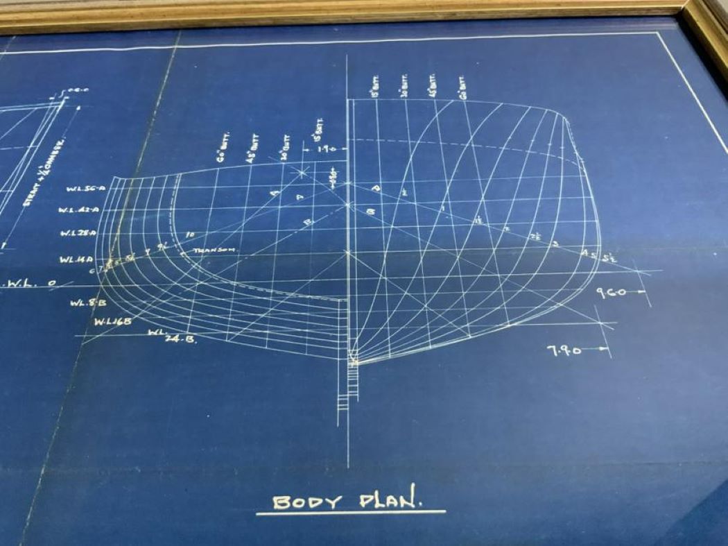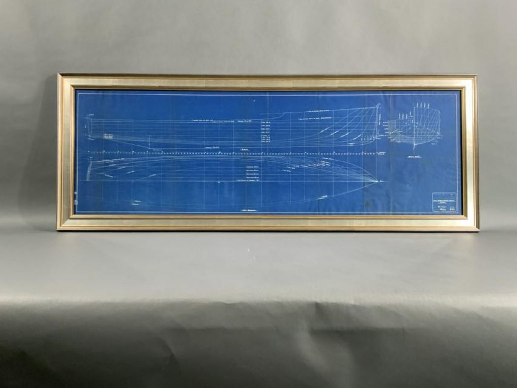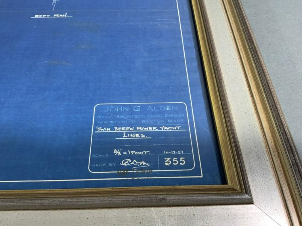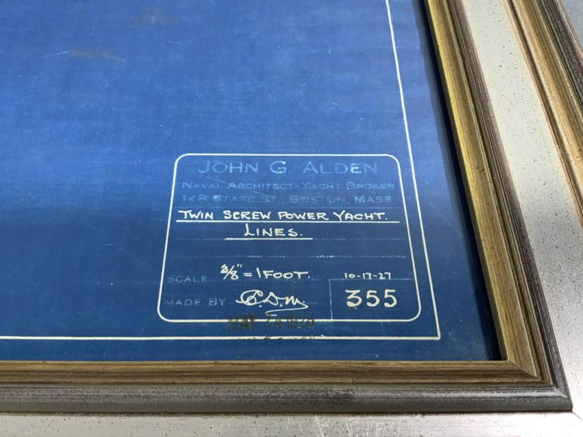 Alden blueprint of Motor Yacht Gypsy which was a 101 foot yacht built in 1927. This is a hull lines drawing of this plum bow vessel. Weight is 16 pounds. 20" H x 53" L .
