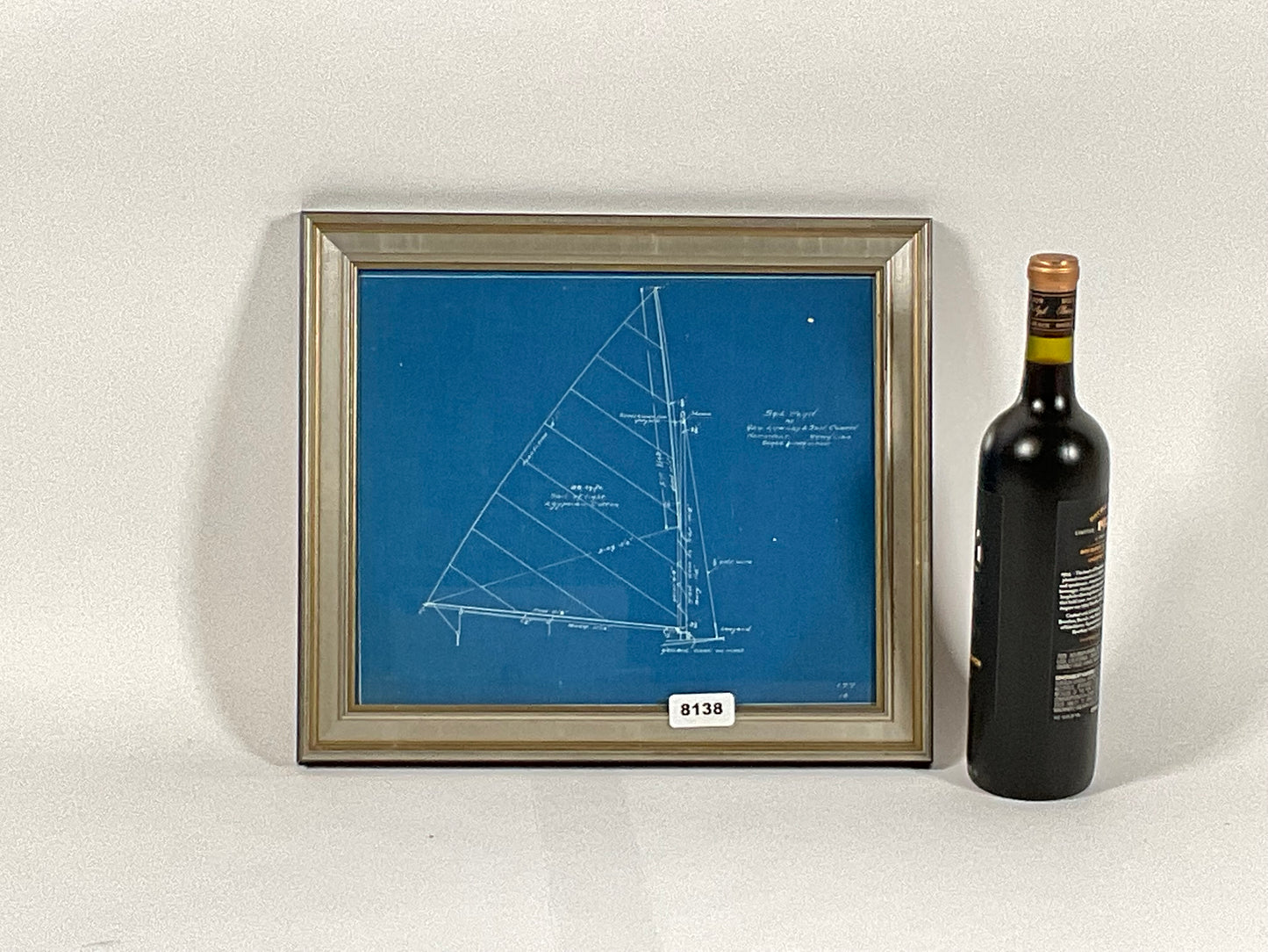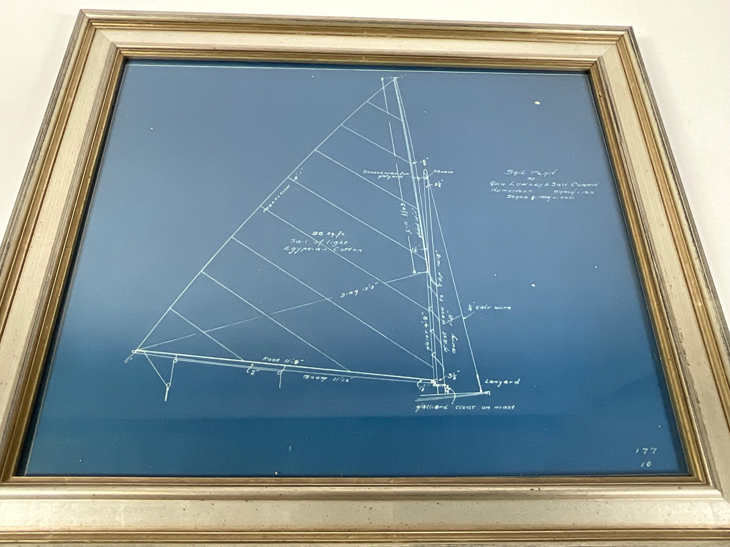 Sail plan for a sailing tender from the George Lawley and Son Corporation, Neponset Mass. dated March 1, 1913, scale ½ inch equals one foot. Plan shows sail, mast, and spars along with dimensions. The sail is shown as 96 square feet.