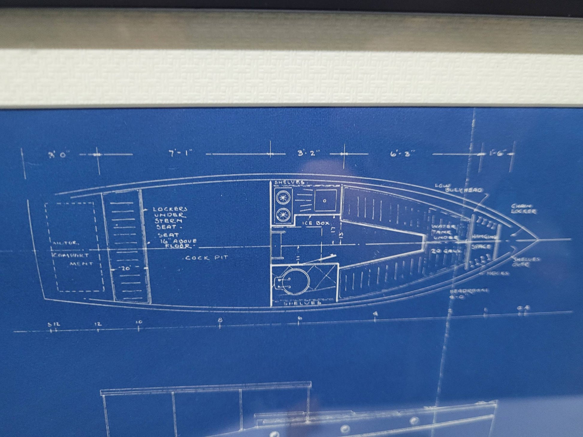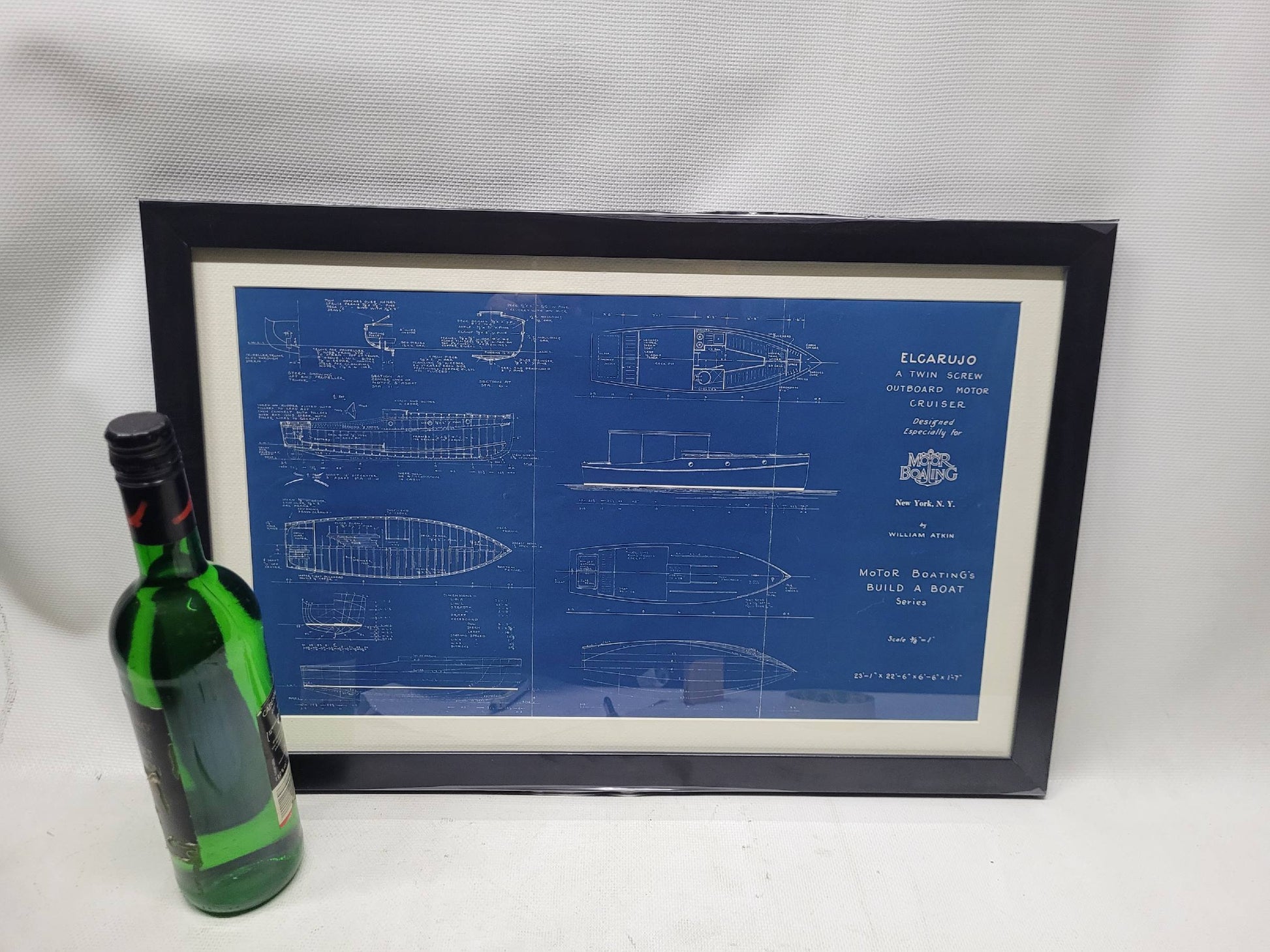 Boat blueprint from Motor Boating's build a boat series. This blueprint shows a William Atkin design of the "Elcarujo, a twin-screw outboard motor cruiser." Atkin designed more than 700 boats. Lloyd’s Register of Yachts once stated he designed more boats than any other marine architect. His range was from dinghies and small craft to a 108-foot commuter yacht. The plan is matted in white and fitted to a black frame.