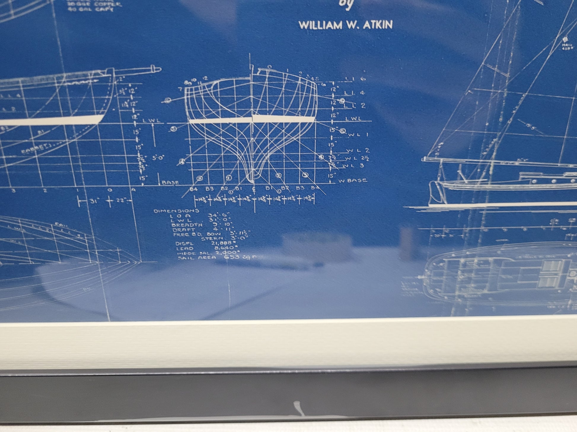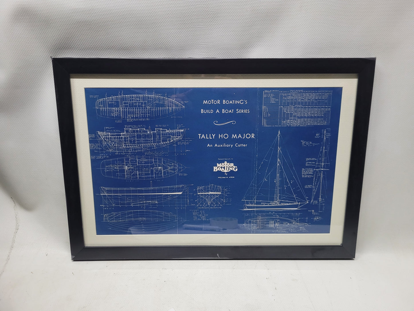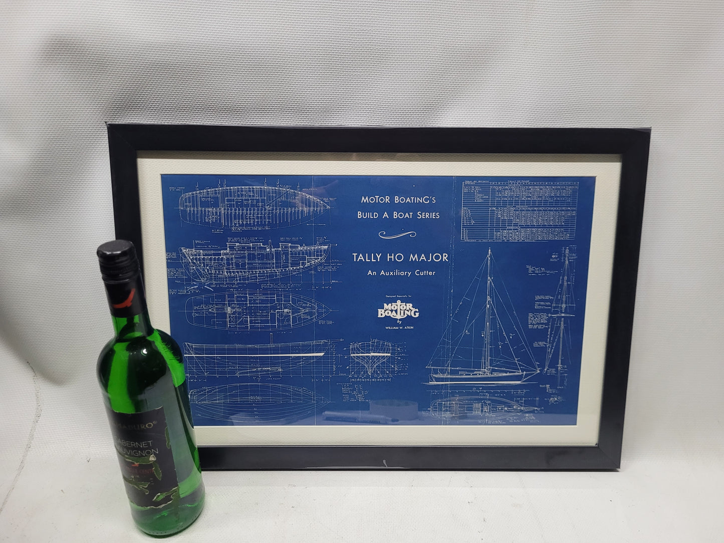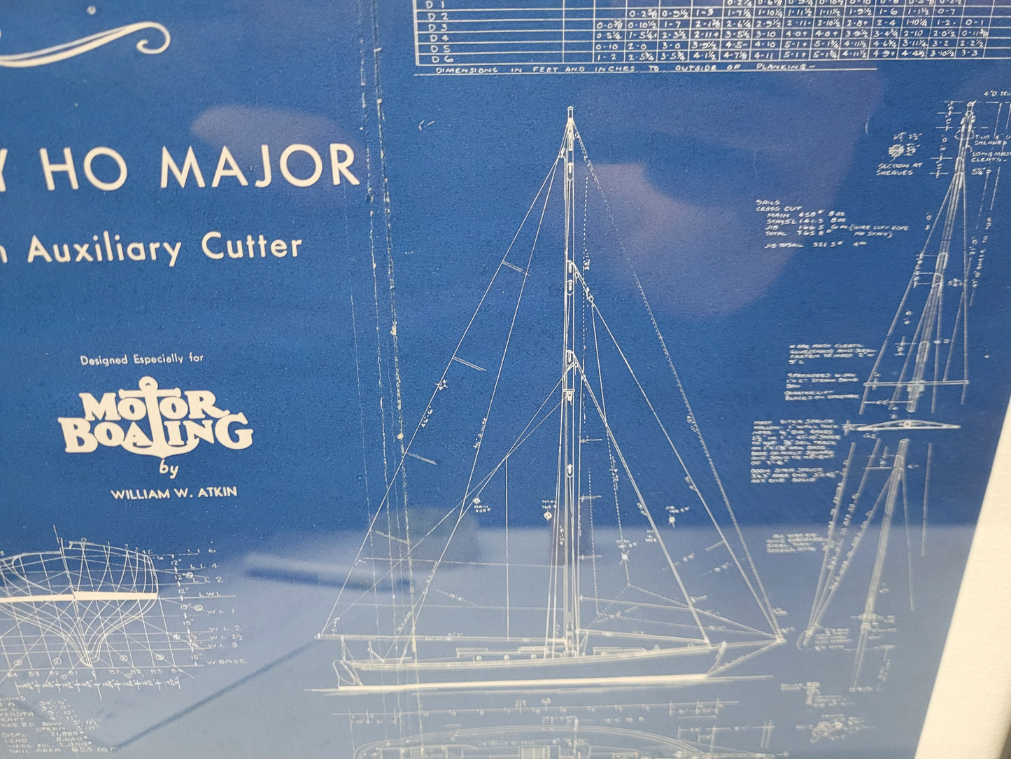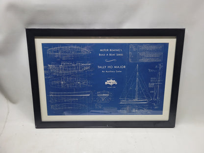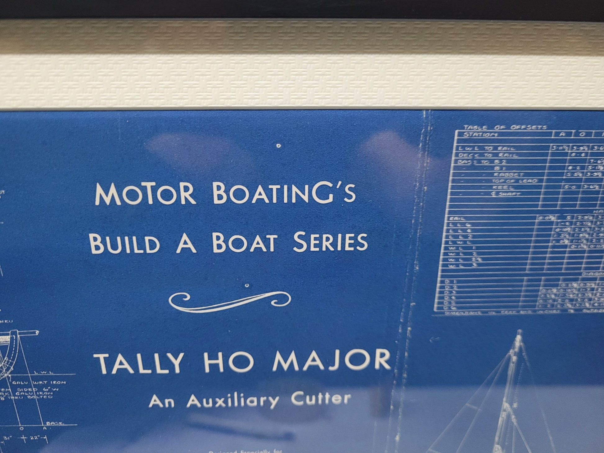 Boat blueprint from Motor Boating's Build a Boat series. This blueprint shows a William Atkin design of the auxiliary cutter "Tally Ho Major." Atkin designed more than 700 boats. Lloyd's Register of Yachts once said he designed more boats than any other marine architect. His range was from dinghies and small crafts to a 108 foot commuter yacht. This design shows an auxiliary cutter in great detail with lines, profile, sail plan, and deck plan. The plan is matted in white and fitted to a black frame. Circa 1930s. 15"H x 22"W