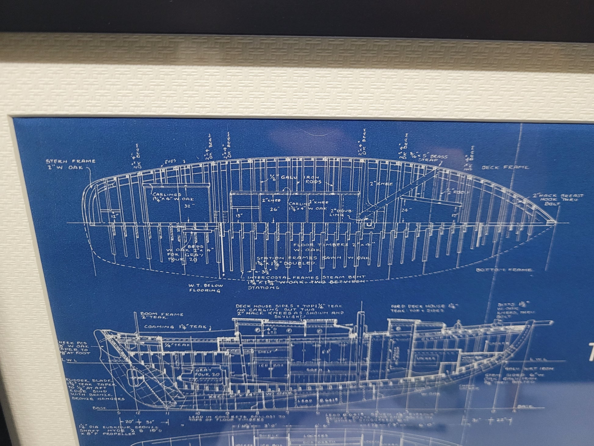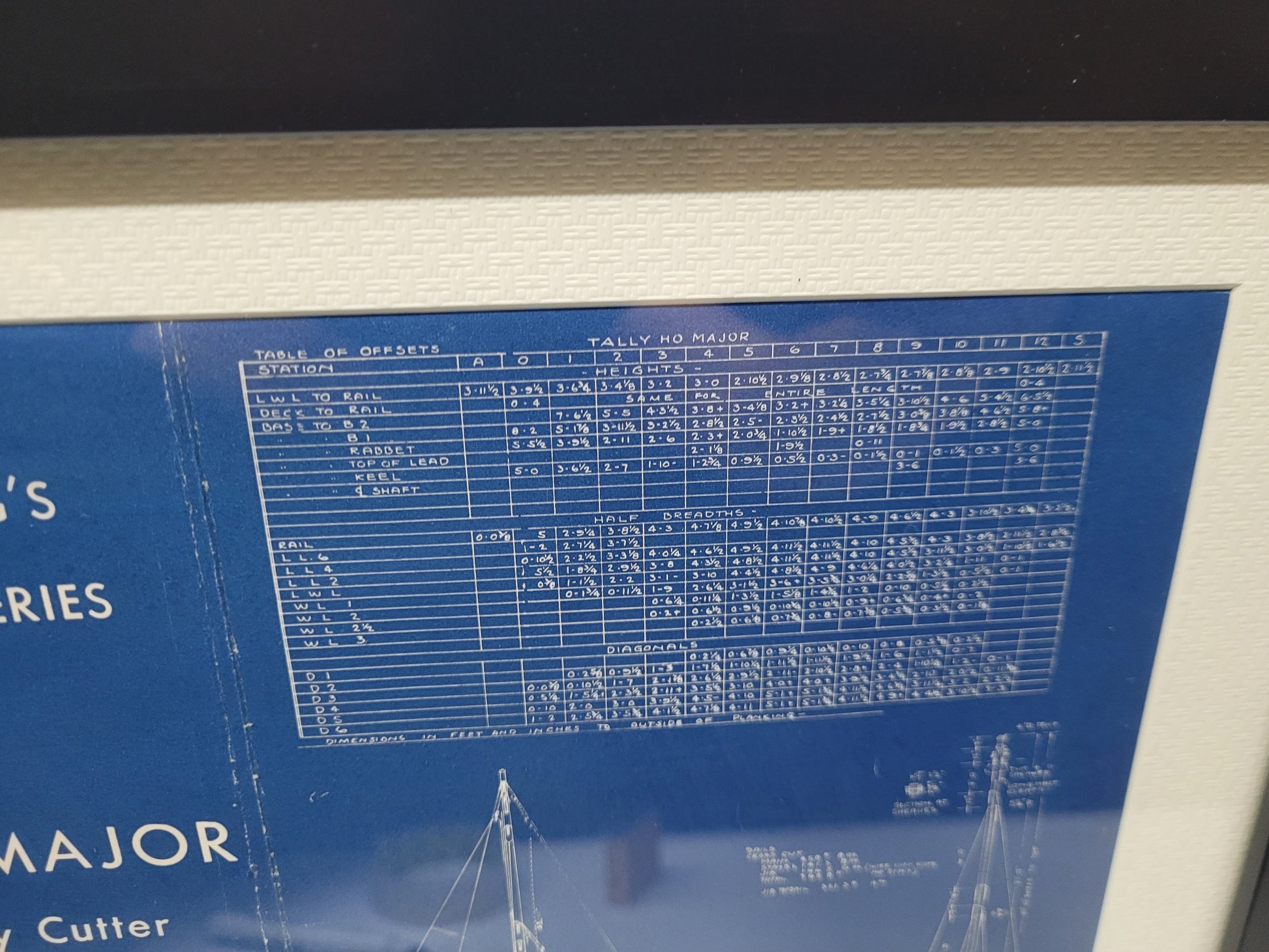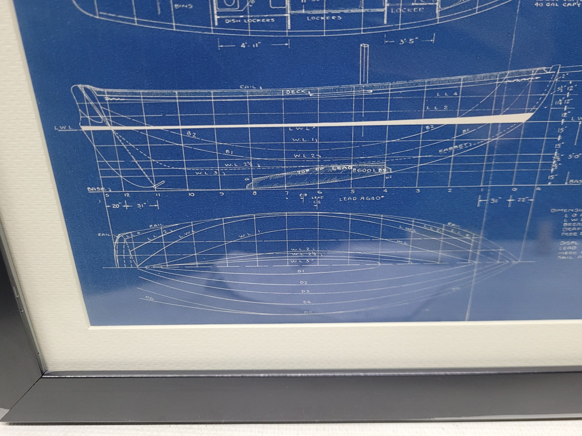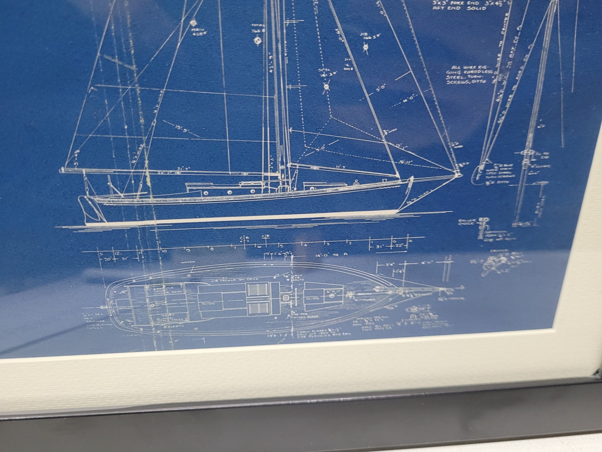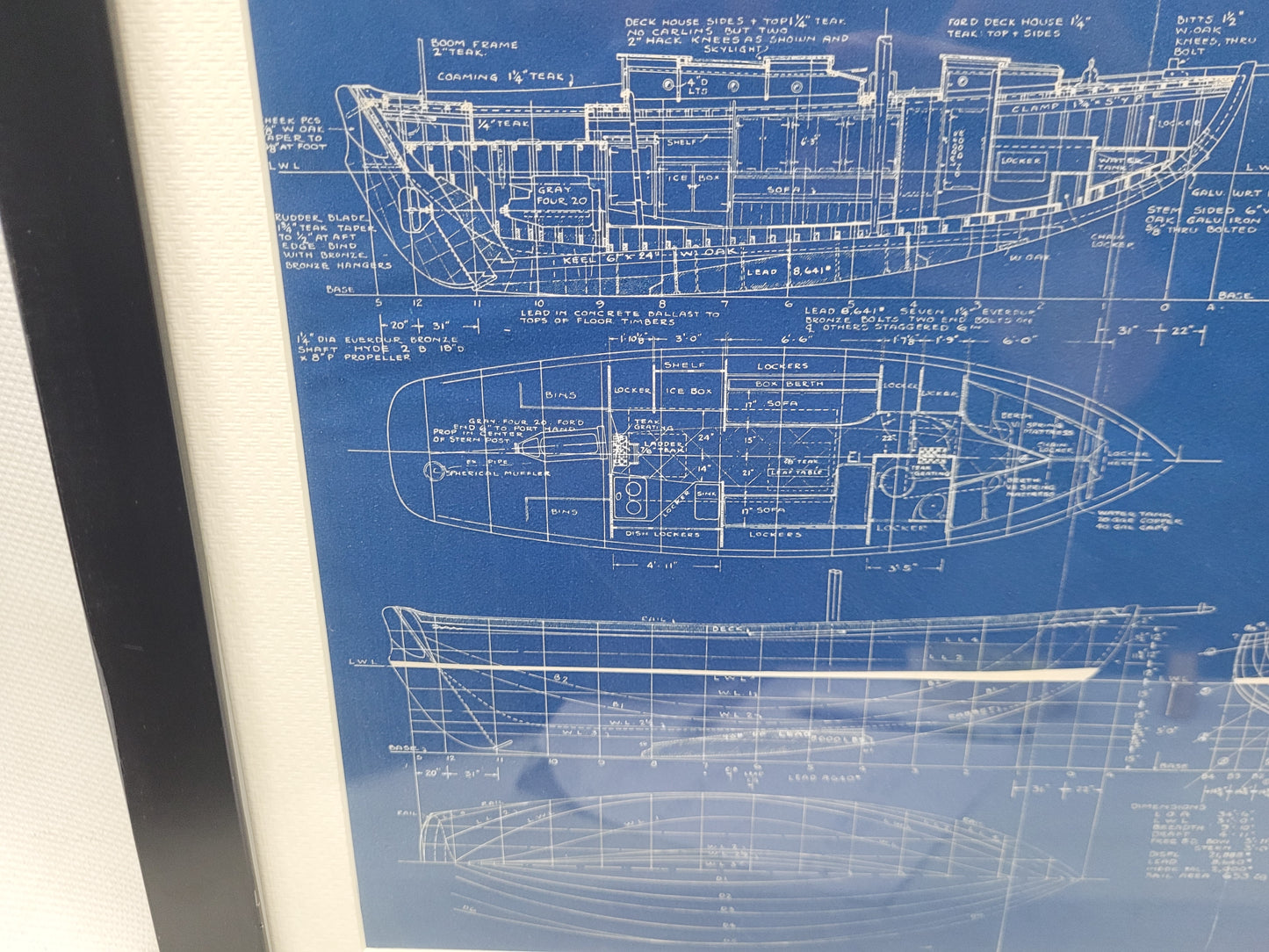 Boat blueprint from Motor Boating's Build a Boat series. This blueprint shows a William Atkin design of the auxiliary cutter "Tally Ho Major." Atkin designed more than 700 boats. Lloyd's Register of Yachts once said he designed more boats than any other marine architect. His range was from dinghies and small crafts to a 108 foot commuter yacht. This design shows an auxiliary cutter in great detail with lines, profile, sail plan, and deck plan. The plan is matted in white and fitted to a black frame. Circa 1930s. 15"H x 22"W