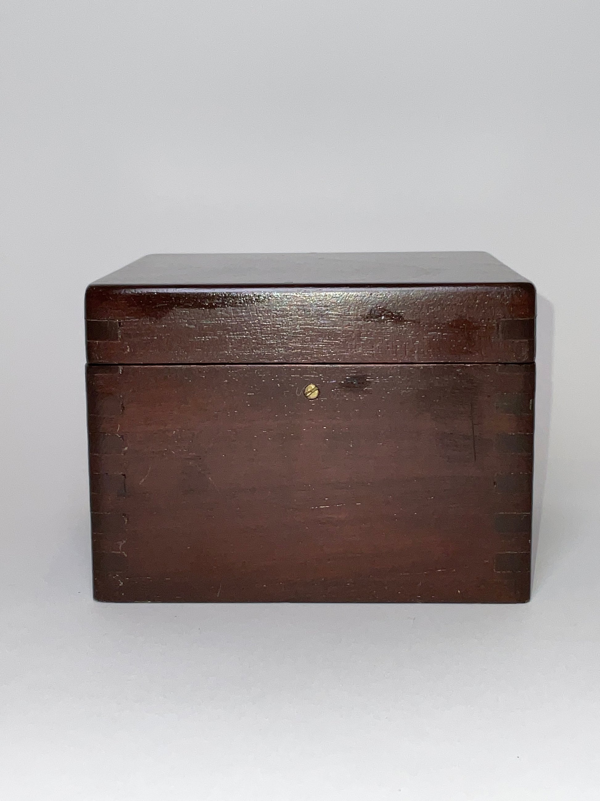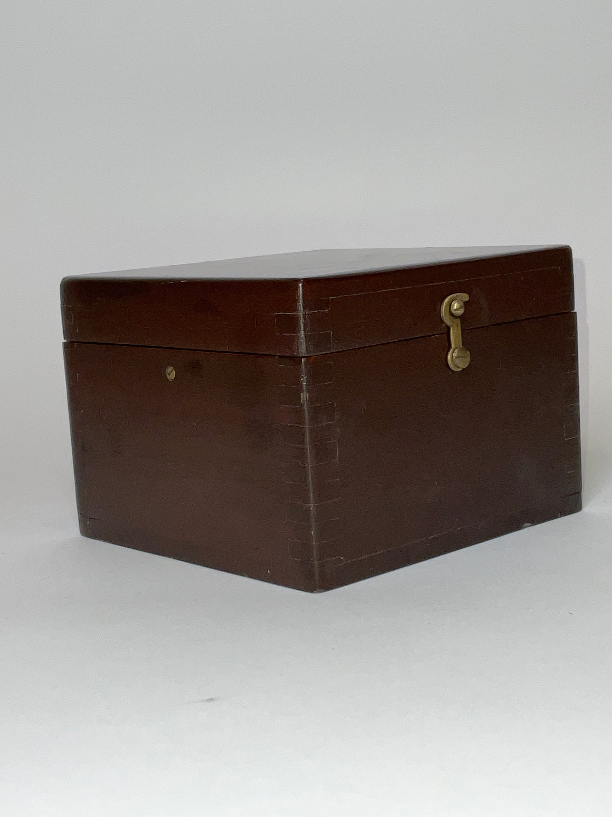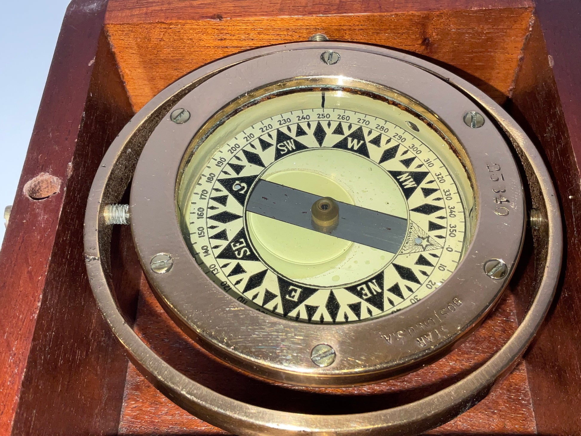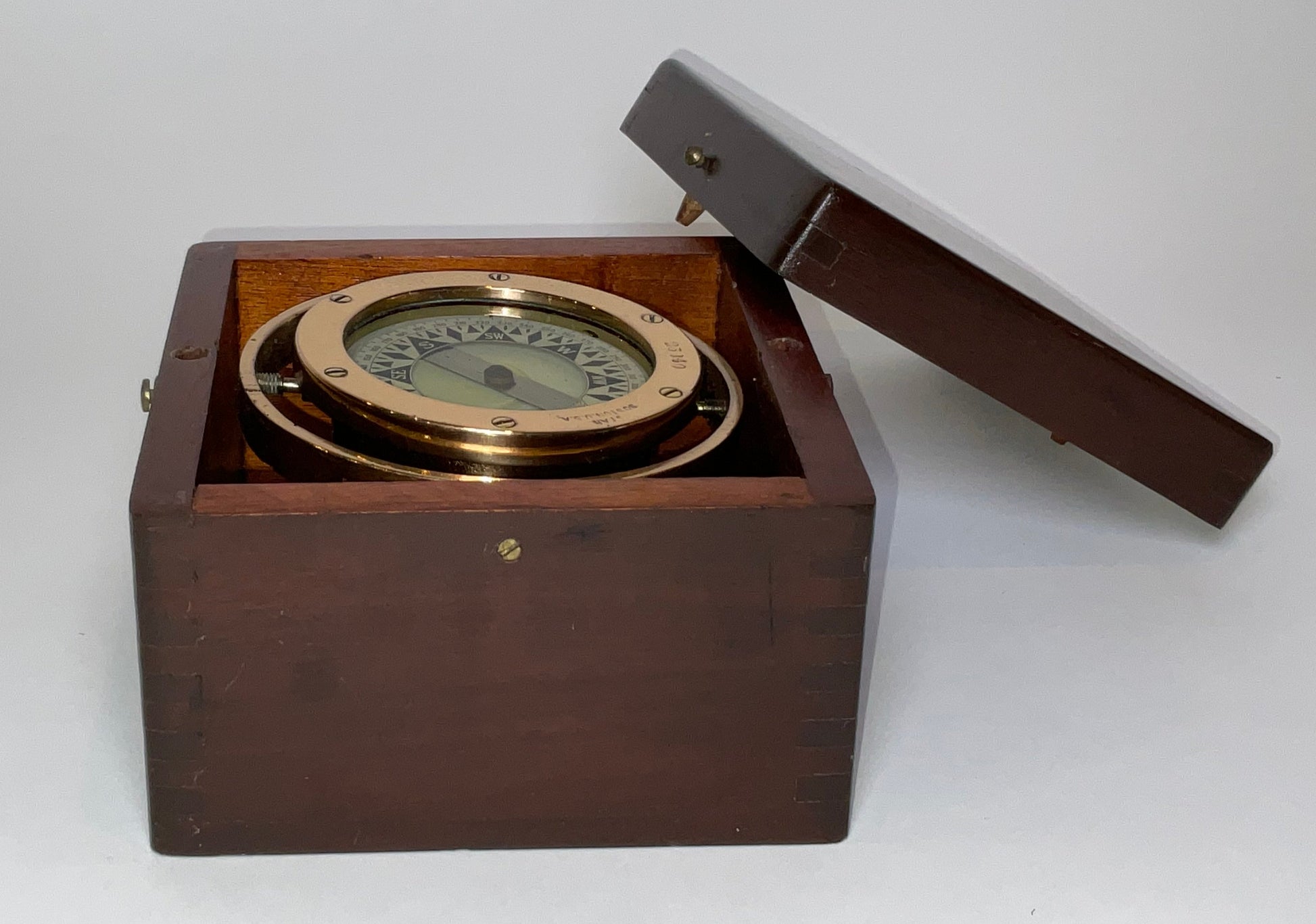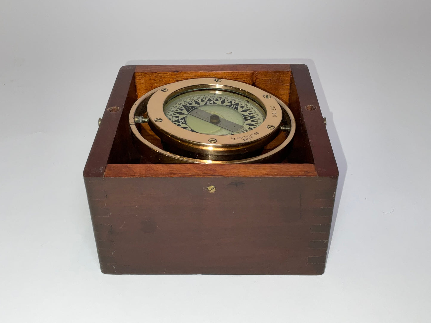 Solid brass gimbaled boat compass that has been meticulously polished and lacquered and fitted to a varnished mahogany box with a lid. The lid has two brass hooks. The compass is by Star, Boston, U.S.A., and the bezel is engraved with serial number 25340.