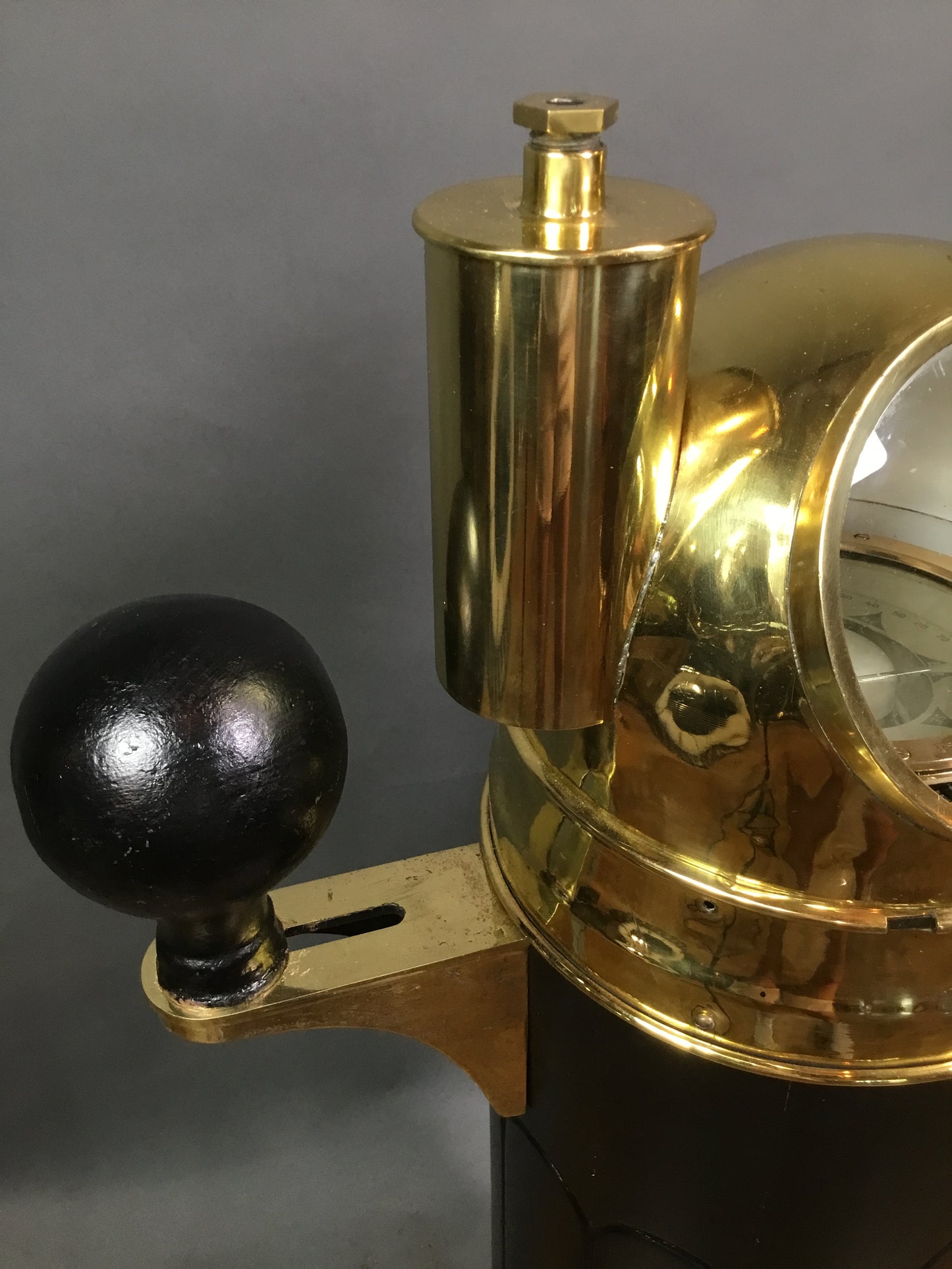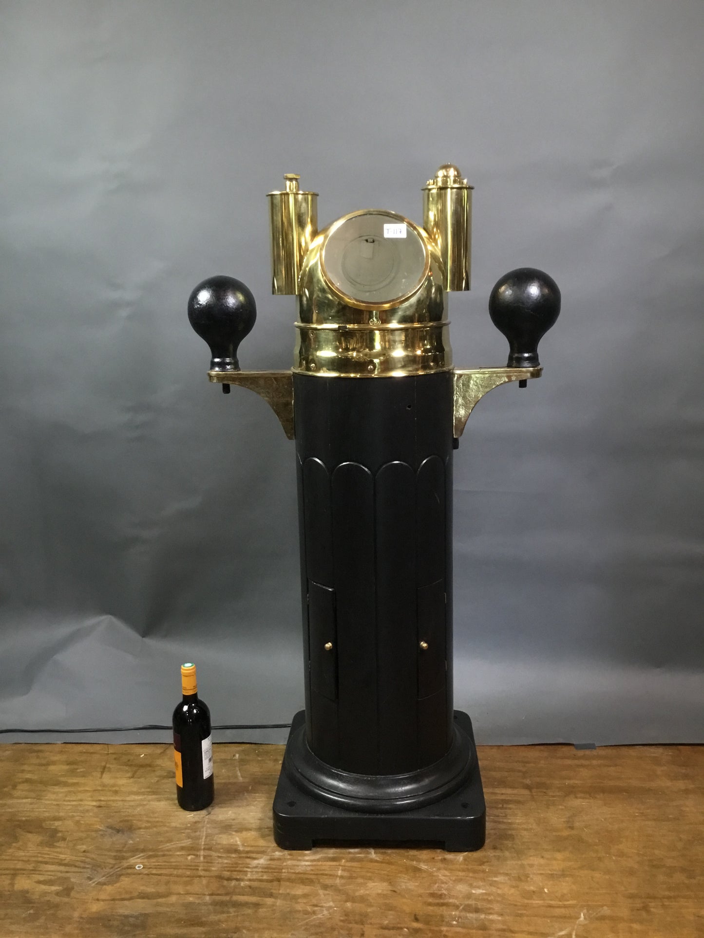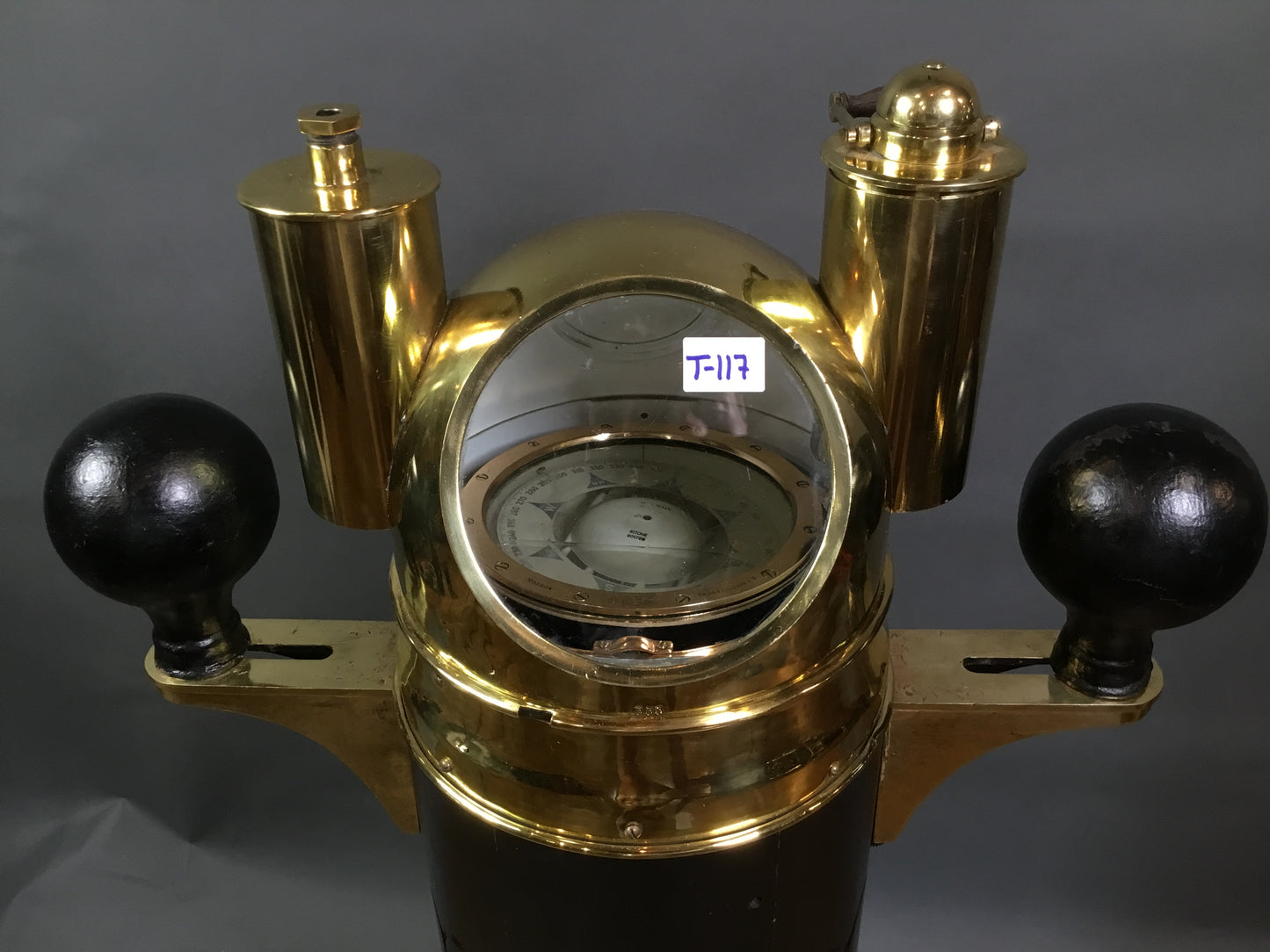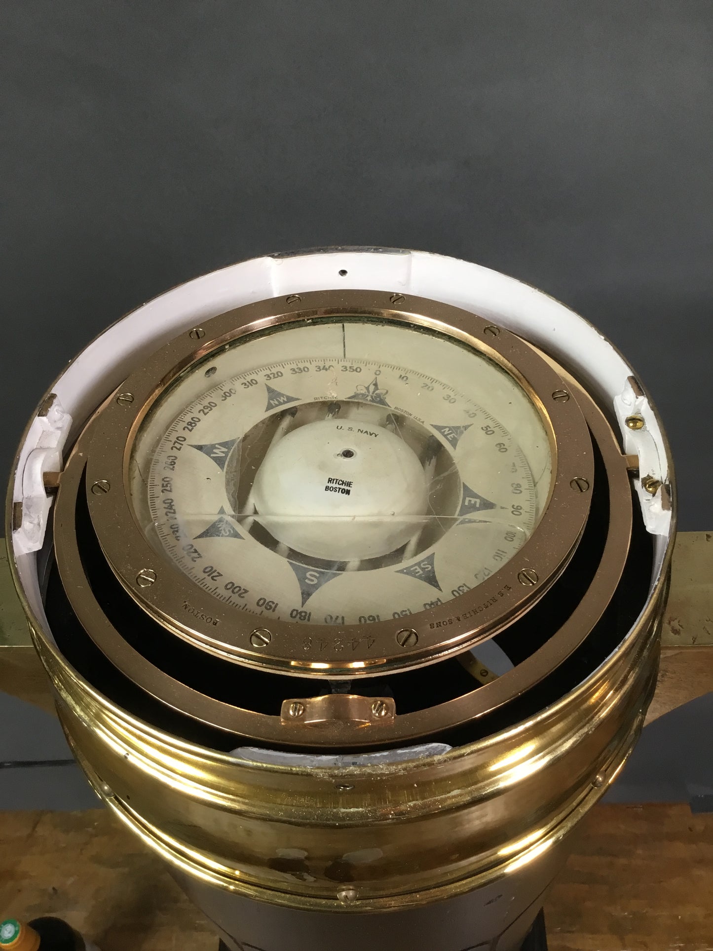 Highly polished ships binnacle with gimballed compass. The base is nicely stained and varnished. Meticulously polished and lacquered. Compass by Ritchie of Boston. Iron compensating balls are mounted to brass brackets. Circa 1930. Unusual design. Dimensions: 49" H x 28" W by 16" D.