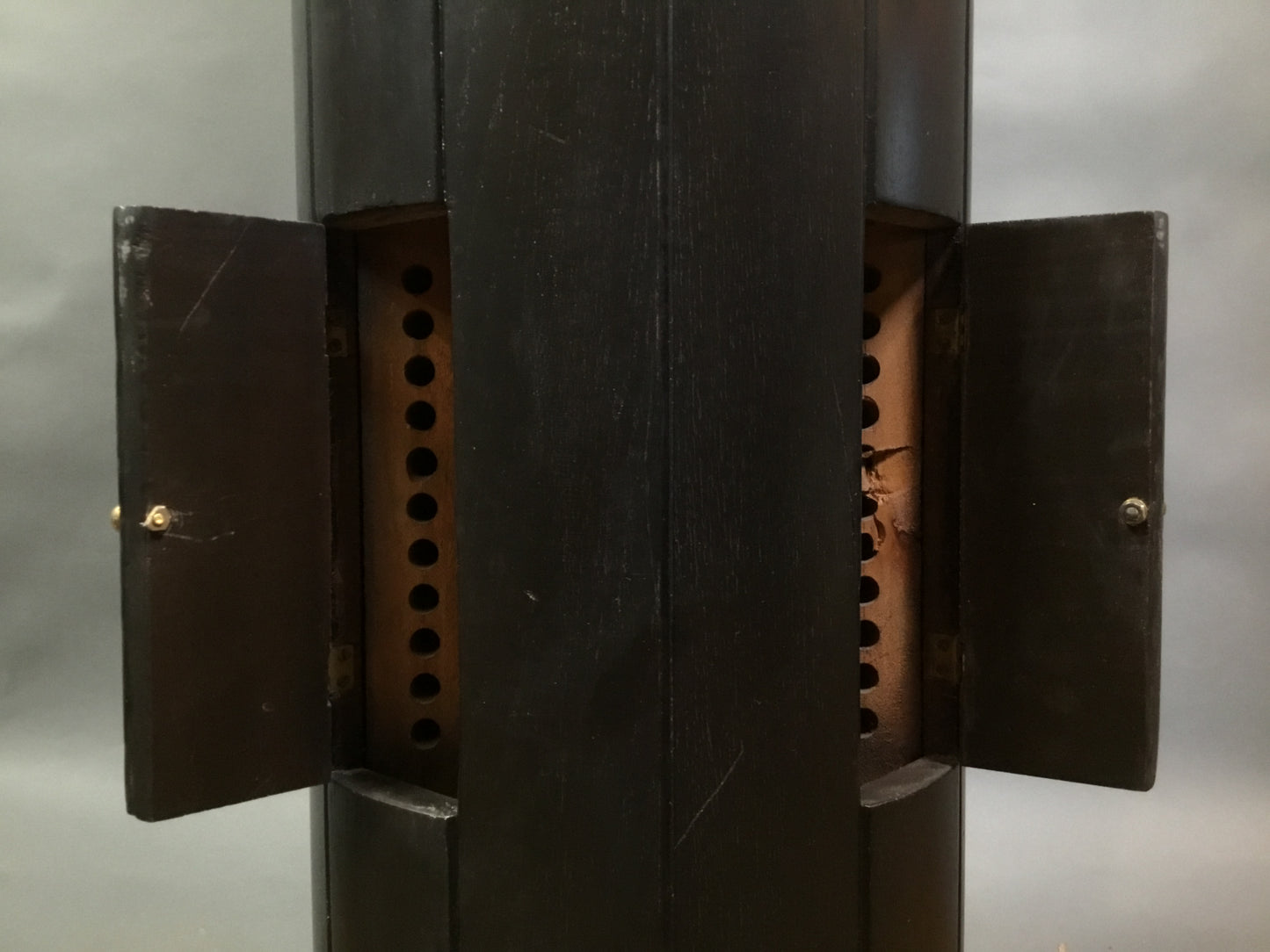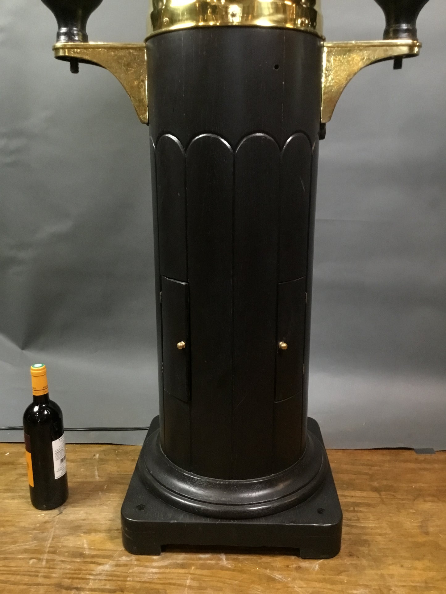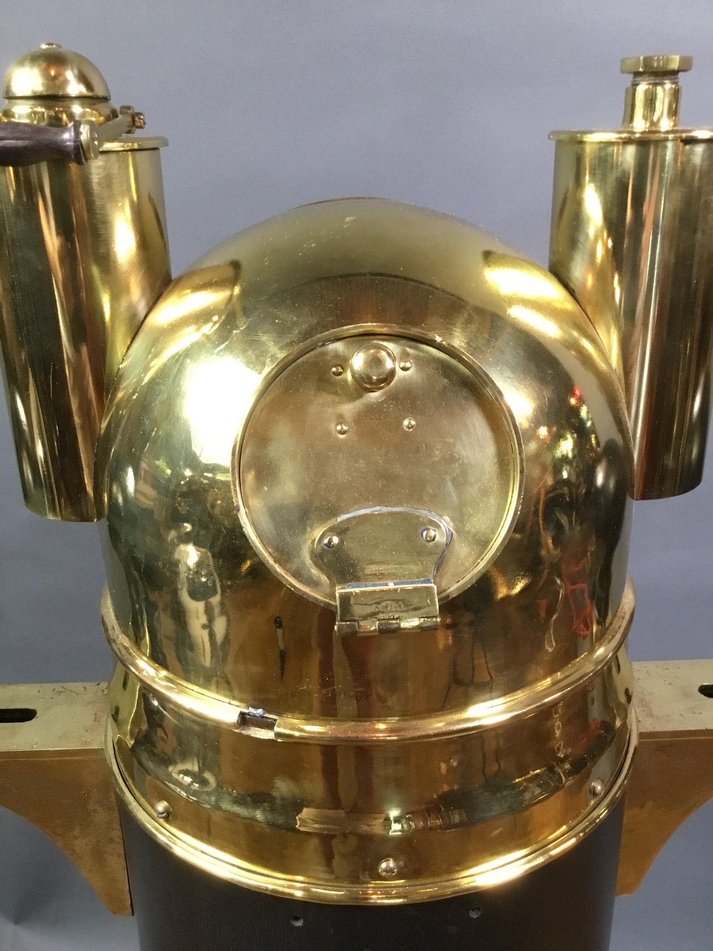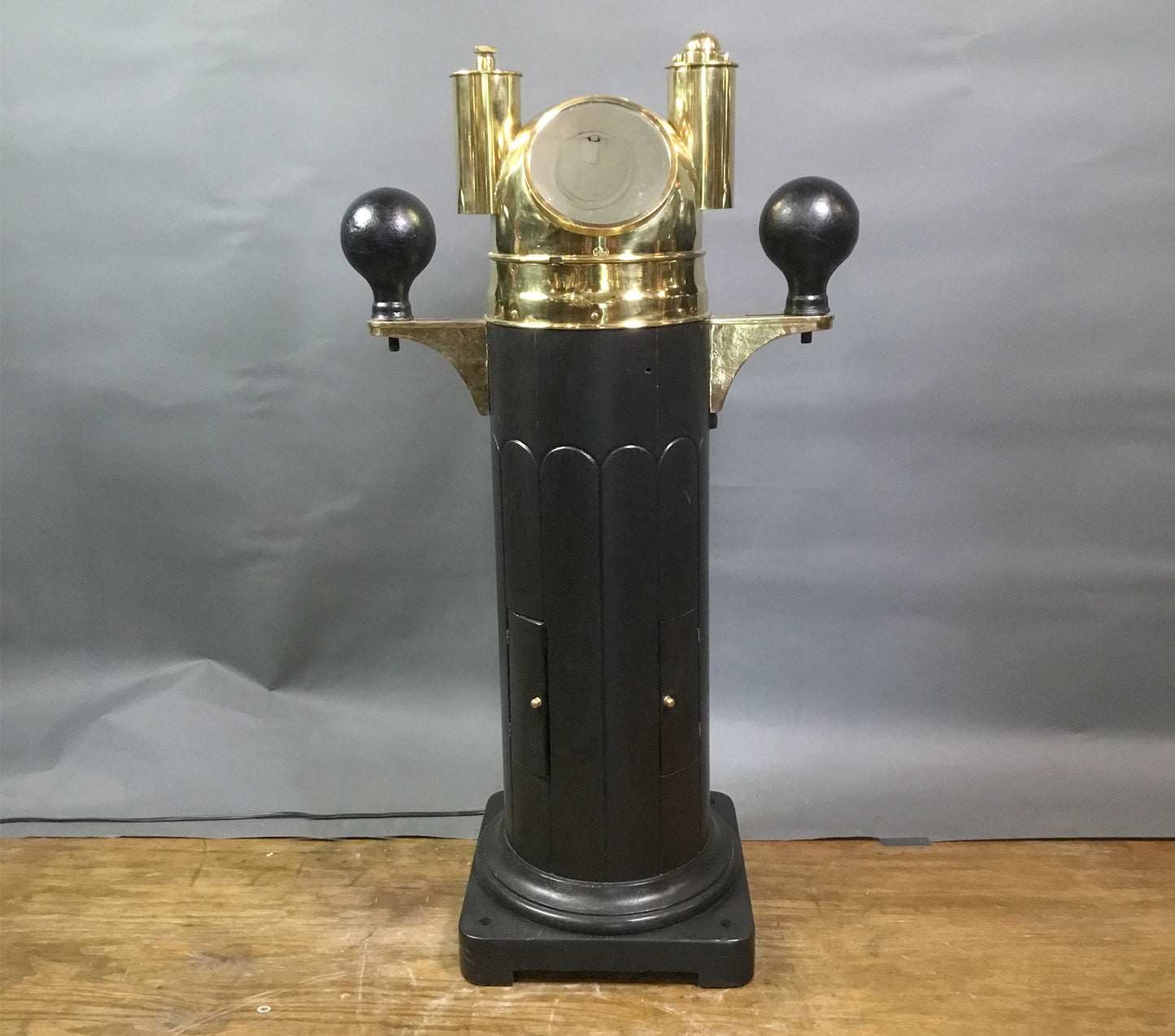 Highly polished ships binnacle with gimballed compass. The base is nicely stained and varnished. Meticulously polished and lacquered. Compass by Ritchie of Boston. Iron compensating balls are mounted to brass brackets. Circa 1930. Unusual design. Dimensions: 49" H x 28" W by 16" D.