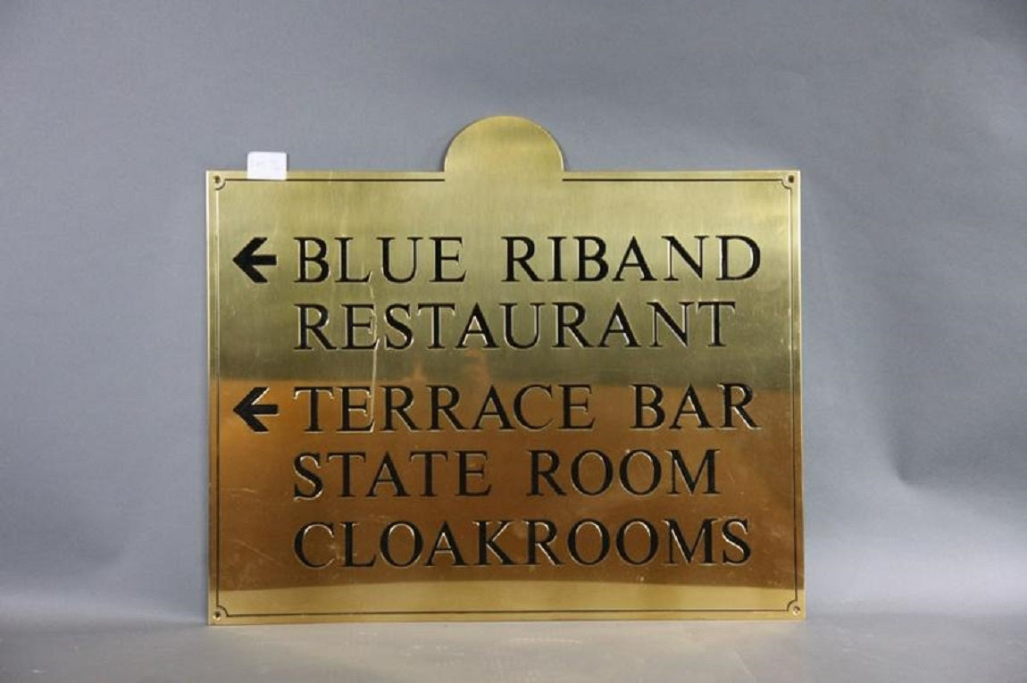 Brass with enamel filled letters trade sign with BLUE RIBAND RESTAURANT and TERRACE BAR, STATE ROOM, AND CLOAKROOM. Possibly from an ocean liner.