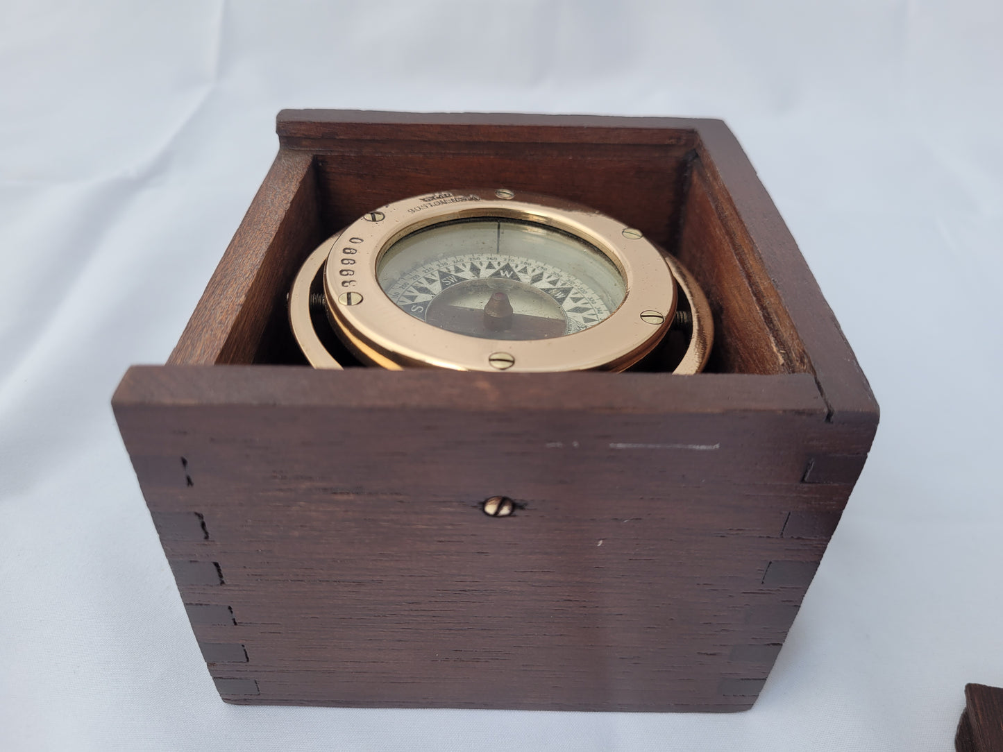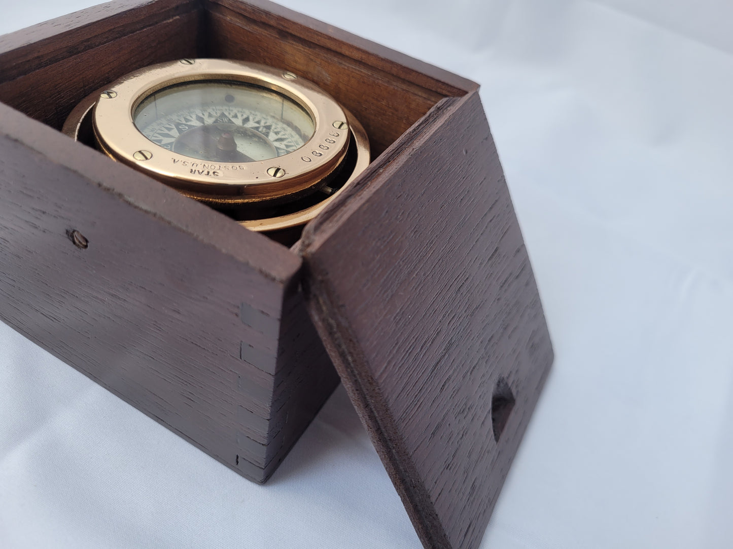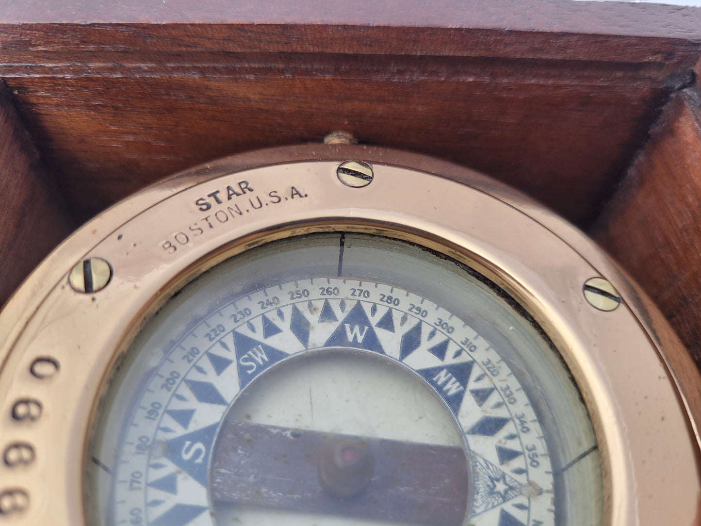 Classic early twentieth century boat compass by Star Compass of Boston. The gimballed yacht compass has been meticulously polished and lacquered. This classic marine instrument is fitted to its original hardwood box with a fine varnished finish. The box has a sliding lid. This choice nautical relic is one of a group of compasses we have listed. They are perfect gifts and awesome decorator pieces for home or office.