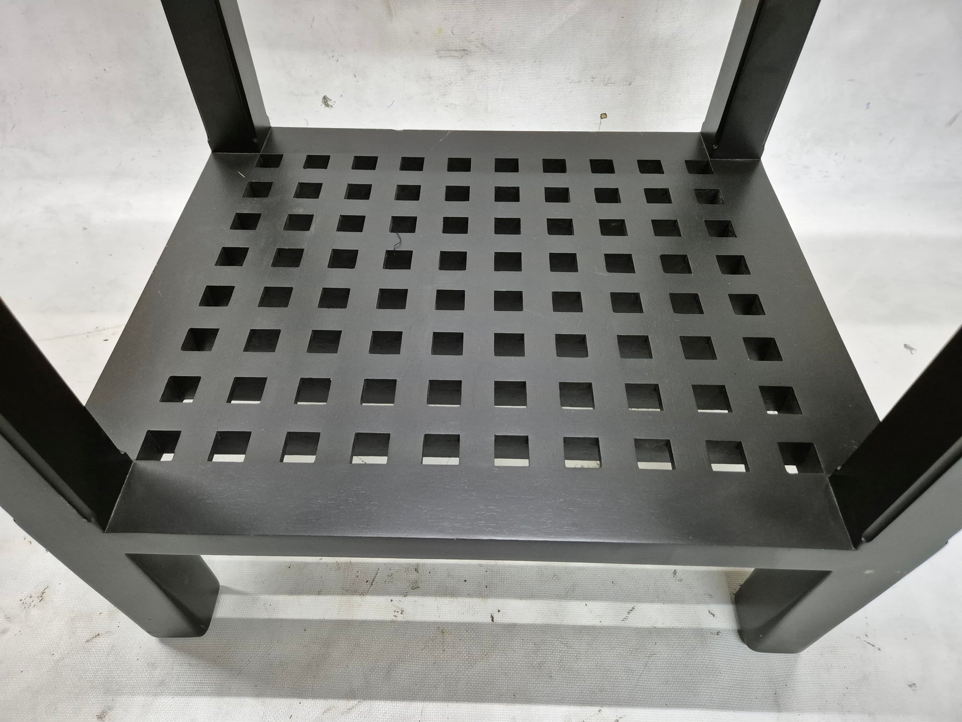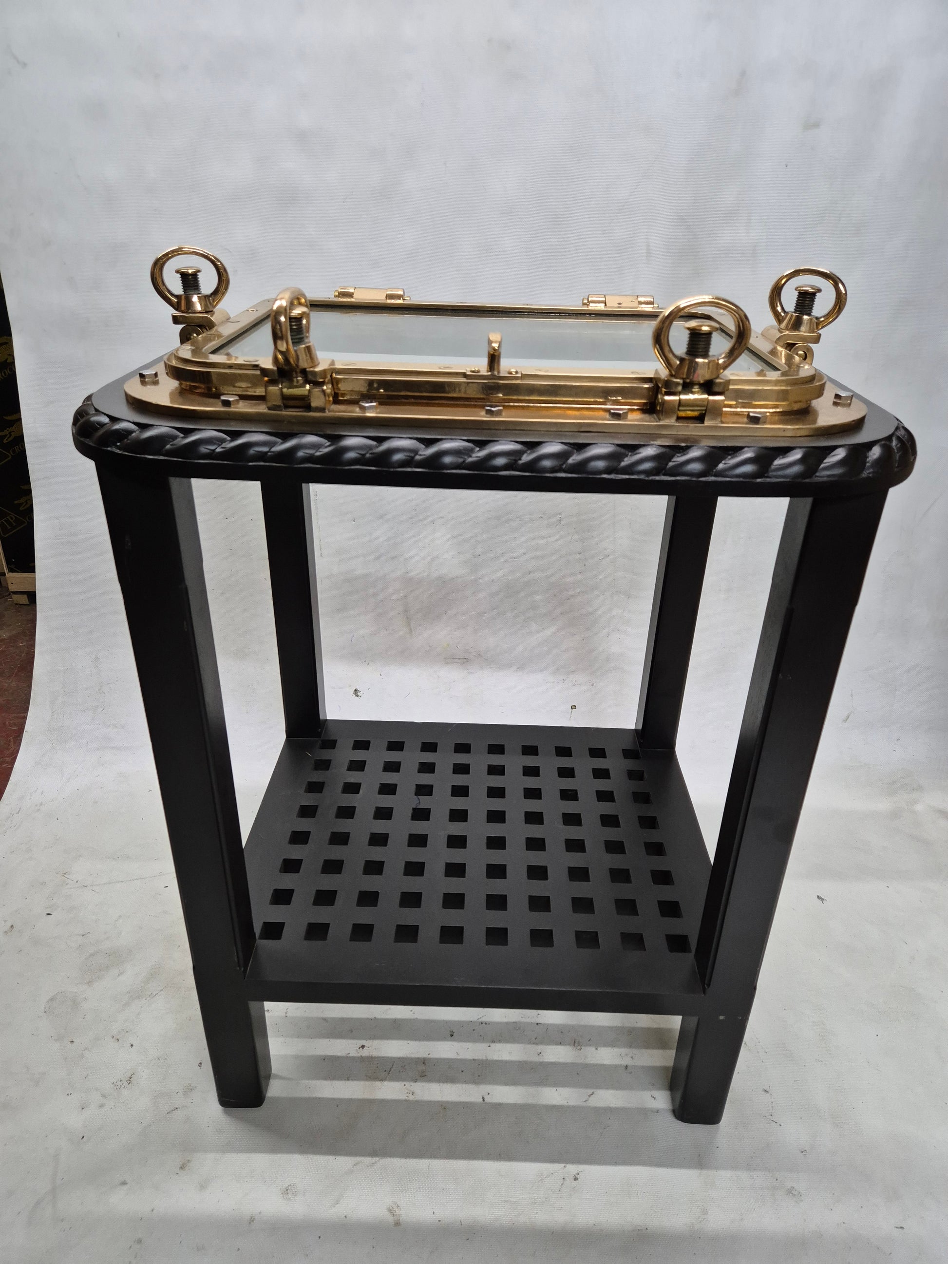 Bistro height solid brass ship's porthole mounted to a wood table base with rope carved border and ship's grating shelf. Porthole has been highly polished and lacquered. Really nice piece of maritime décor.