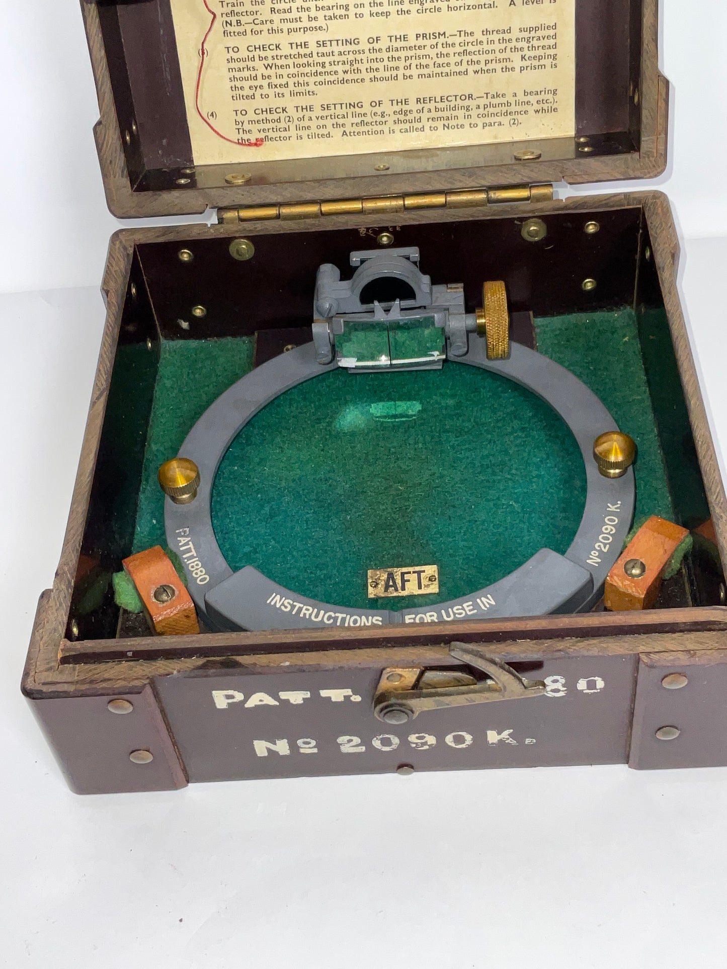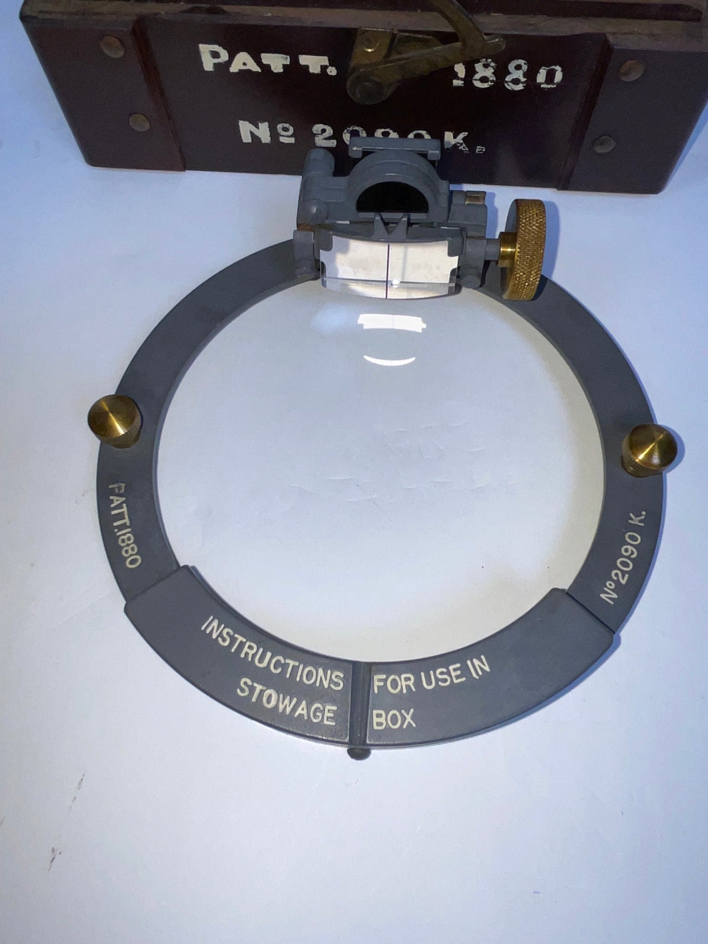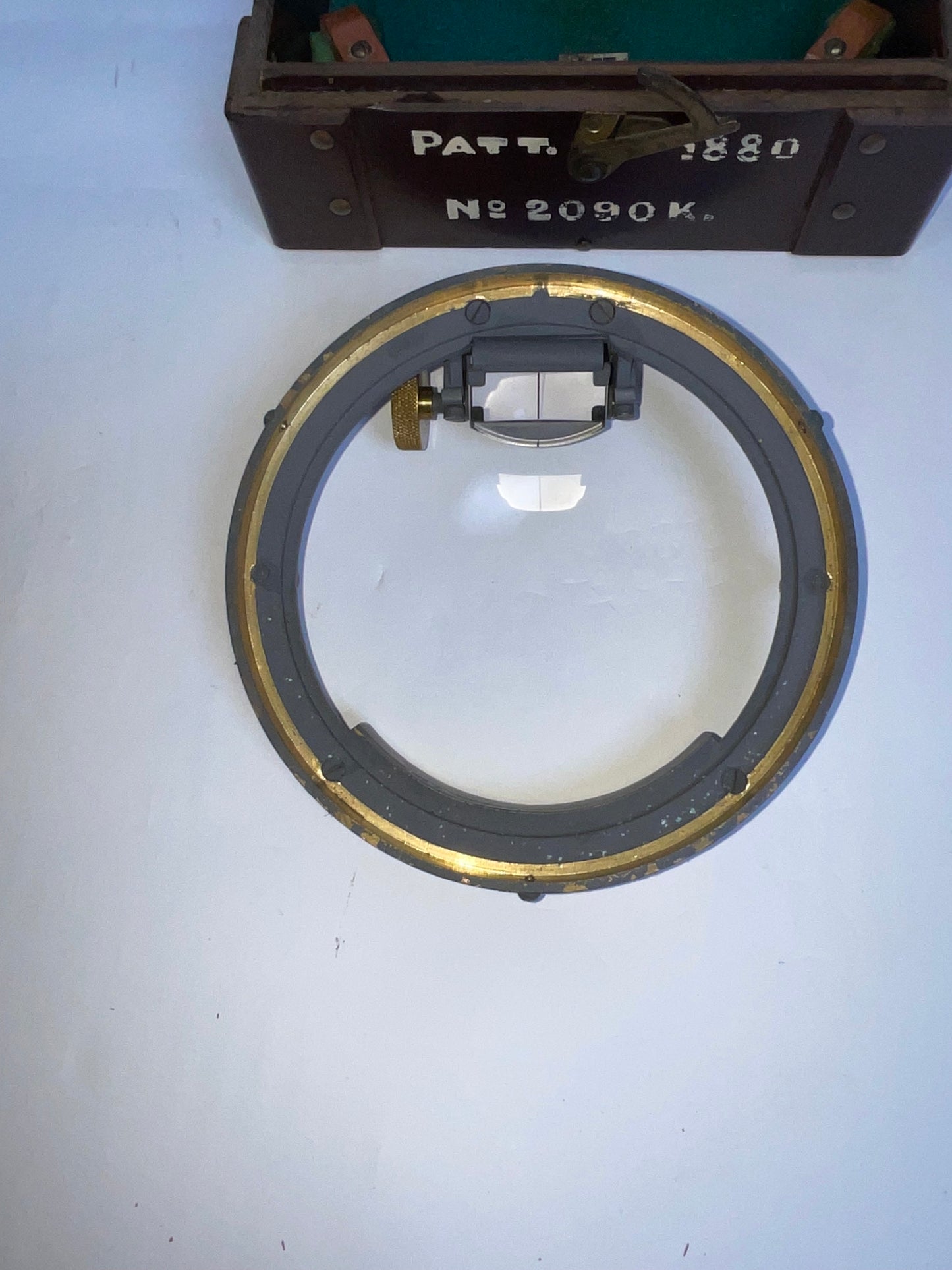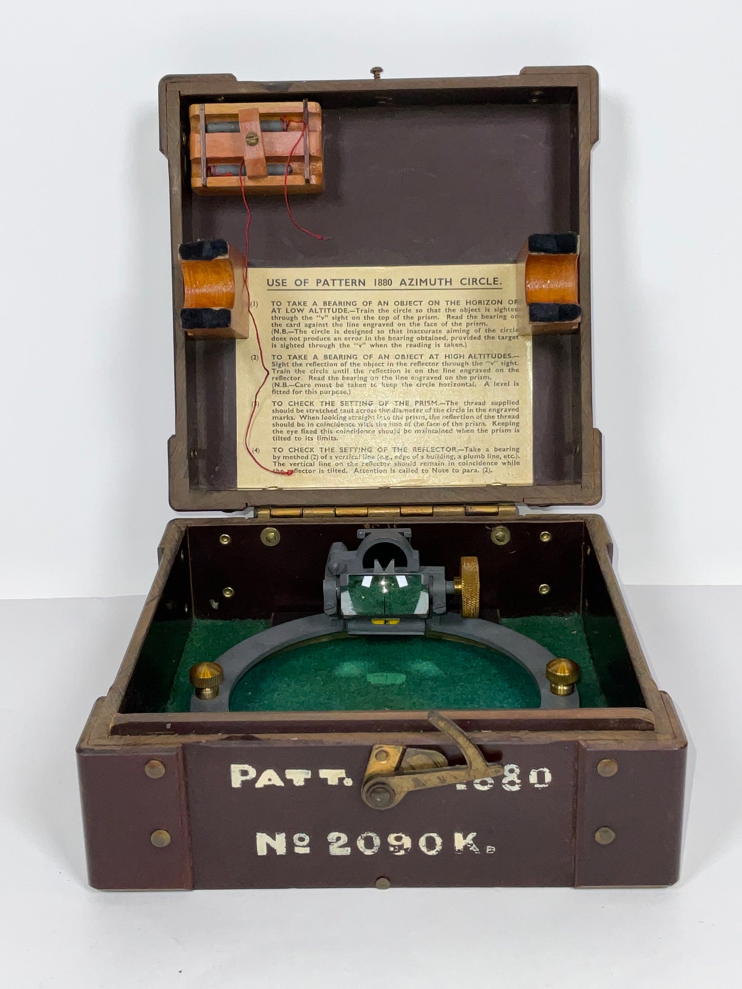 Vintage British military issue pattern 1880 Azimuth Circle in its original case with original paint on the circles and its filter frame. Lacquered brass trim. The sturdy timber box has reinforced corners and has hand painted lettering Patt. 1880, No 2090K. 3" H x 7" W x 7" D. 3 lbs.