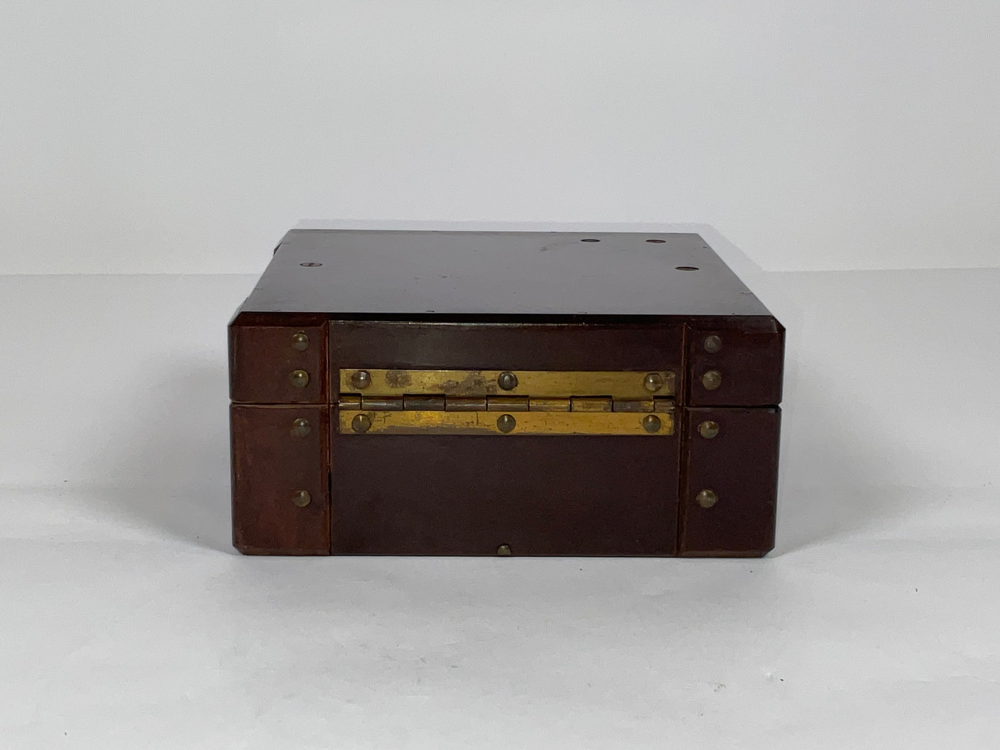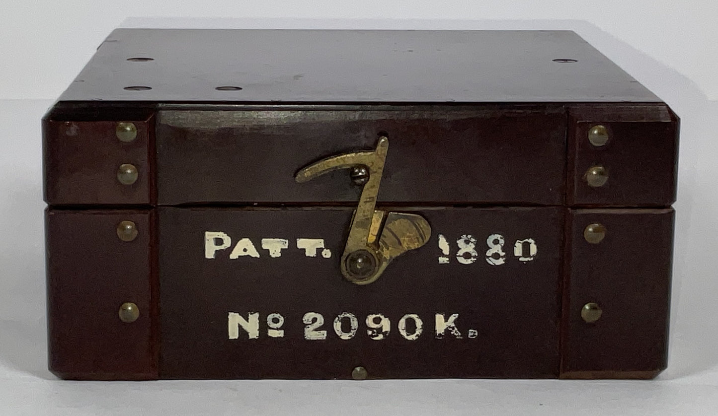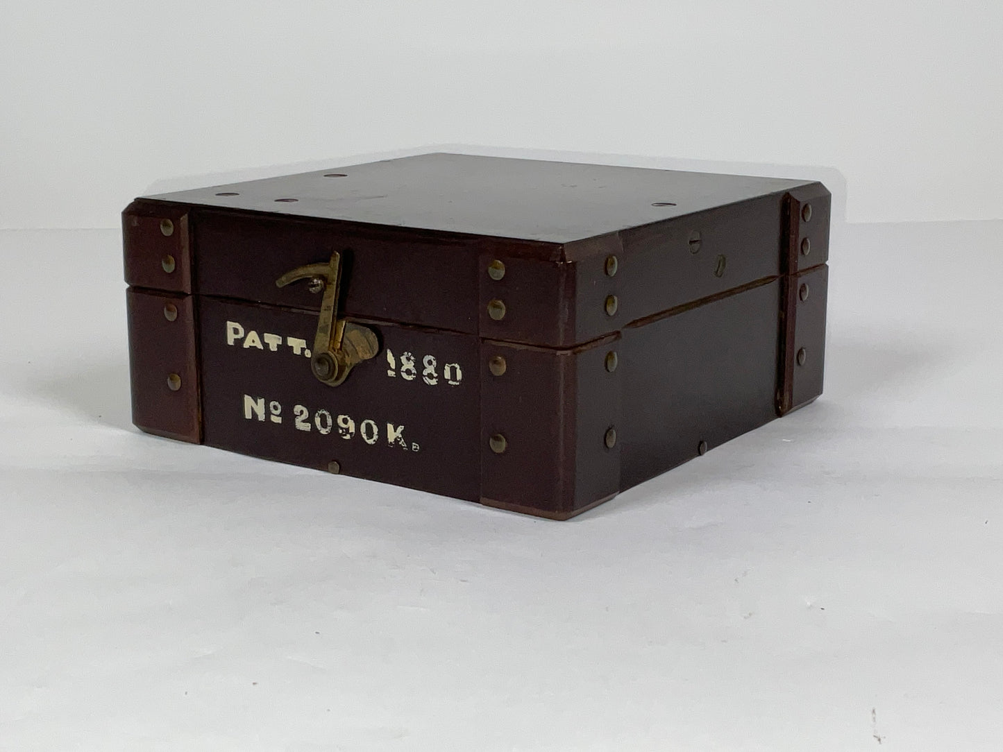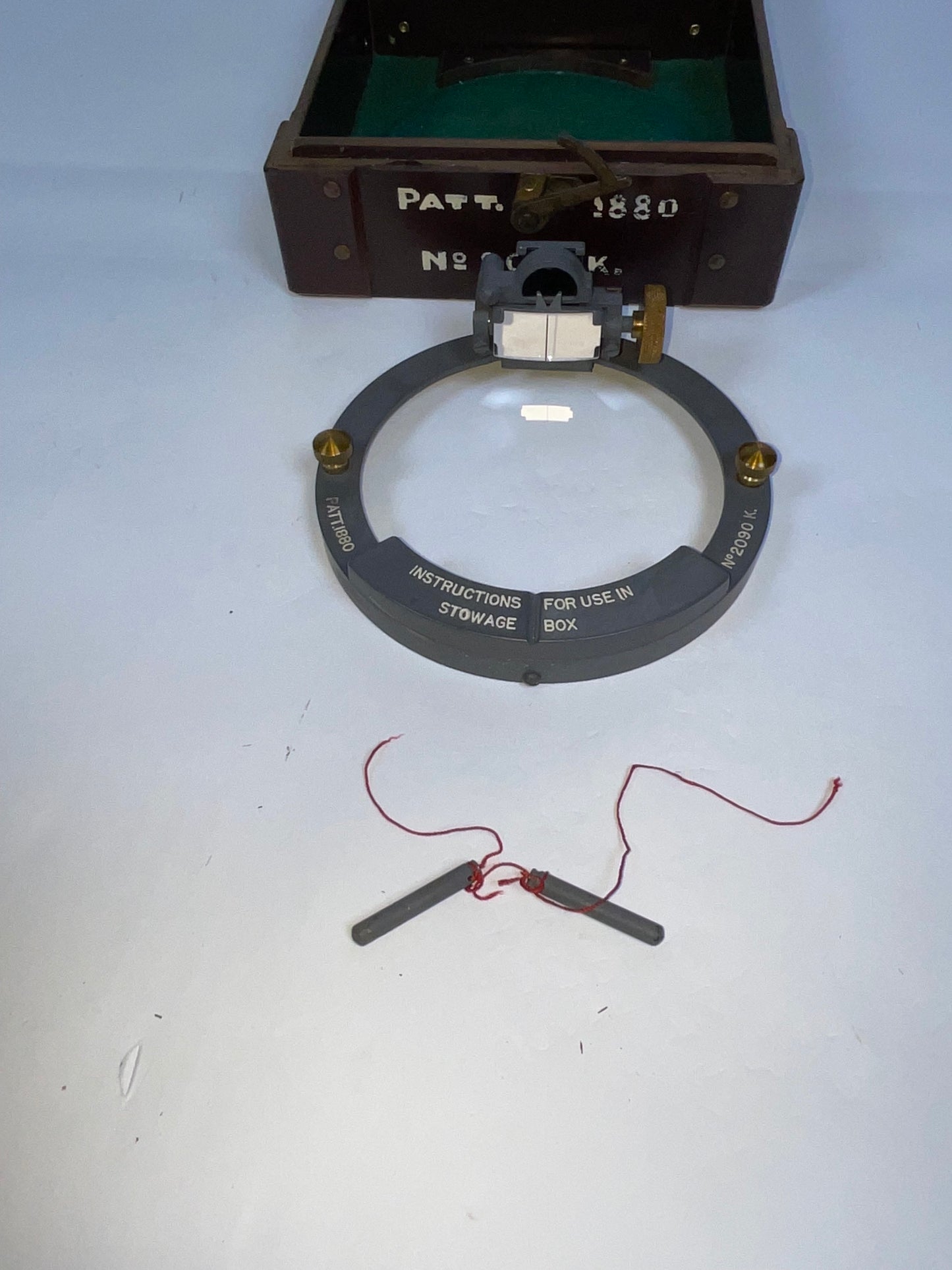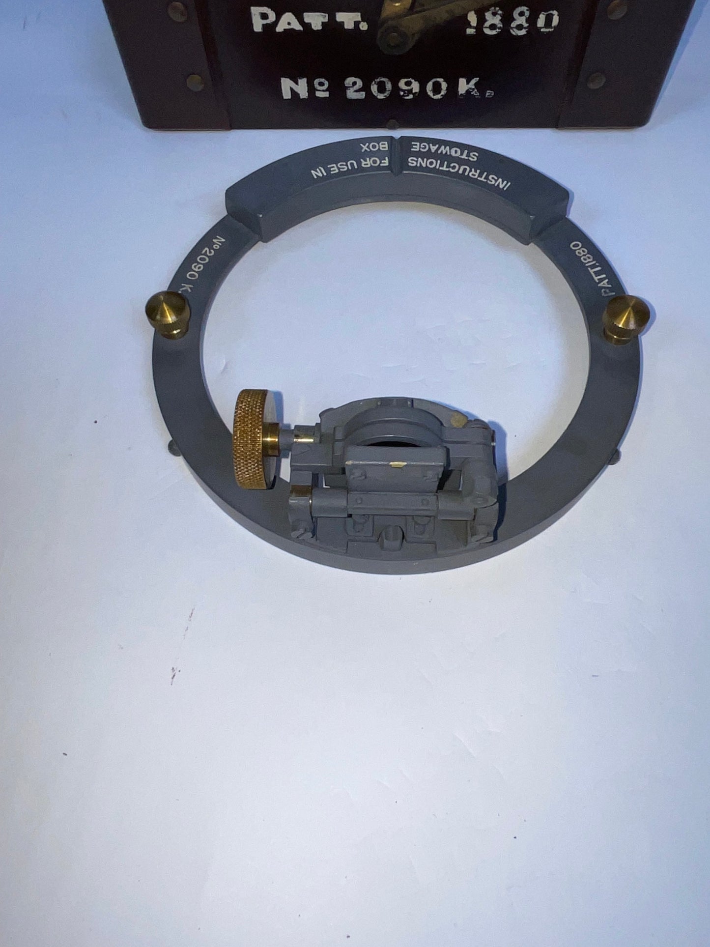 Vintage British military issue pattern 1880 Azimuth Circle in its original case with original paint on the circles and its filter frame. Lacquered brass trim. The sturdy timber box has reinforced corners and has hand painted lettering Patt. 1880, No 2090K. 3" H x 7" W x 7" D. 3 lbs.