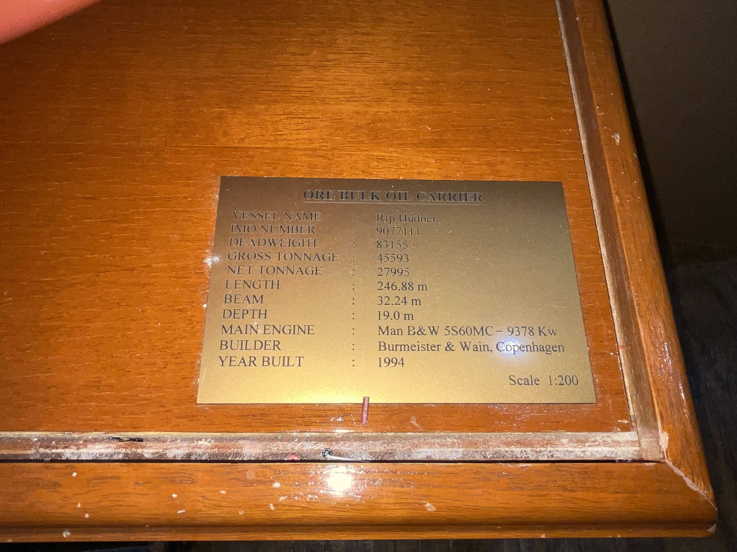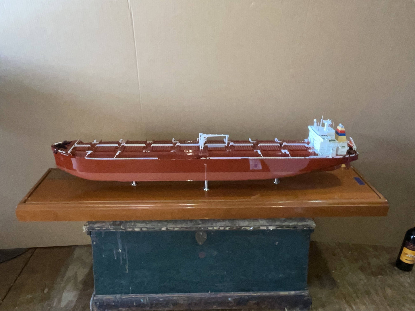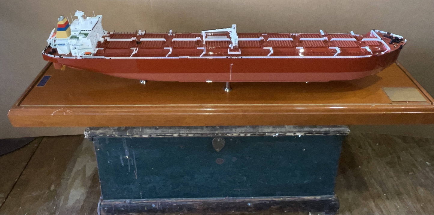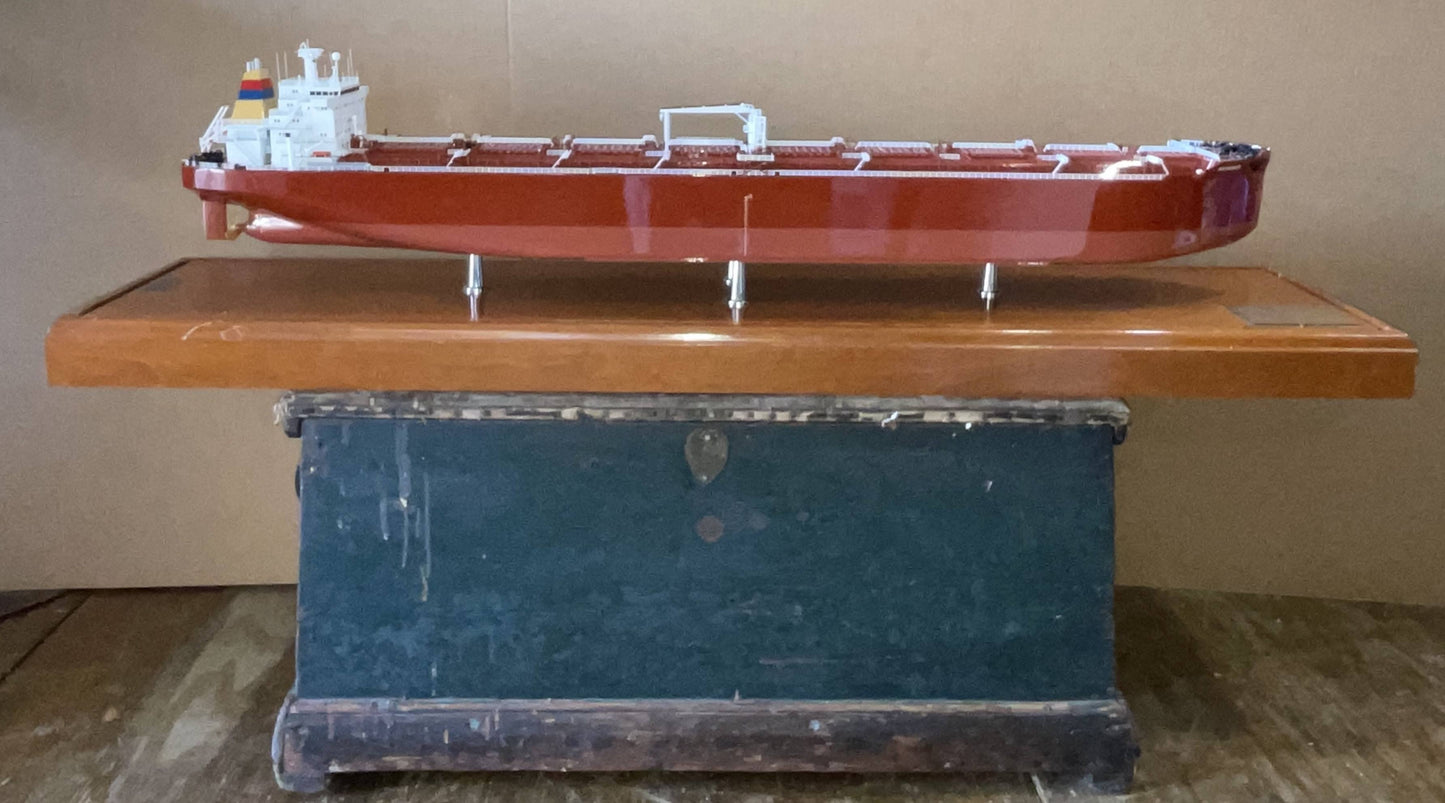 RIP Hudner of Nassau, a dockyard builders model of the ore and oil carrier built by Burmeister and Wain of Copenhagen, 1994. Finely built with all apparatus and deck details shown. Superstructure with many levels, wheelhouse is on top. Mounted to a mahogany base, (couple of scratches on base). Glass cover needs replacing. 56"W x 13"D x 15"H