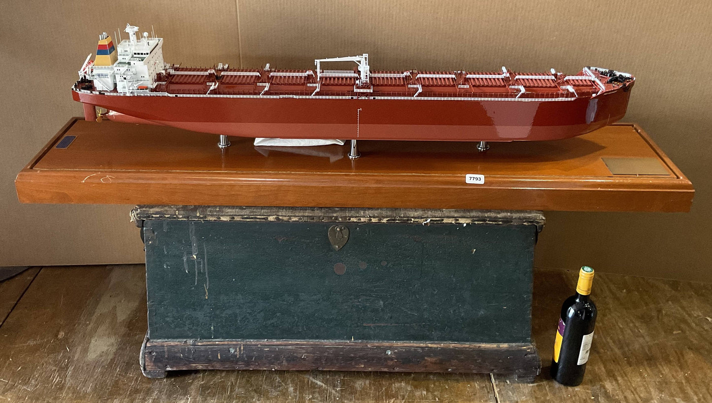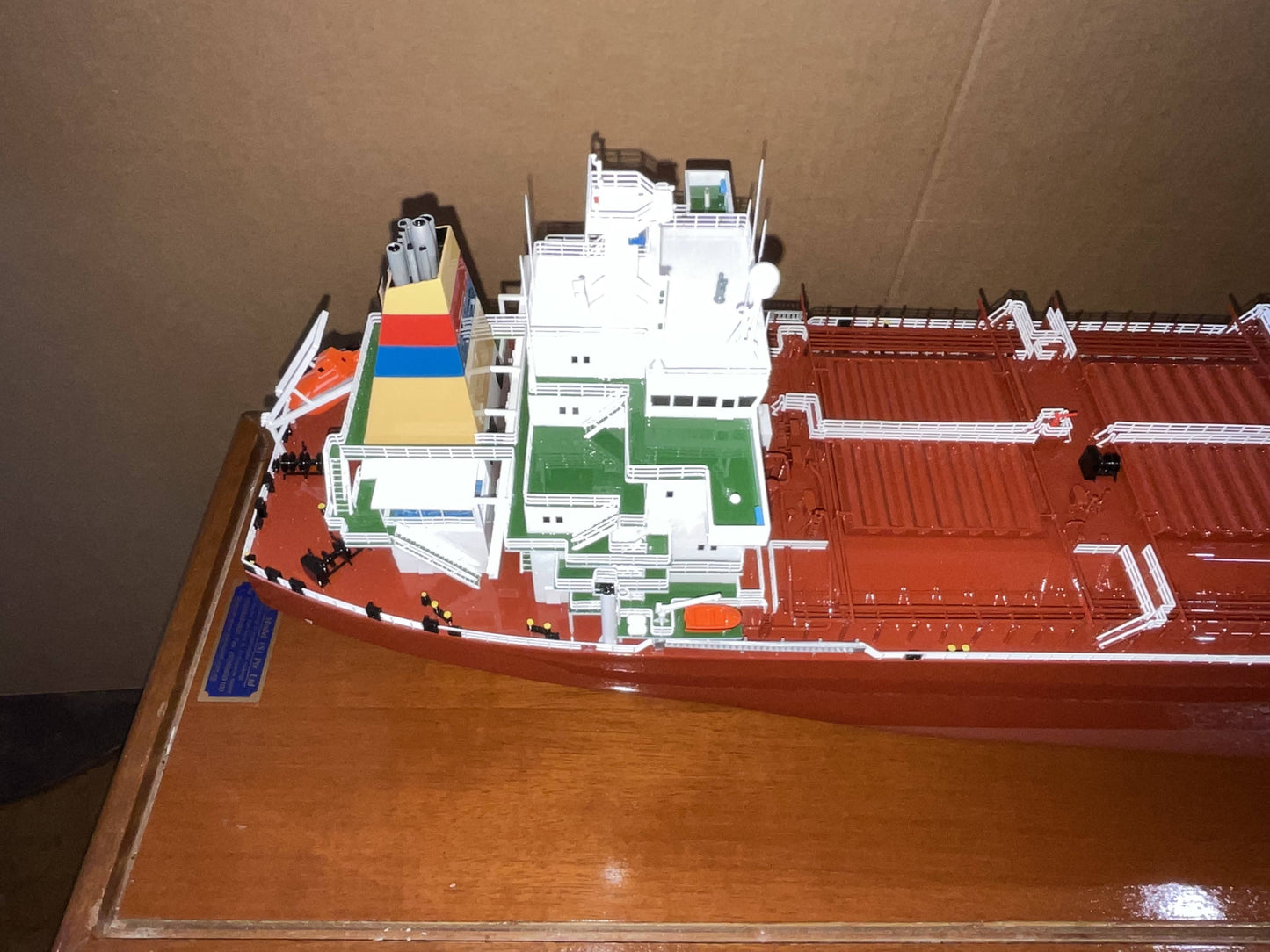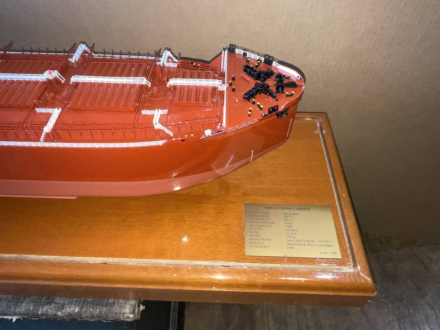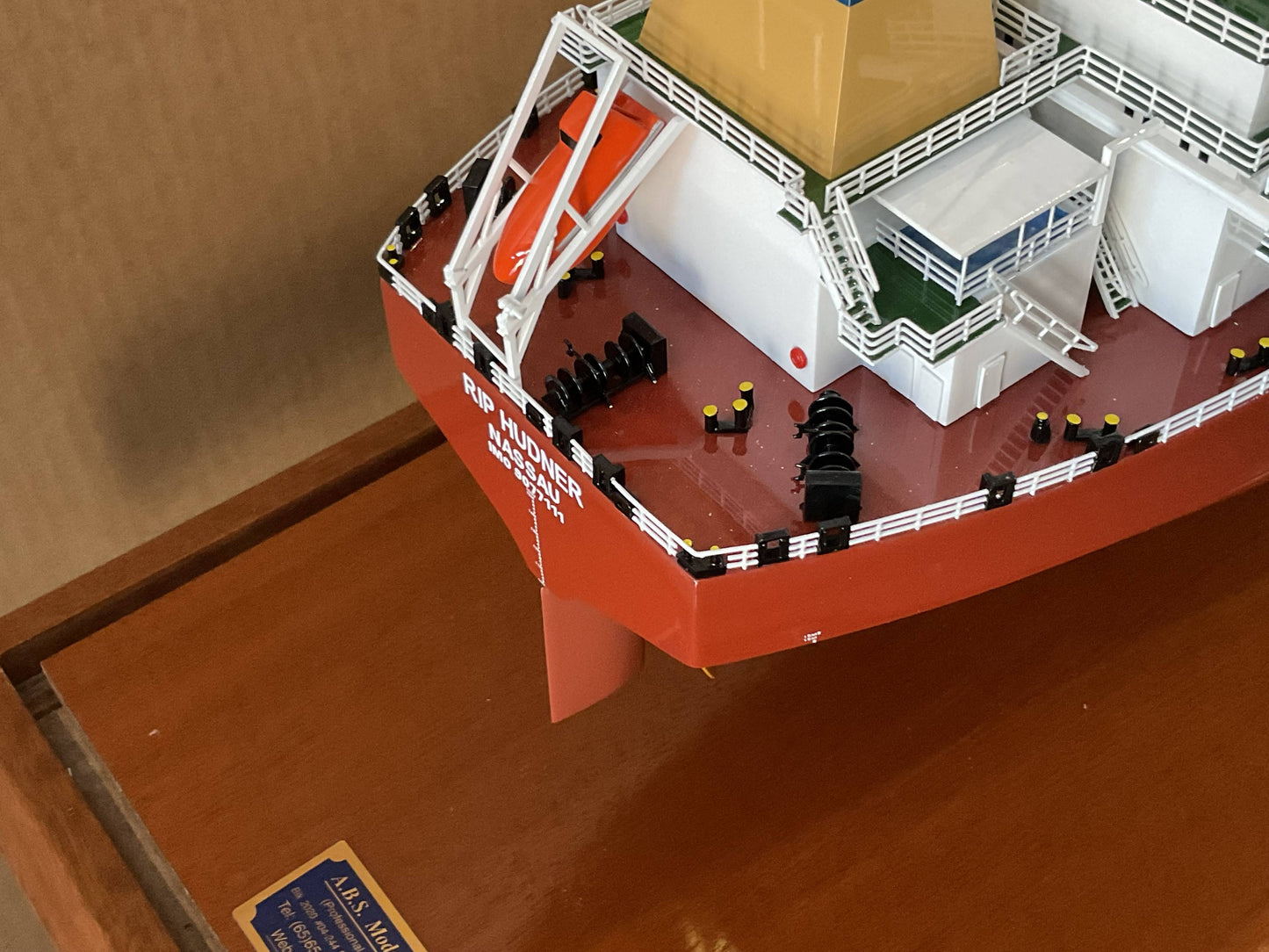 RIP Hudner of Nassau, a dockyard builders model of the ore and oil carrier built by Burmeister and Wain of Copenhagen, 1994. Finely built with all apparatus and deck details shown. Superstructure with many levels, wheelhouse is on top. Mounted to a mahogany base, (couple of scratches on base). Glass cover needs replacing. 56"W x 13"D x 15"H