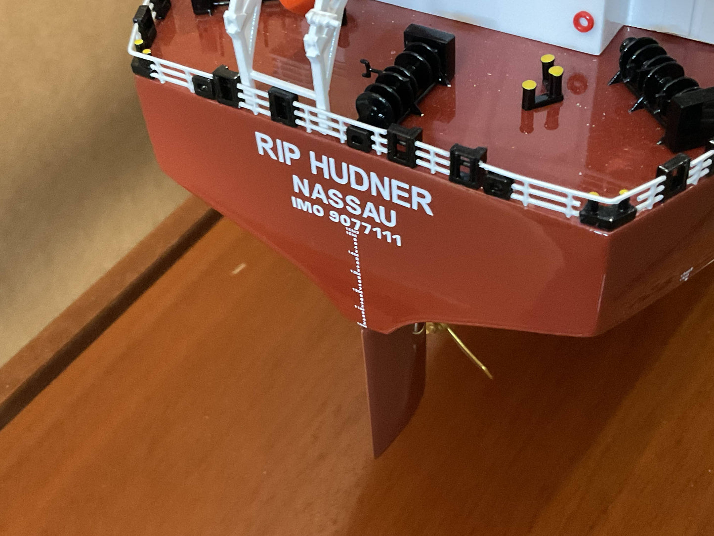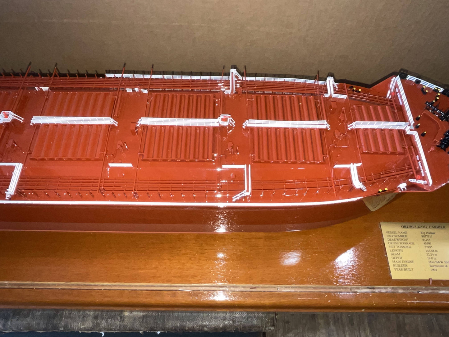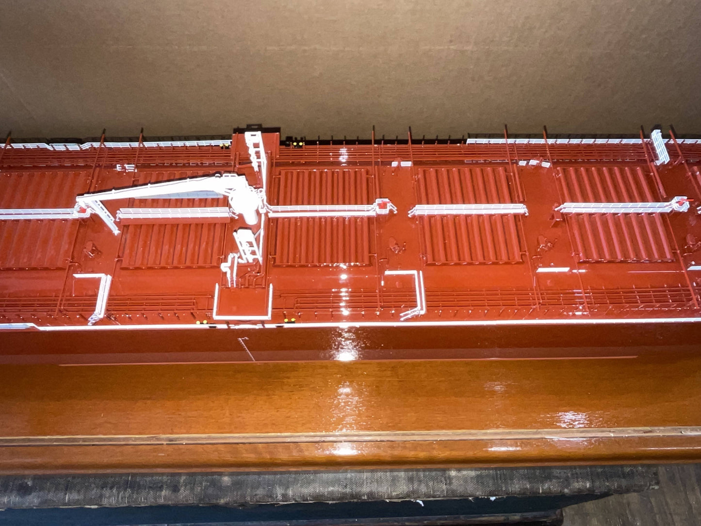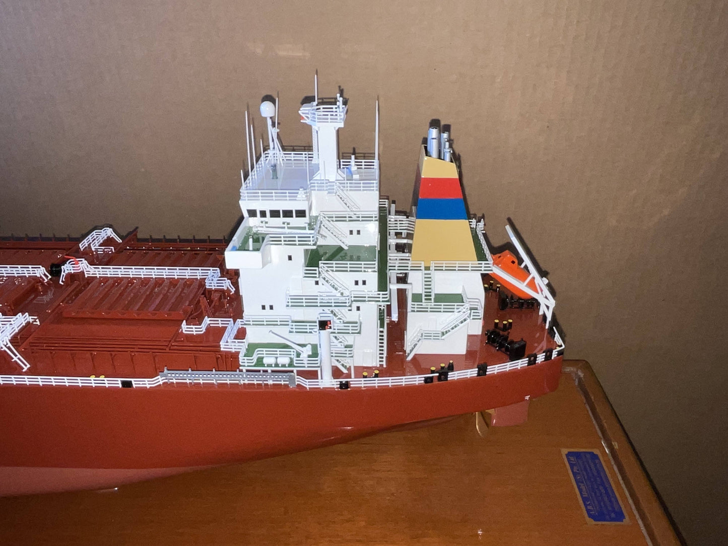 RIP Hudner of Nassau, a dockyard builders model of the ore and oil carrier built by Burmeister and Wain of Copenhagen, 1994. Finely built with all apparatus and deck details shown. Superstructure with many levels, wheelhouse is on top. Mounted to a mahogany base, (couple of scratches on base). Glass cover needs replacing. 56"W x 13"D x 15"H
