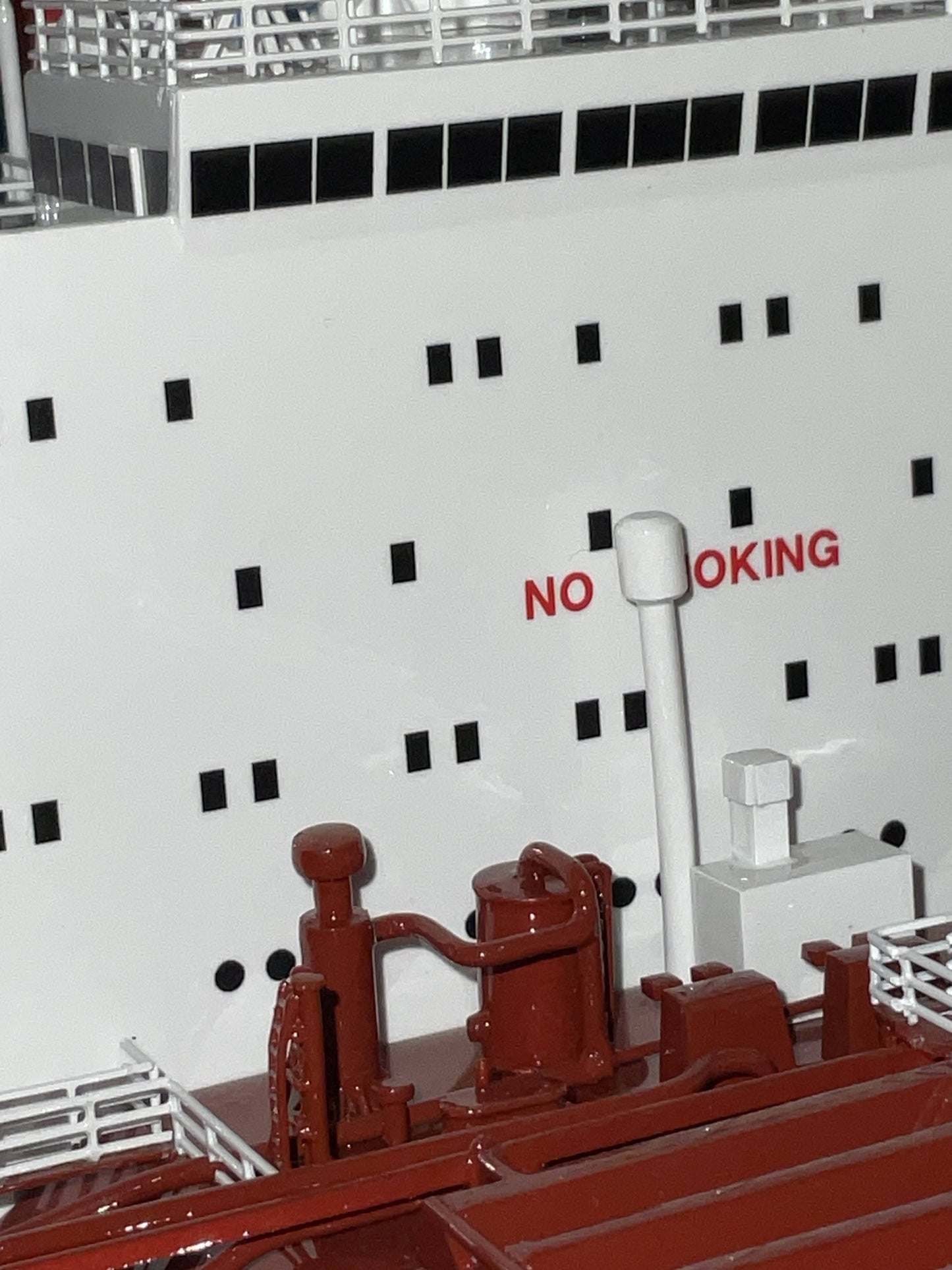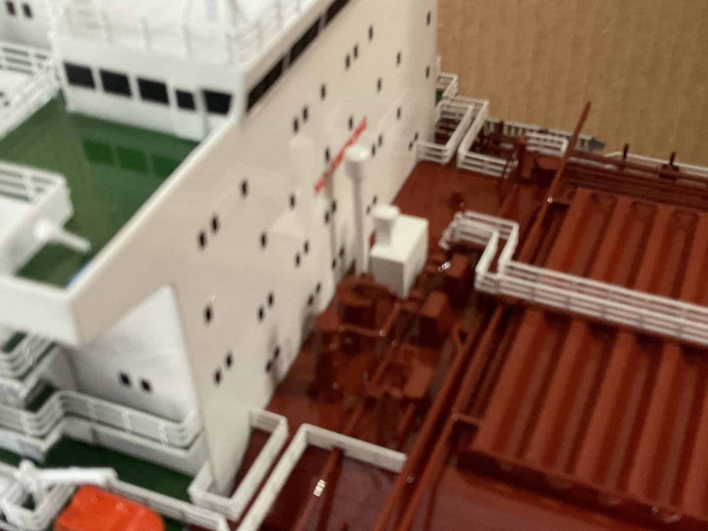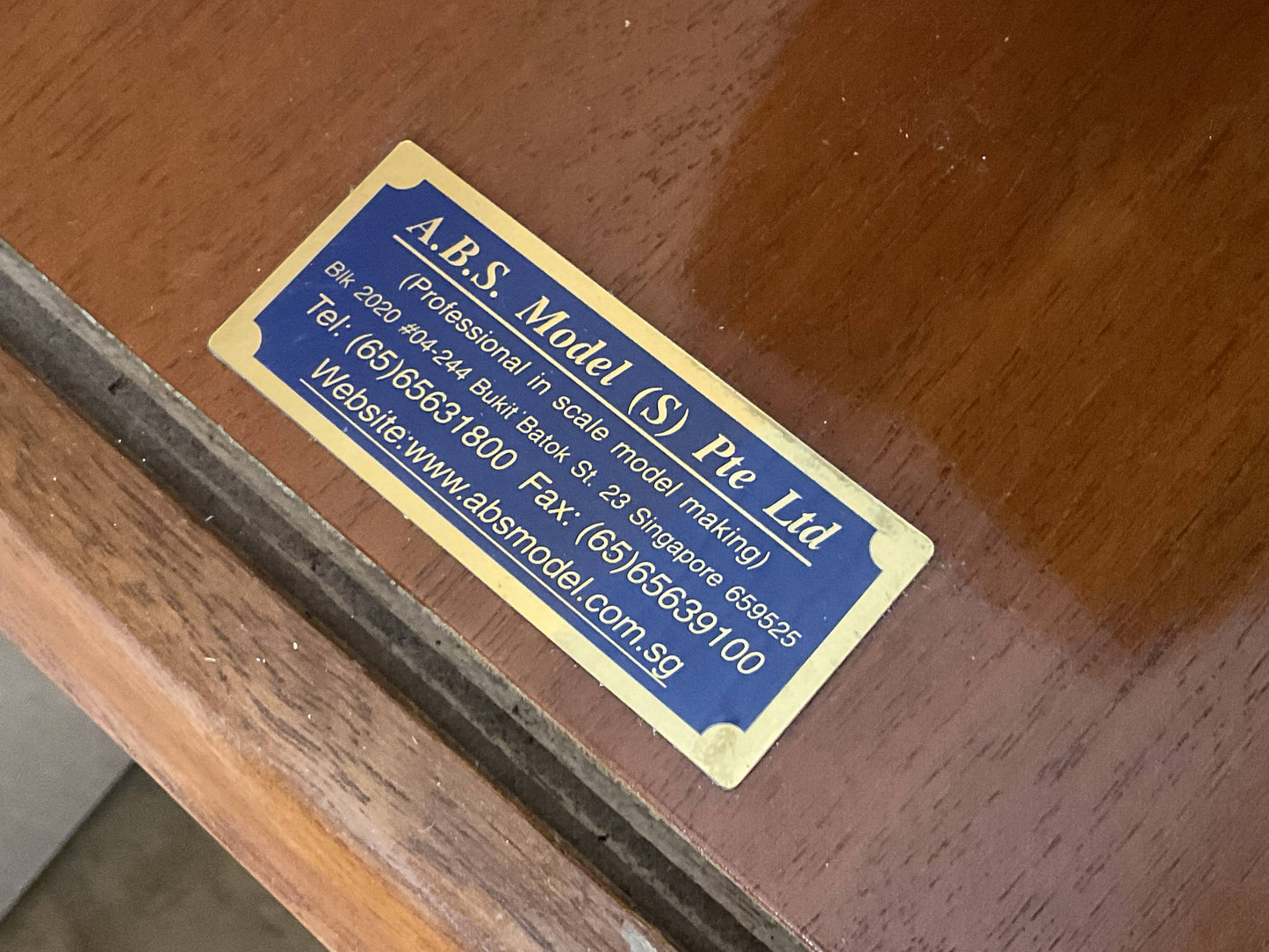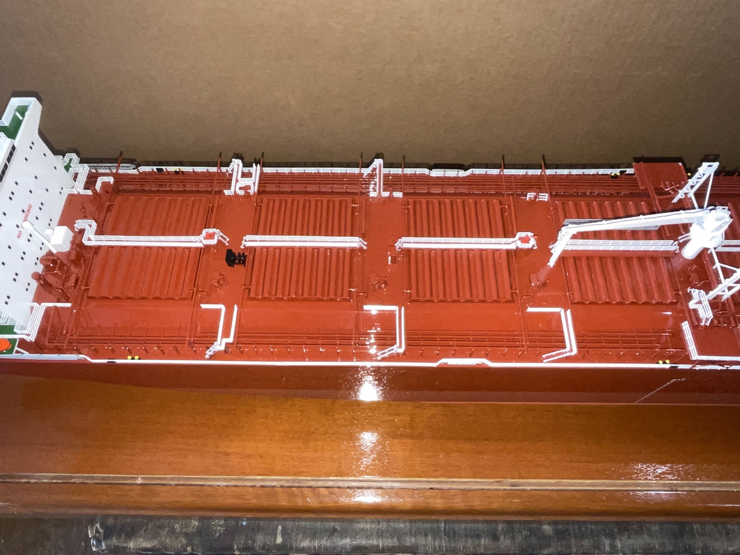 RIP Hudner of Nassau, a dockyard builders model of the ore and oil carrier built by Burmeister and Wain of Copenhagen, 1994. Finely built with all apparatus and deck details shown. Superstructure with many levels, wheelhouse is on top. Mounted to a mahogany base, (couple of scratches on base). Glass cover needs replacing. 56"W x 13"D x 15"H