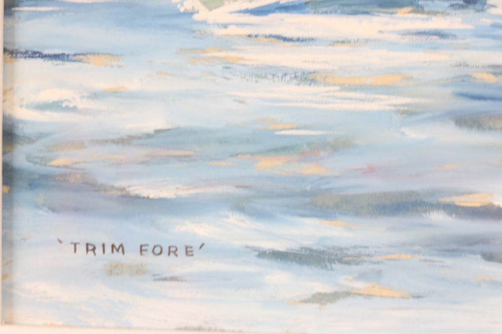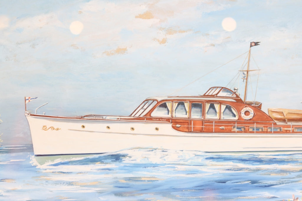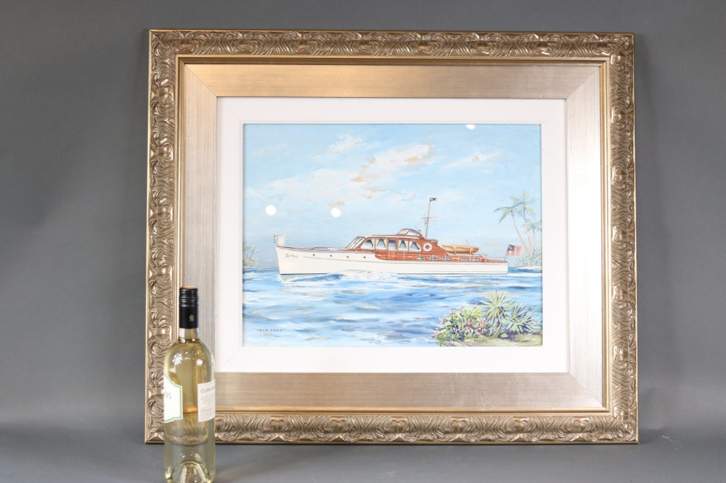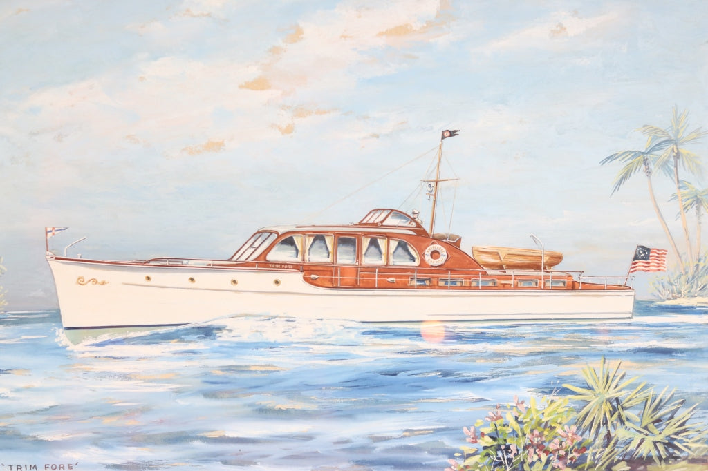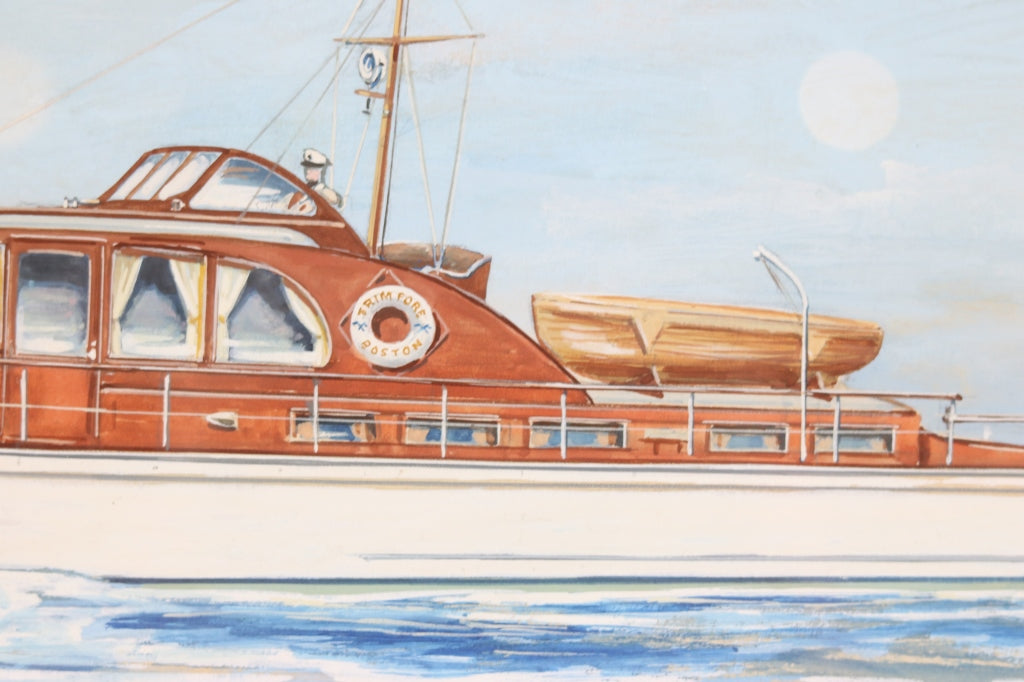 Colorful gouache of a large cabin cruiser "Trim Fore" by noted illustrator John Austin Taylor. The yacht is 54 feet long and owned by Boston coffee merchant Stanley Ferguson. The yacht was designed by Eldridge McInnis and built by James Graves in Marblehead, Mass in 1941. Custom framed.