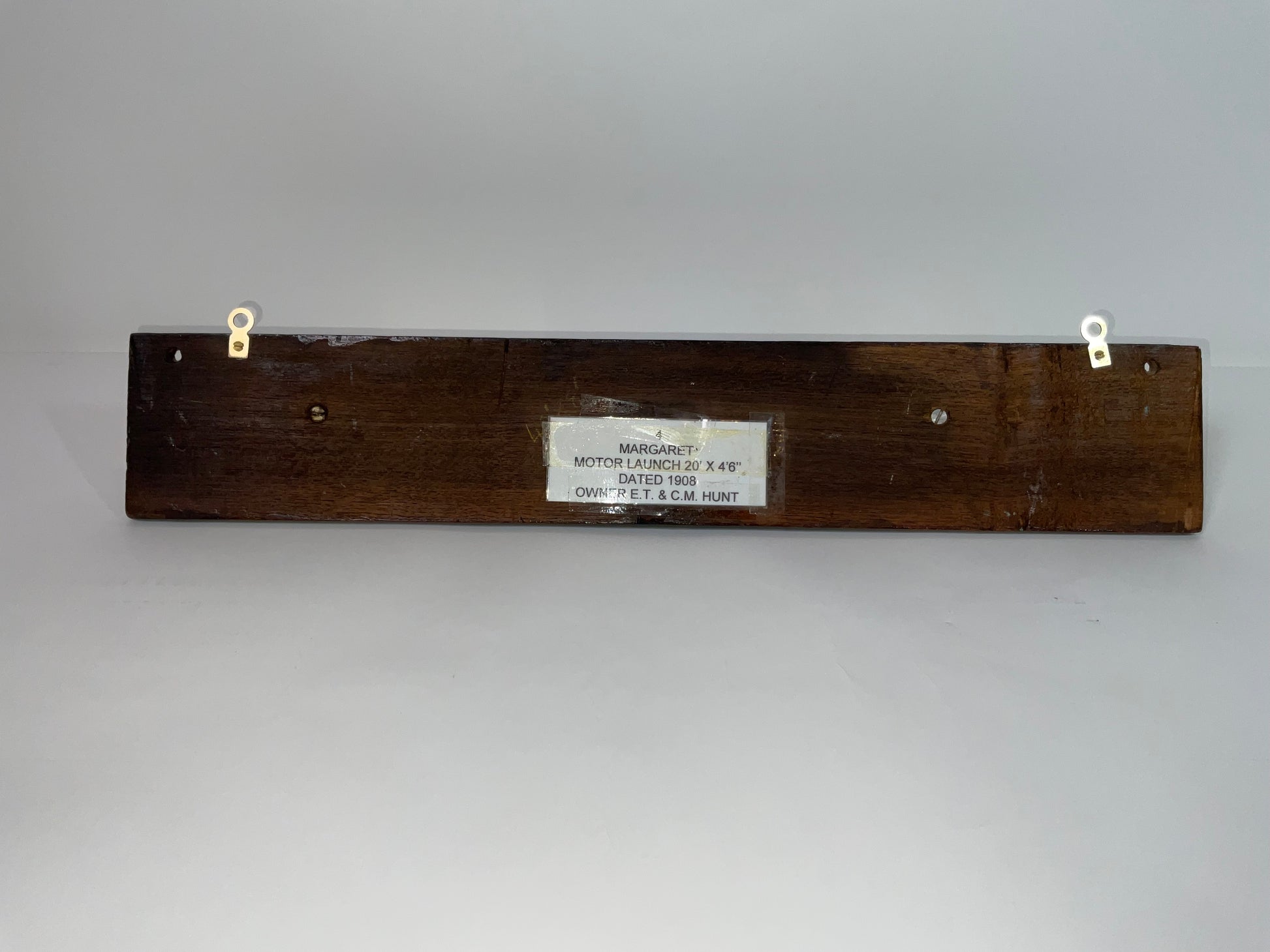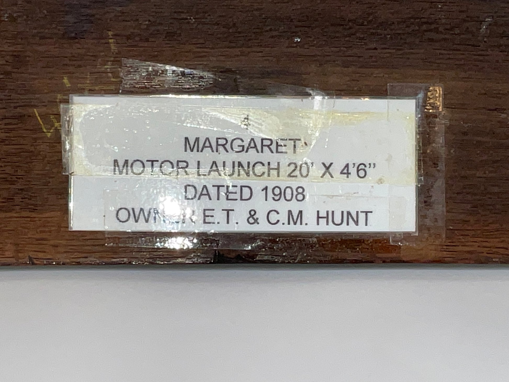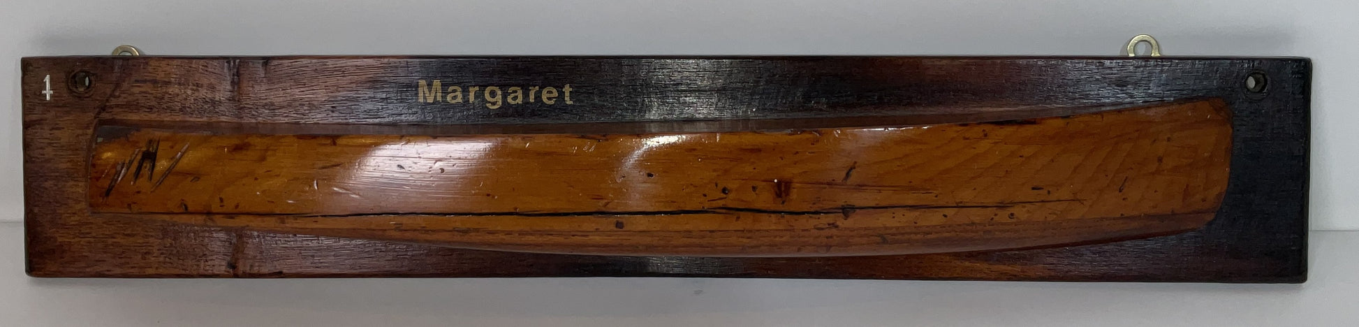 Builder’s half model of a powerboat. The carved hull has a varnish finish and is mounted to a wood backboard. Condition: Note split on hull. Label on back reads “Margaret, Motor Launch 20' x 4' 6" dated 1908, owner E.T. & C.M. Hunt.” Lettering is later.