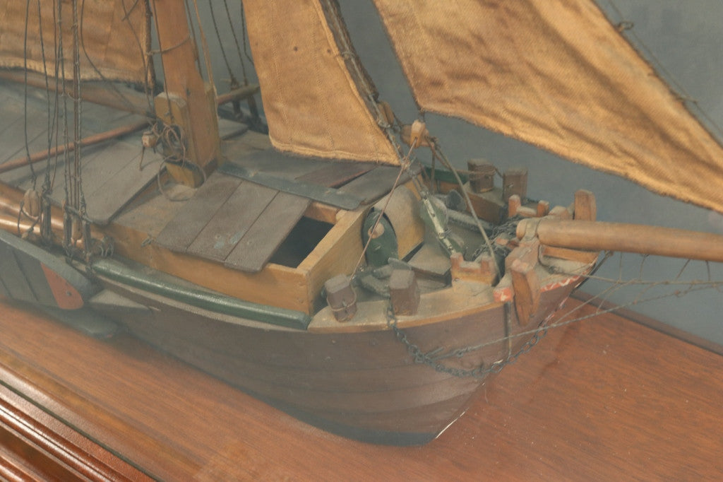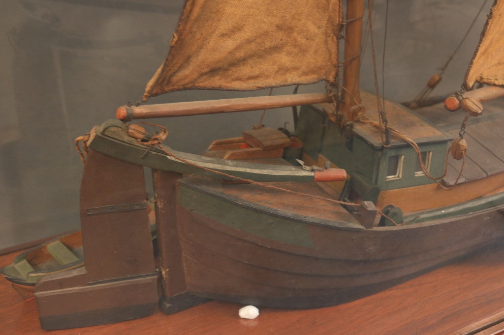 Early model from the late 19th-century of a Dutch work boat. Old world feel. Rigged with sails and fitted with lee boards. Fitted to a mahogany and glass case.