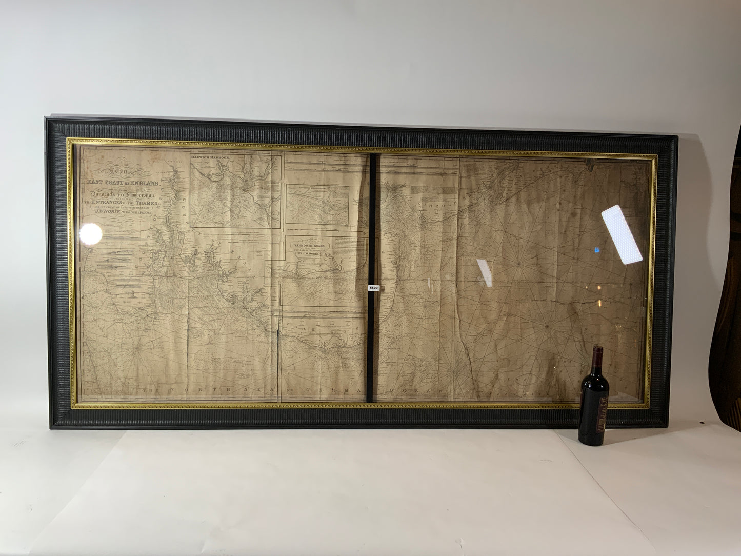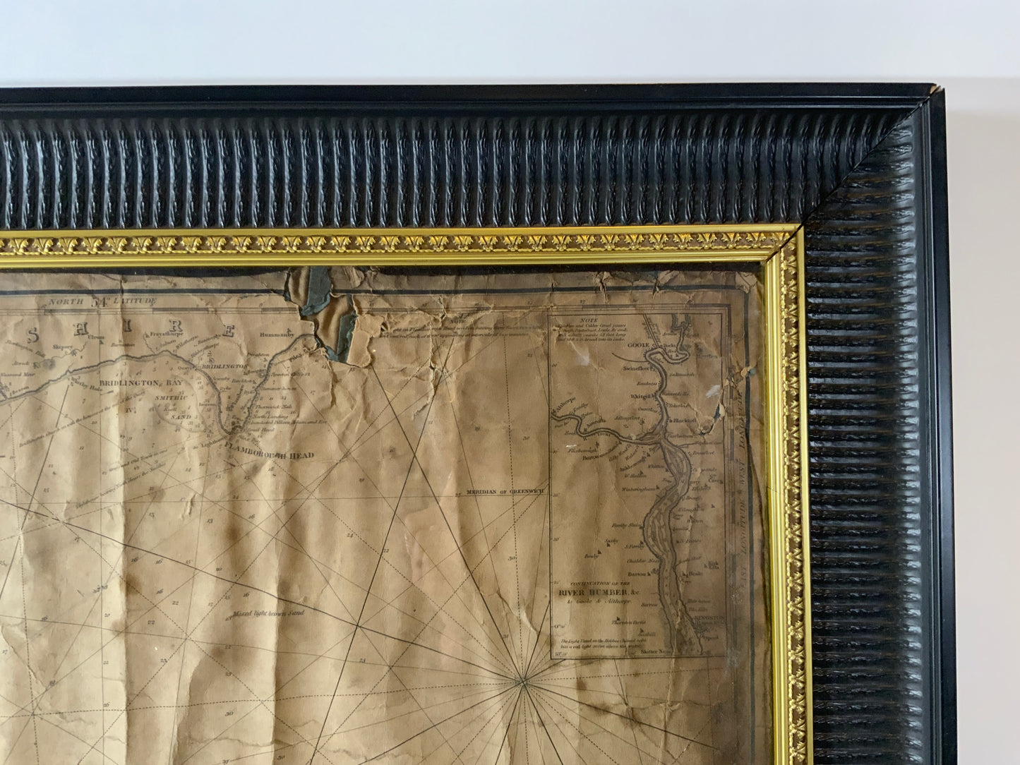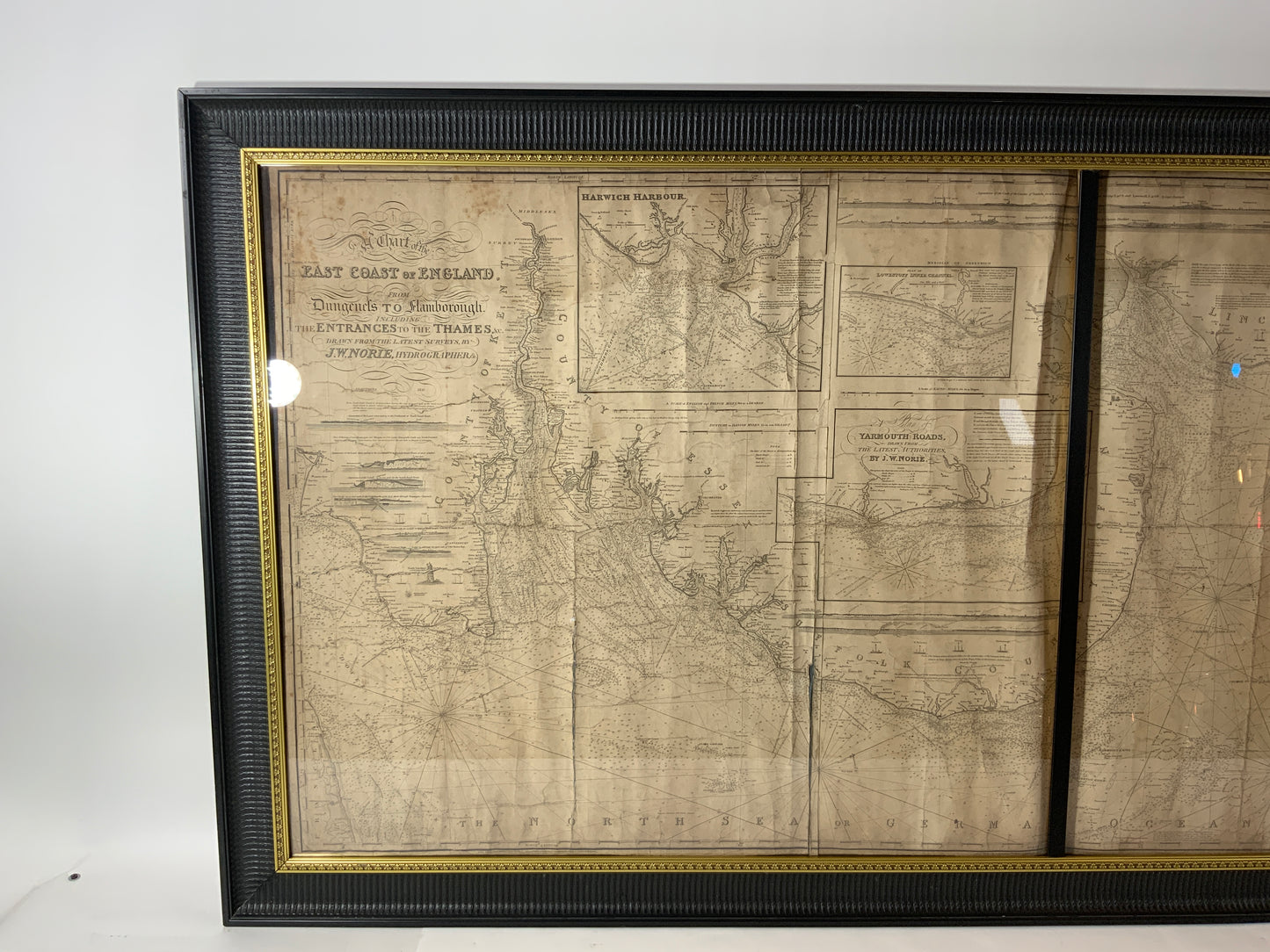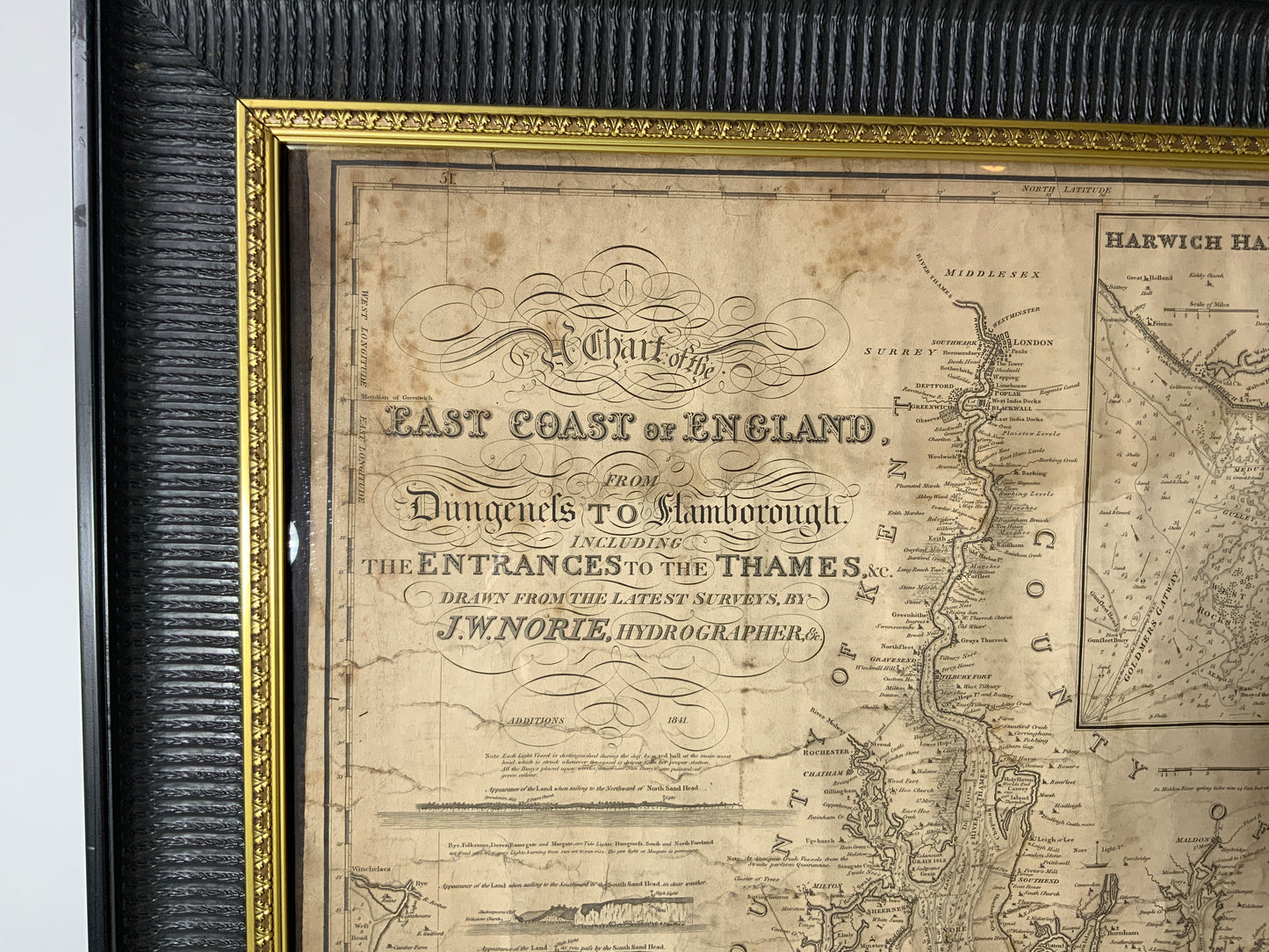 Chart of the East Coast of England, from Dungeness to Flamborough, including the entrances to the Thames River. Drawn by hydrographer J.W. Norie in 1841. Includes Kent, Essex and Suffolk counties, as well as Harwich Harbour and Yarmouth Roads. Set in a beautiful black and gold frame.