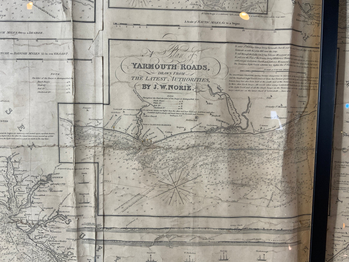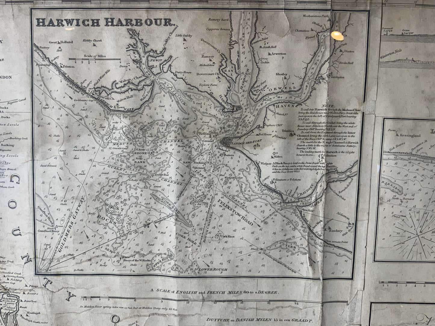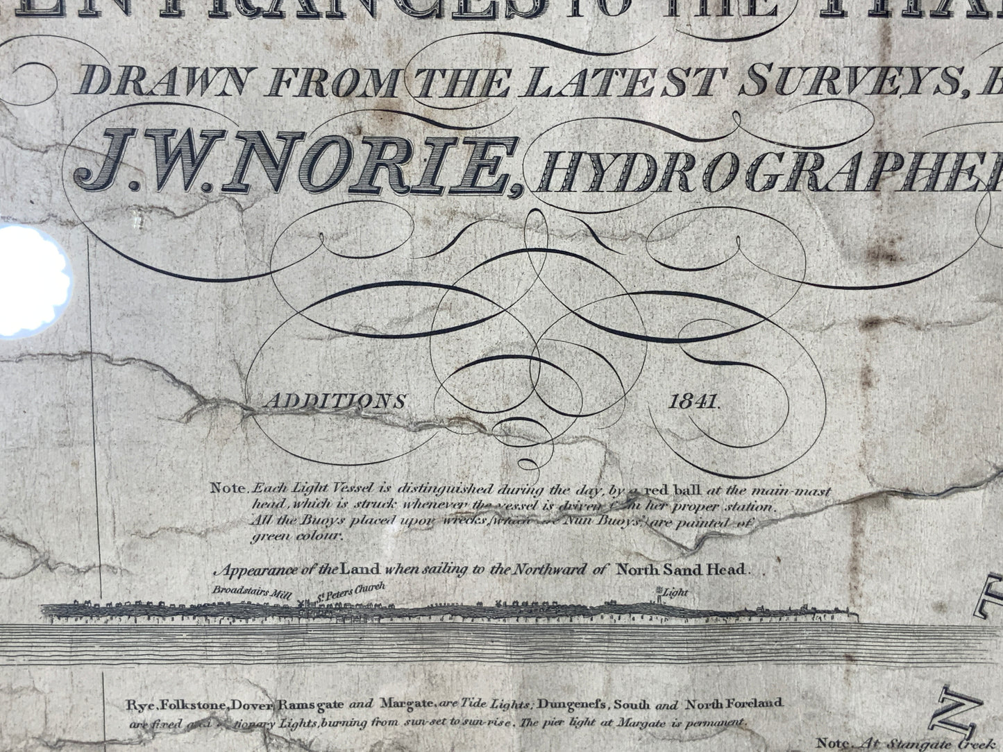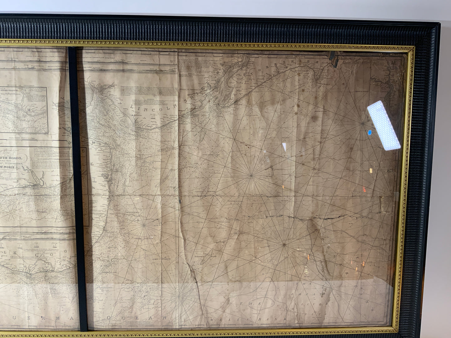 Chart of the East Coast of England, from Dungeness to Flamborough, including the entrances to the Thames River. Drawn by hydrographer J.W. Norie in 1841. Includes Kent, Essex and Suffolk counties, as well as Harwich Harbour and Yarmouth Roads. Set in a beautiful black and gold frame.