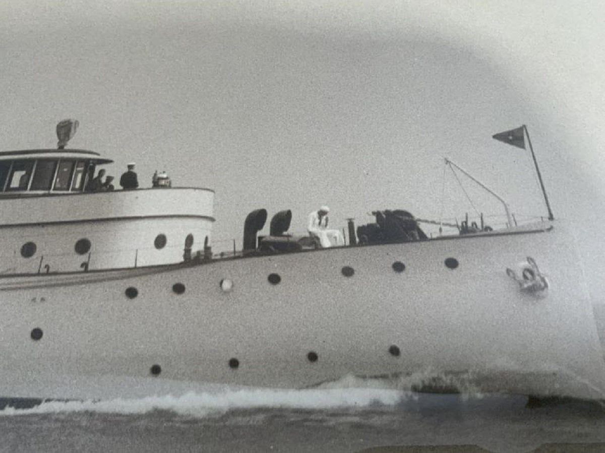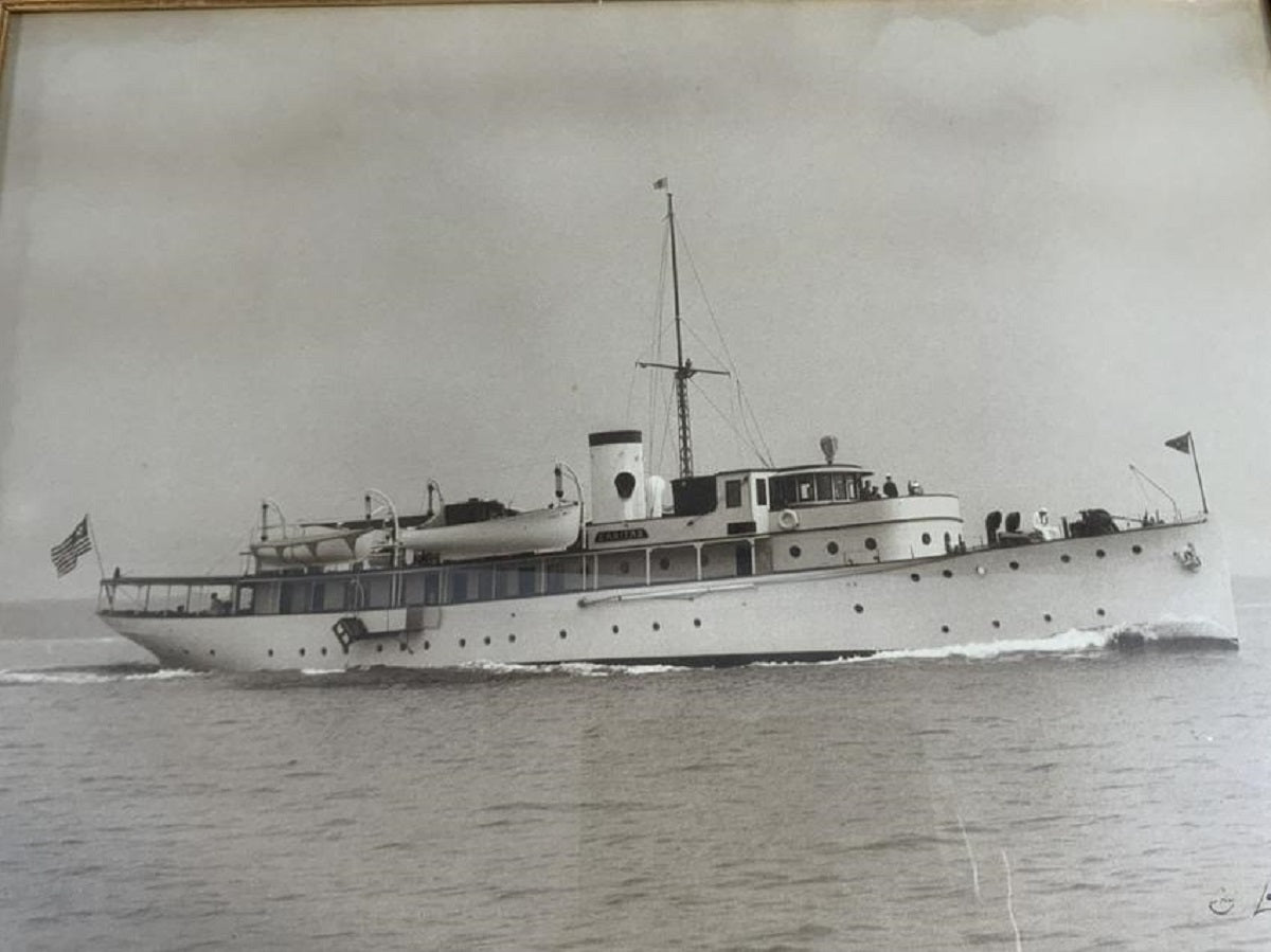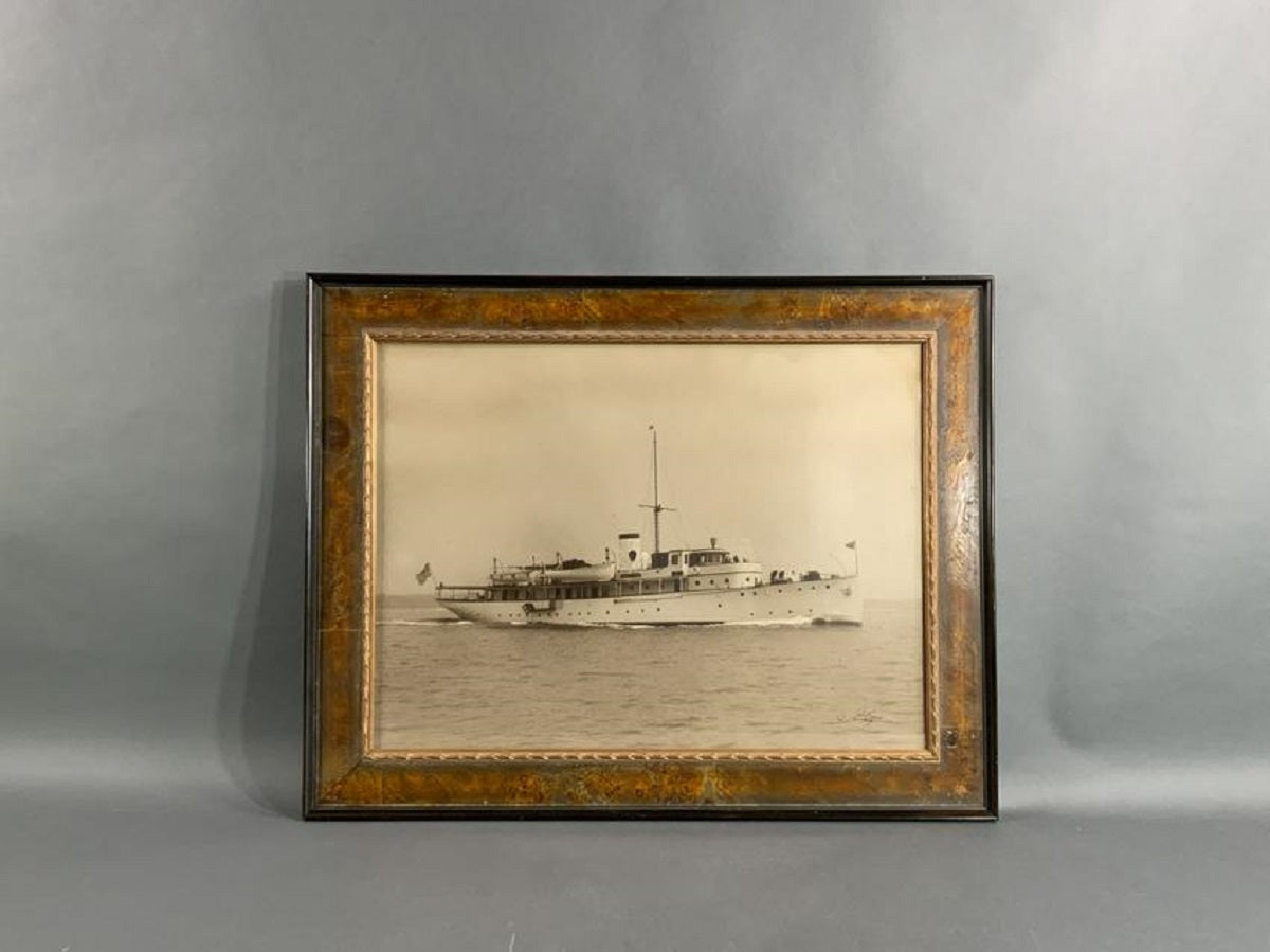 Large framed photo print from the studio of Edwin Levick of motor yacht "Caritas". The yacht was designed by Cox and Stevens, built by Krupp in Kiel Germany. She was owned by J Percy Bartram and was once the flagship of the New York Yacht Club.