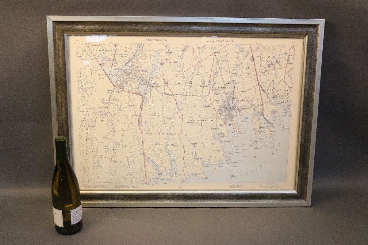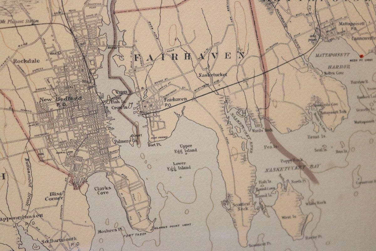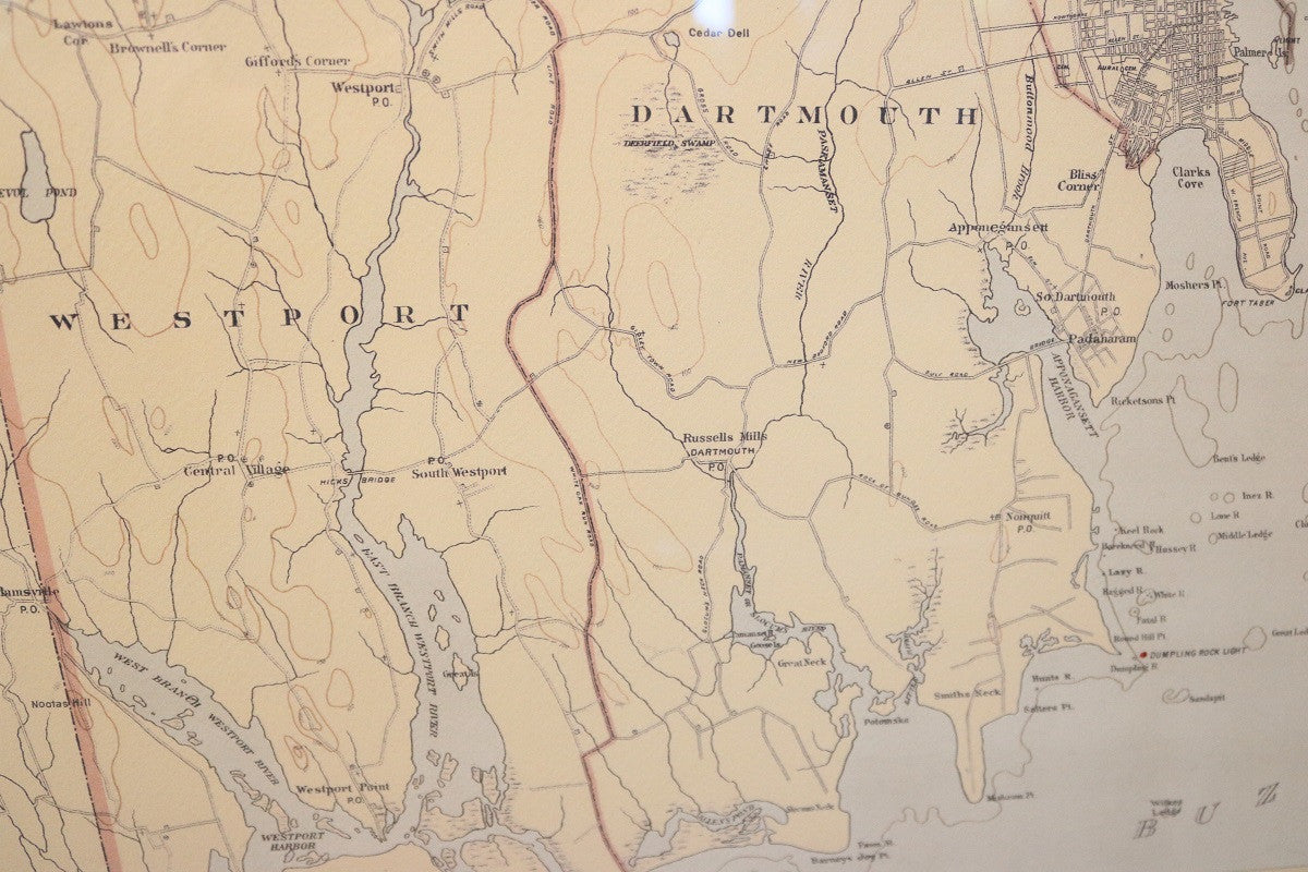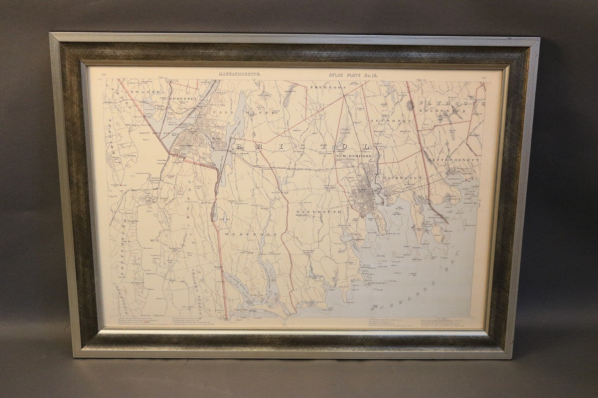 Copy of Walker's Map of Bristol County, Massachusetts. Showing Fairhaven, Westport, Little Compton, Rhode Island. Also includes many islands bays and harbors. Framed in silver.
