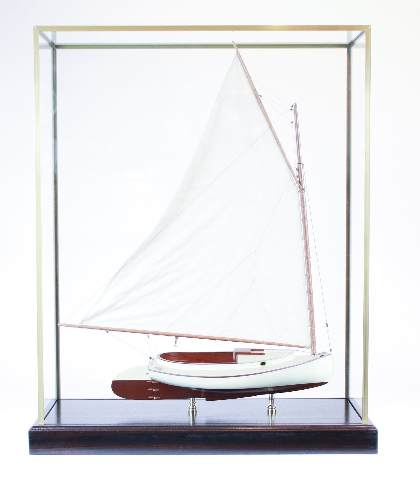 Model of a Crosby catboat in a glass display case with brass trim. The catboat originates to the late 19th century in Osterville, Mass. The model has a cockpit with benches, rudder and a door. Rigged with a stitched linen sail. 31 x 13 x 38