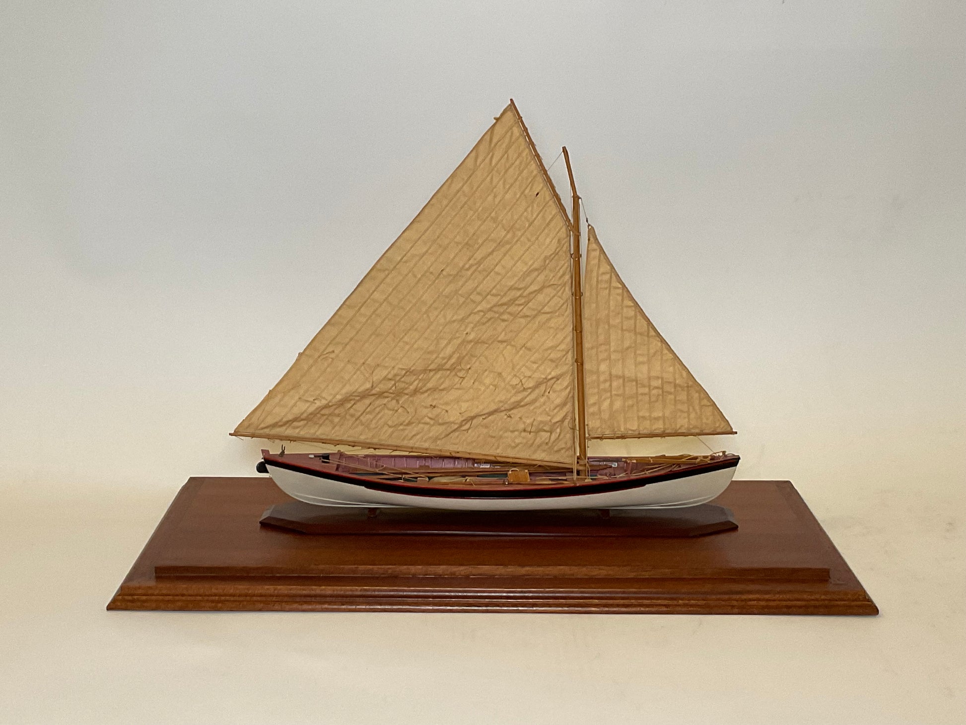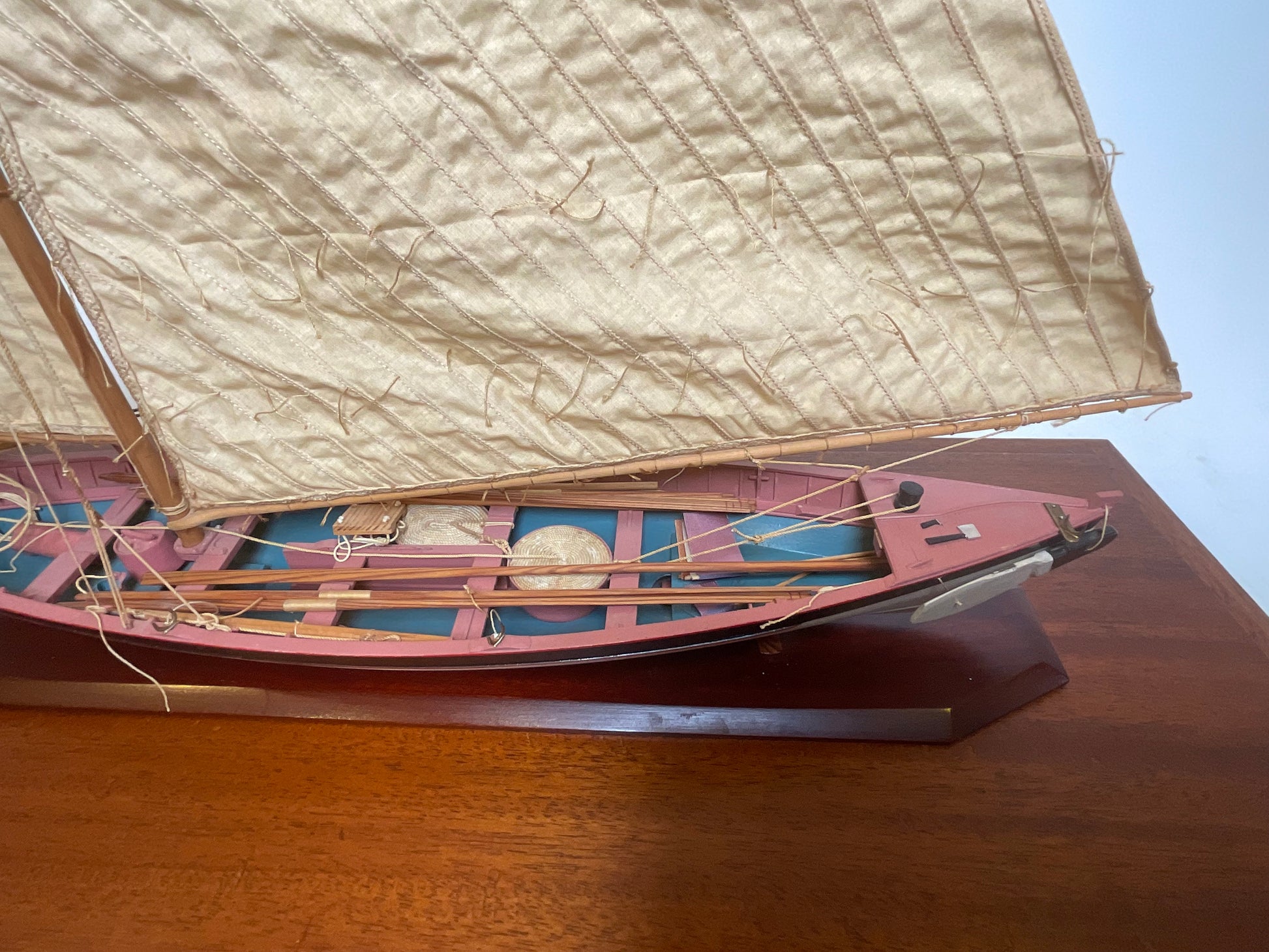 Sleek model of a whaleboat, rigged with a fine pair of finely stitched sails. Fully equipped with gear, including line tubs, an anchor, harpoons, lances, a water cask, flag, oars, etc. The oars are stored on deck. Fitted to a fine custom case.