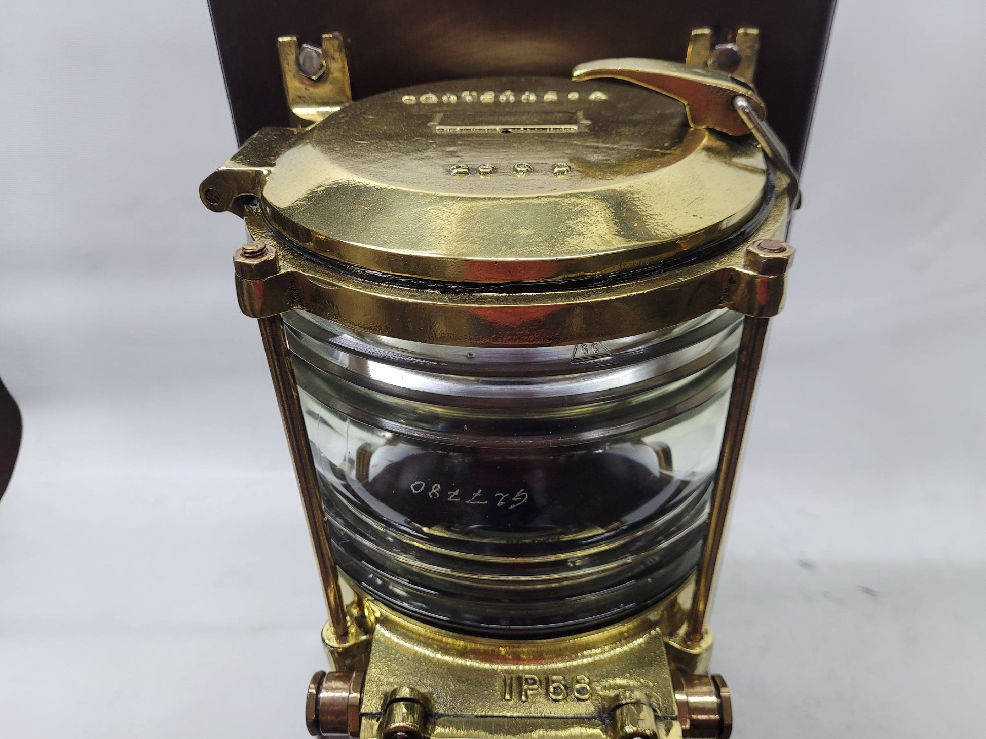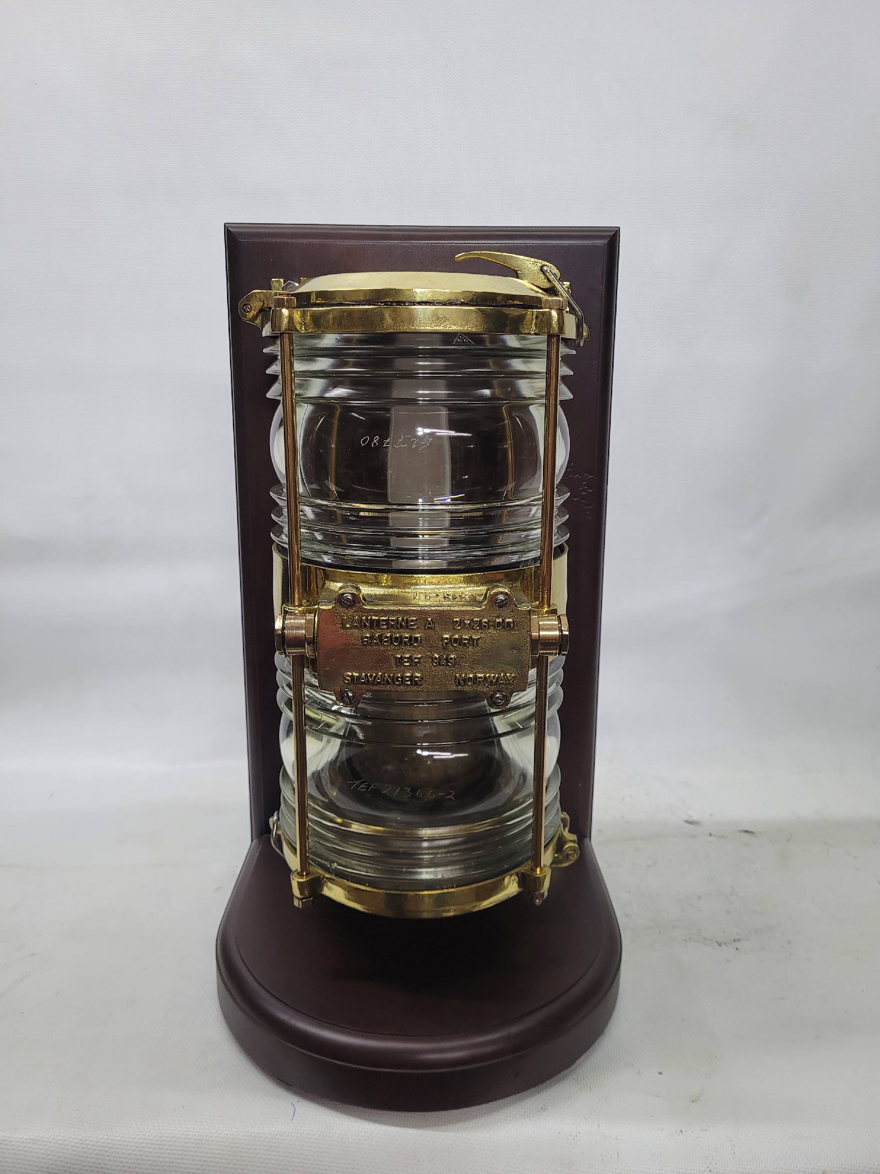 Description: Impressive solid brass marine beacon with brass bars and Fresnel glass lenses, mounted to a custom wood stand with dark finish. Heavy and sturdy with a highly polished and lacquered finish. Made in Norway by Stavanger.