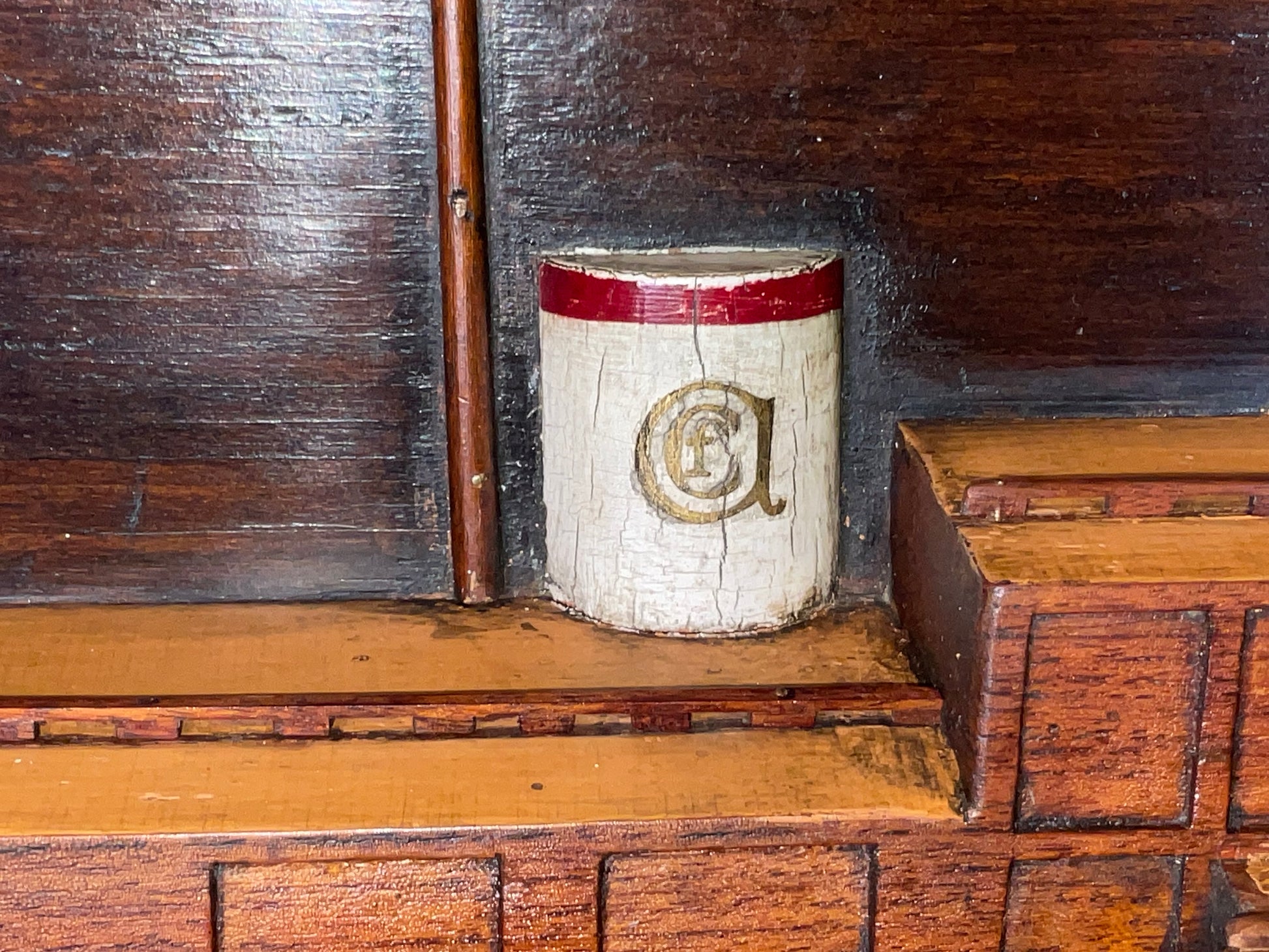 Half model of Trumpy style motor yacht "Virginia" with built-up cabins, stack, mast, flagstaff, prop shaft, etc.