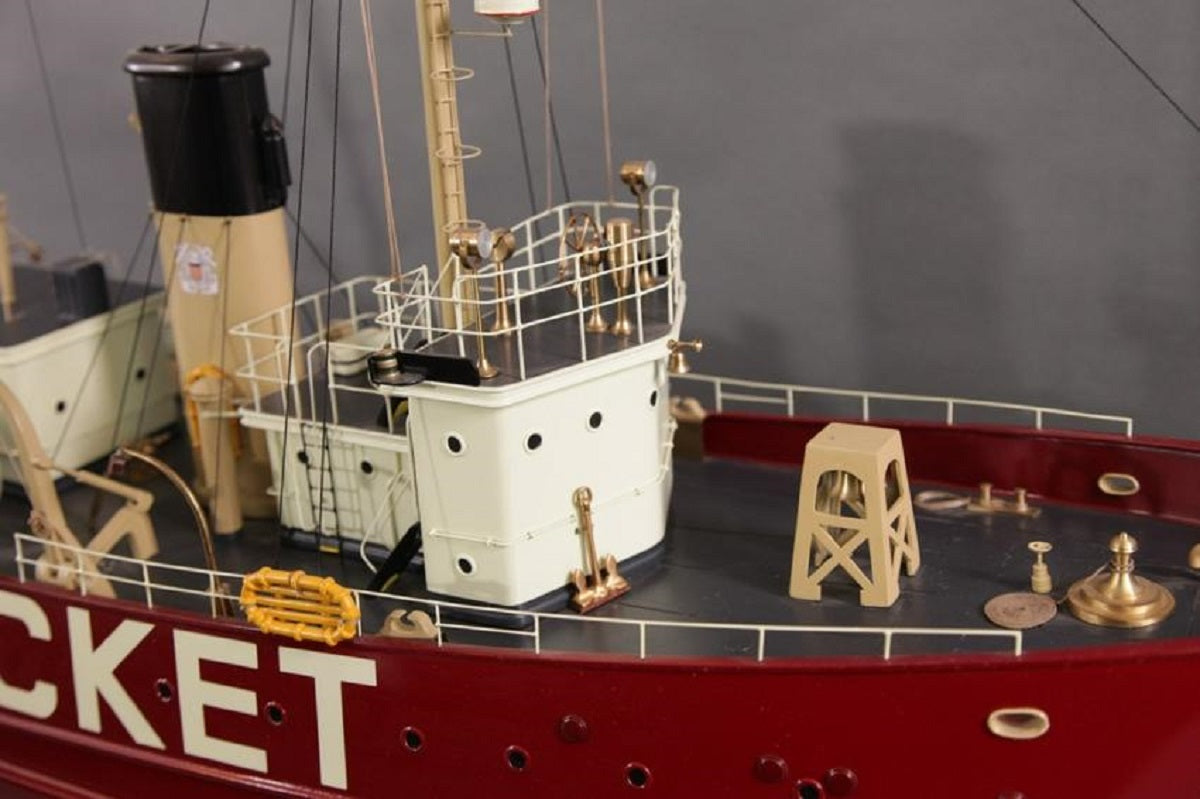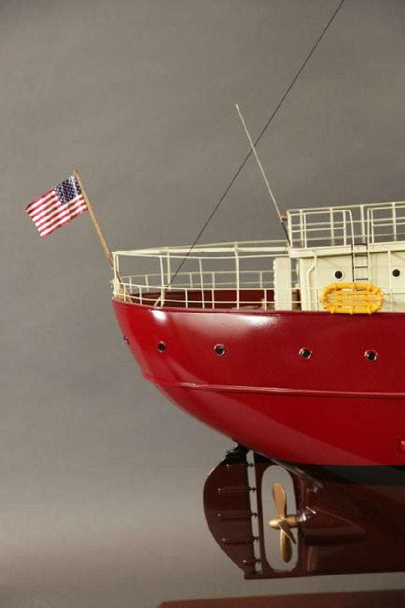 Four foot model of the Lightship Nantucket. What a great model, with perfectly scaled hardwood hull mounted to a mahogany baseboard with heavy milled brass pedestals. Many of the fittings as well as the masts are milled.