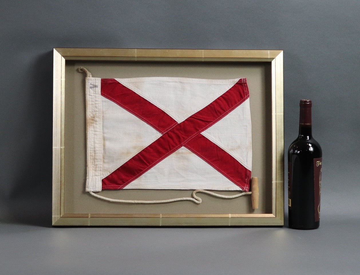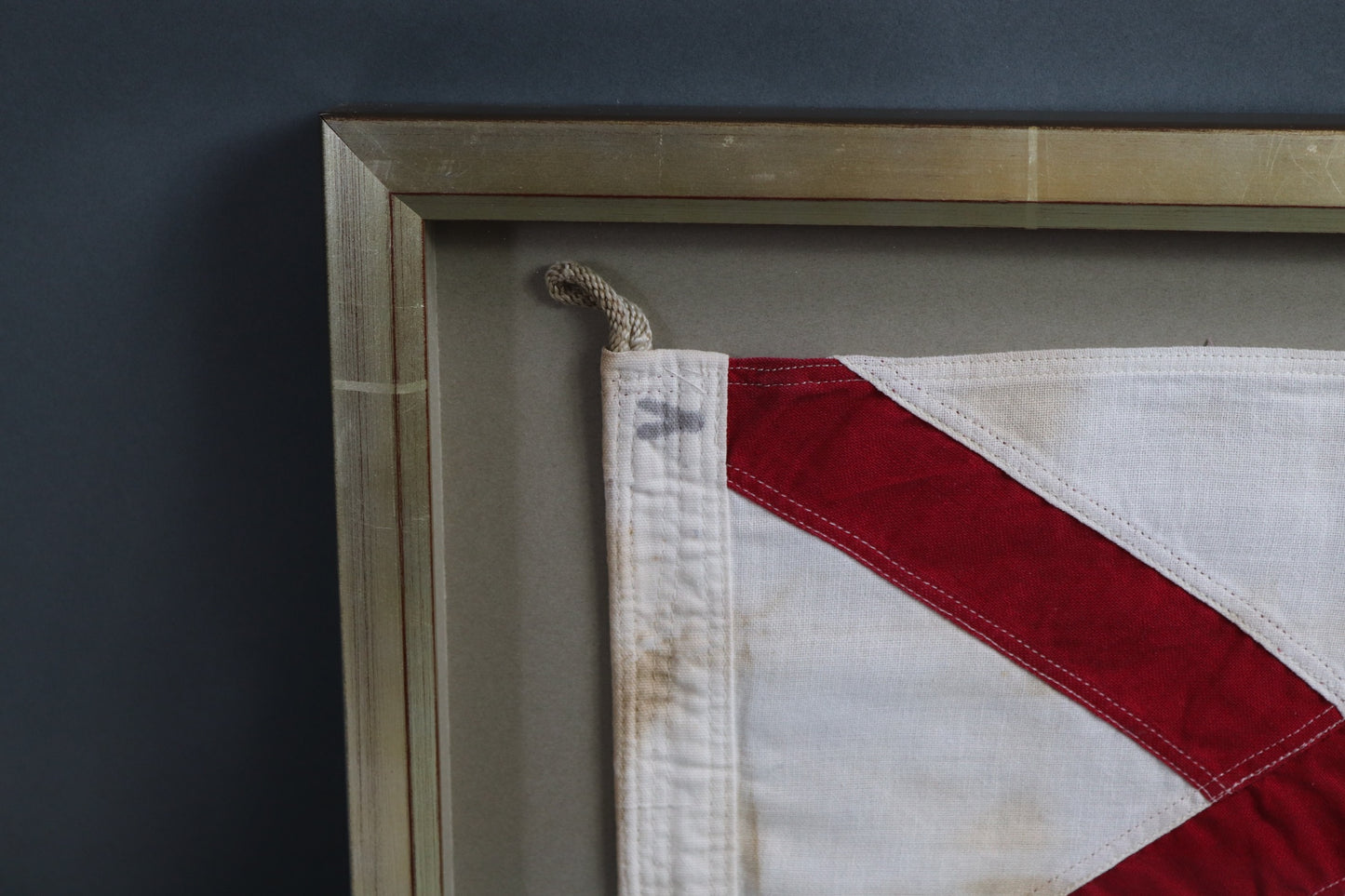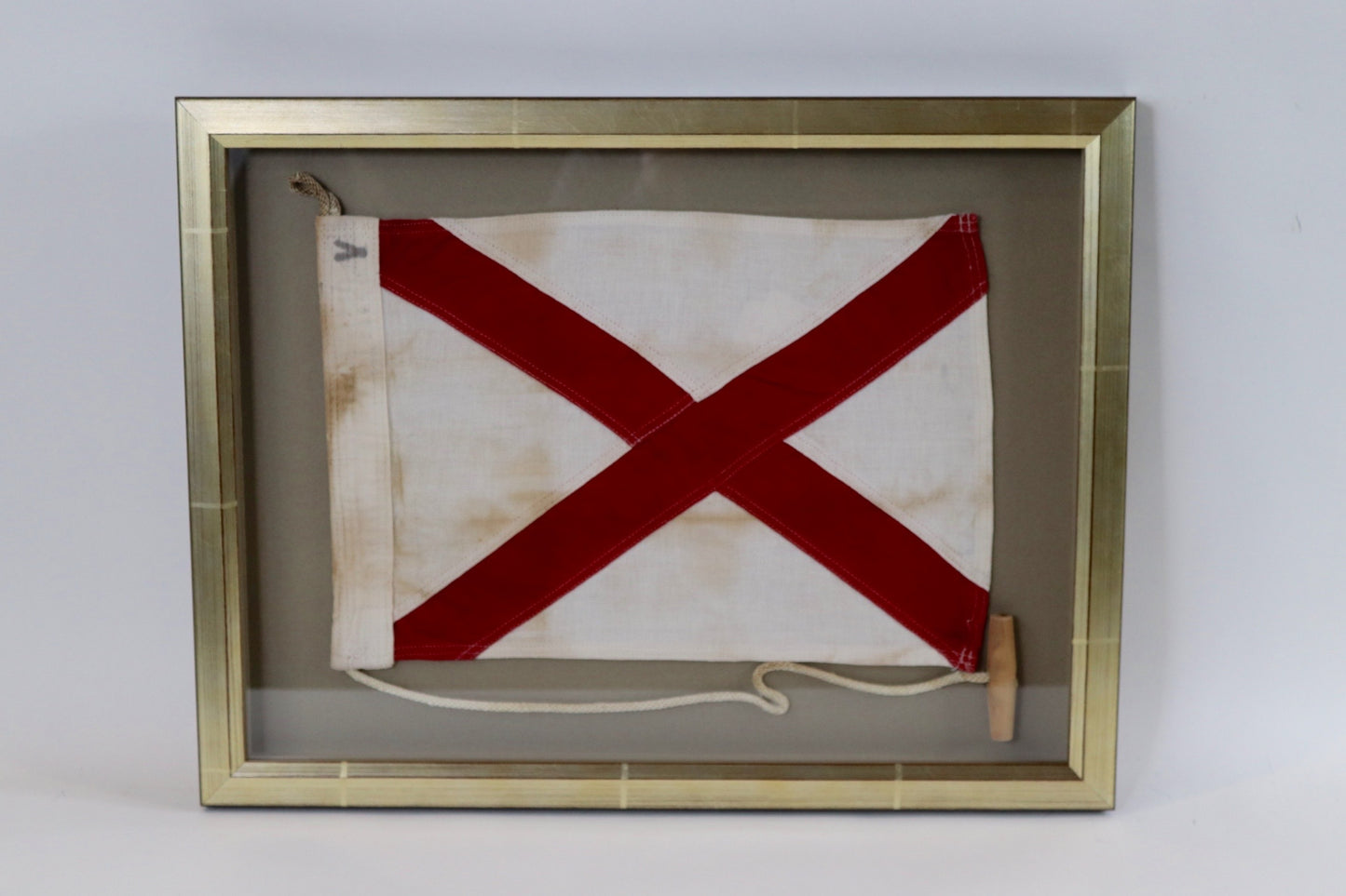 Framed marine pennant representing the letter V set into a shadow box frame with rope and wood toggle. Weight is 5 pounds.