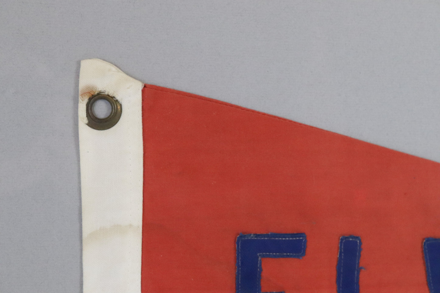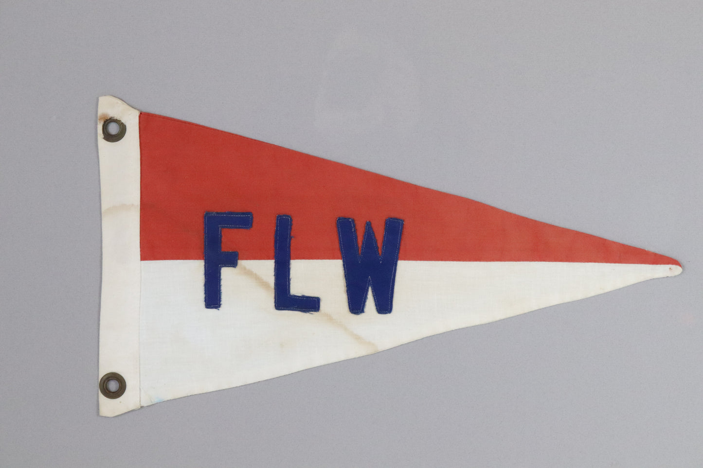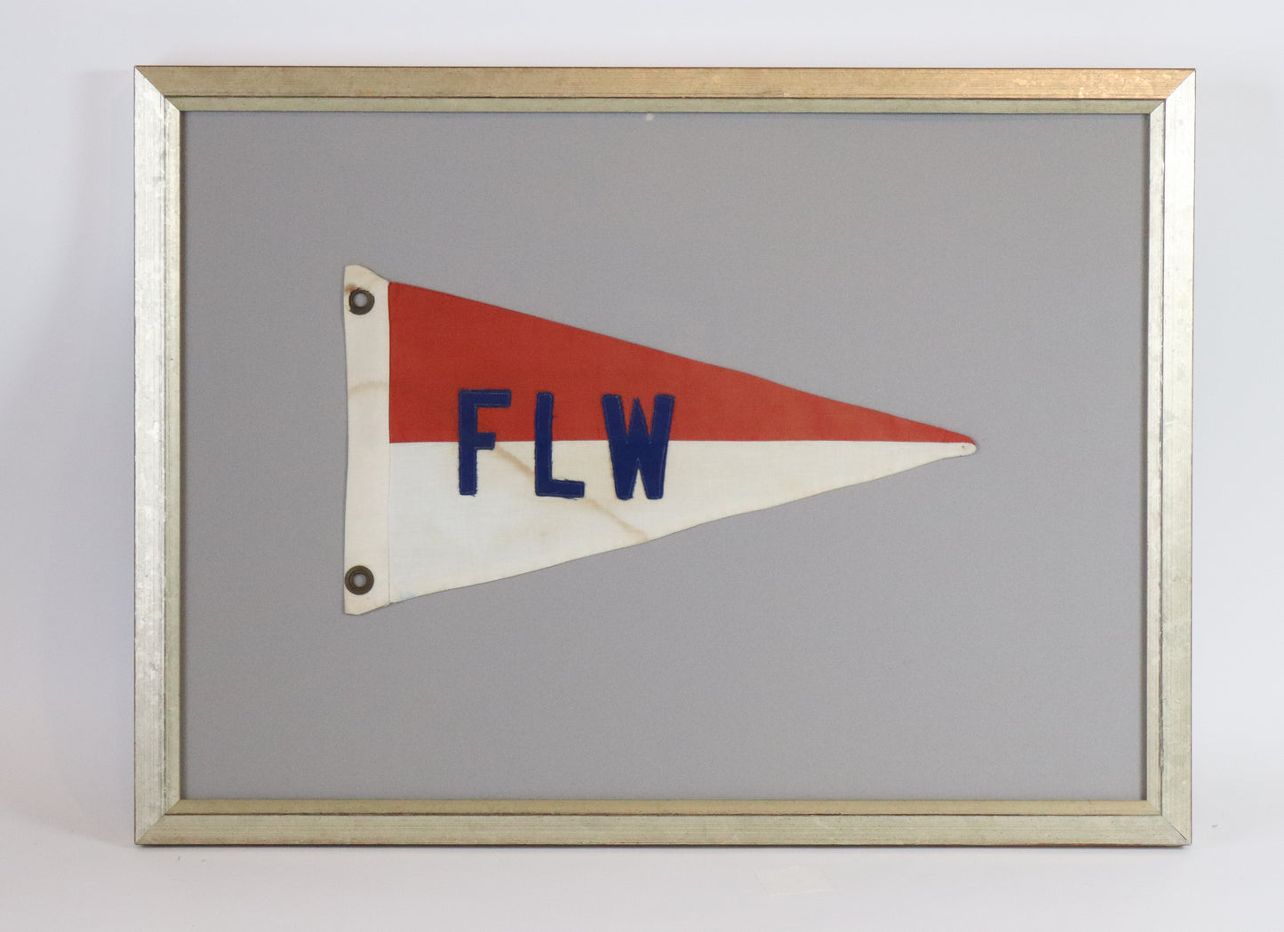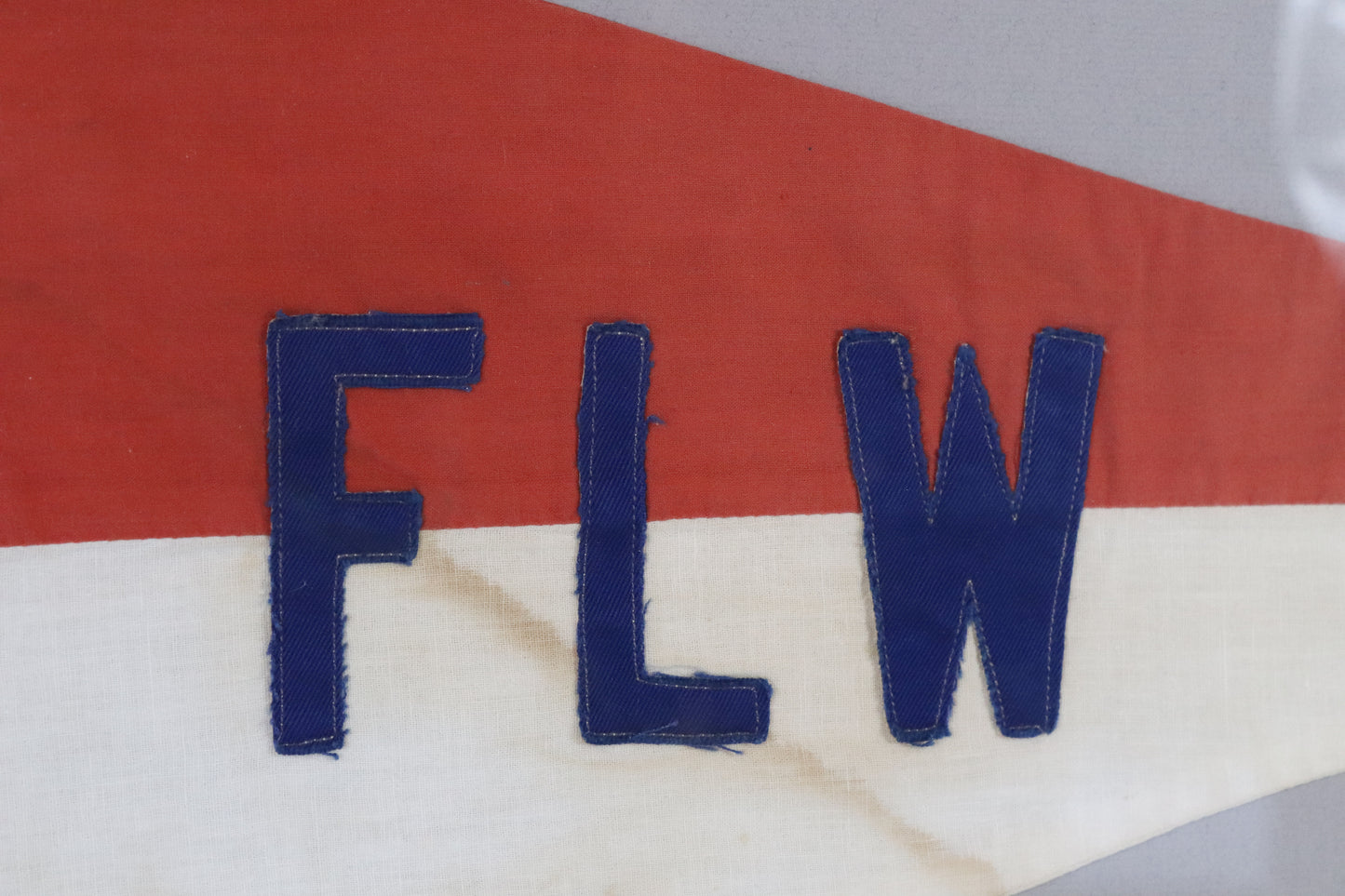 Stitched cotton yacht burgee with "FLW" sewn onto a red and white pointed burgee. Matted with grey and framed. 22" tall x 30" long.