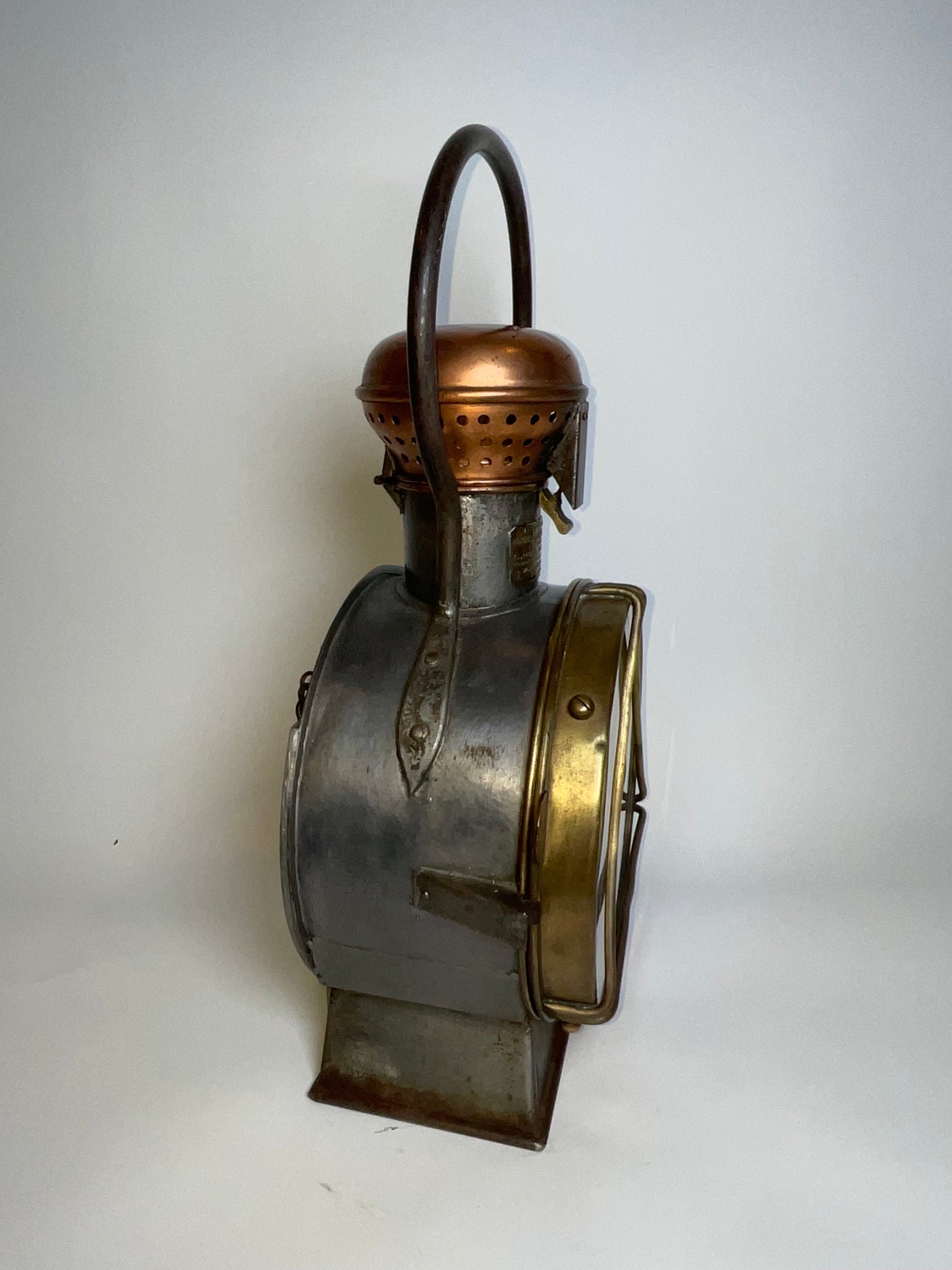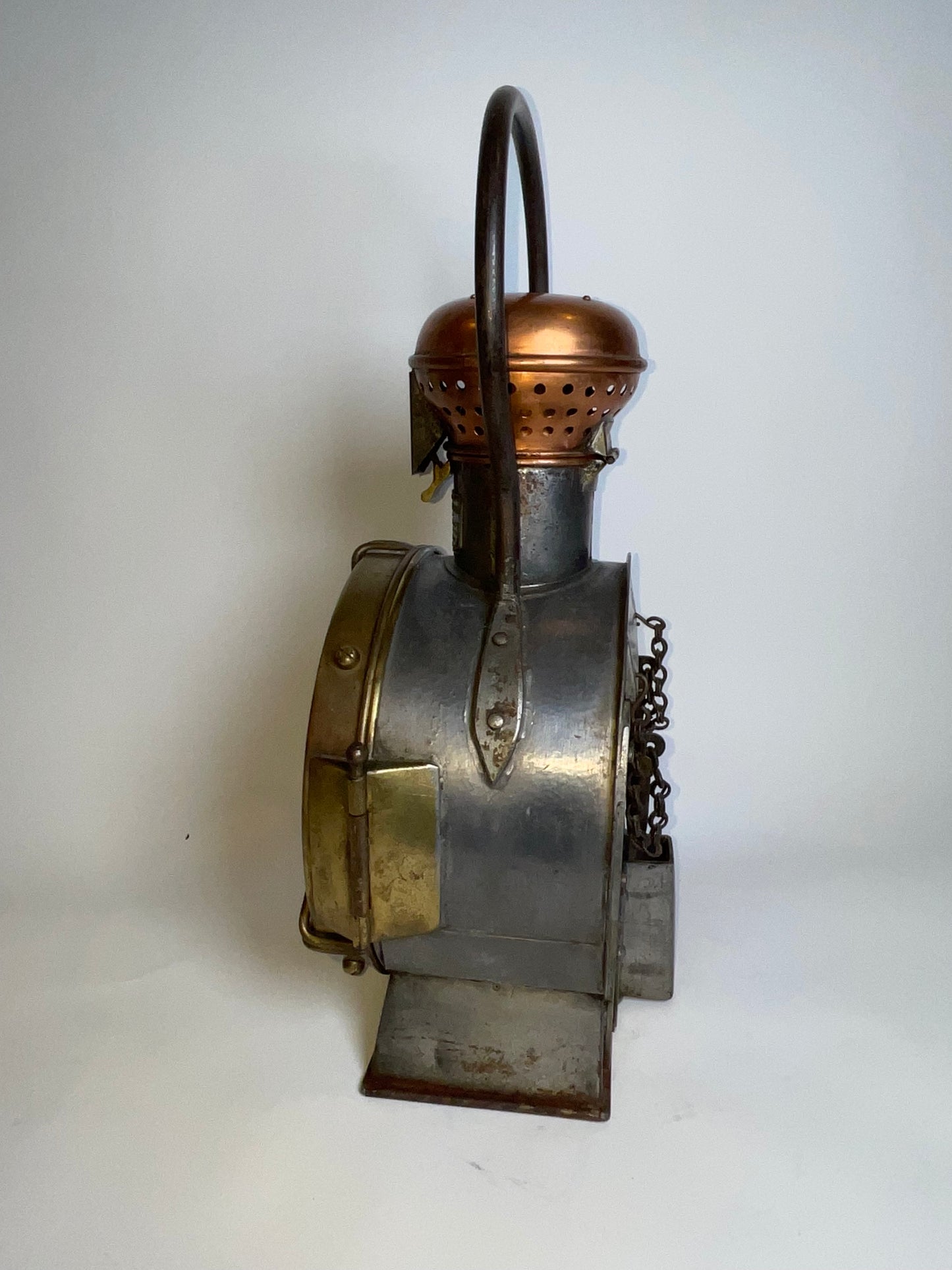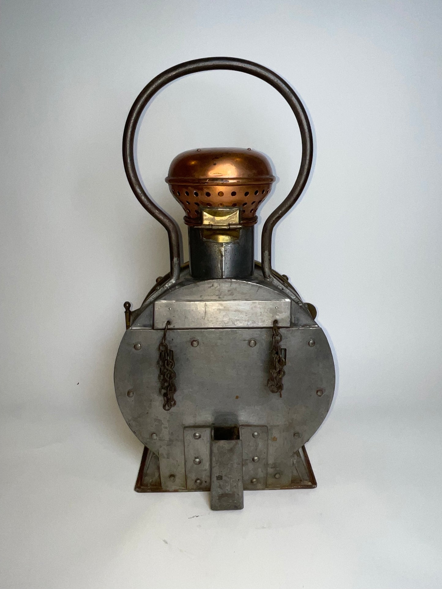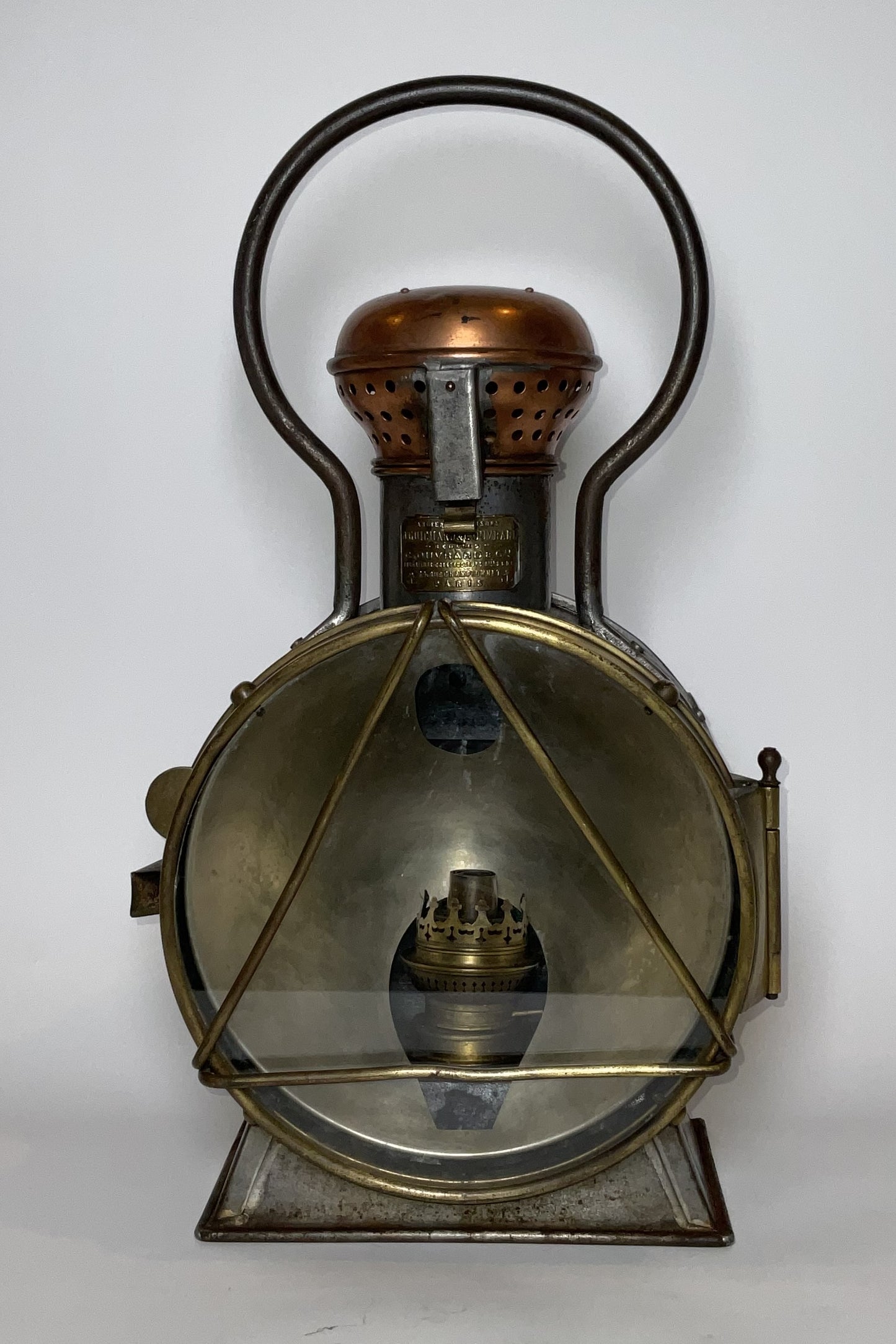 Industrial style early twentieth century signal lantern by French maker. Choice early twentieth century relic with embossed brass makers badge from J. Guichard & C. Ouvard, Reunies, C. Ouvard & Co. Ingenieurs, construceurs, Paris. This is a steel cased lantern with brass bezel and copper vent cap on hinge. Strong carry handle.