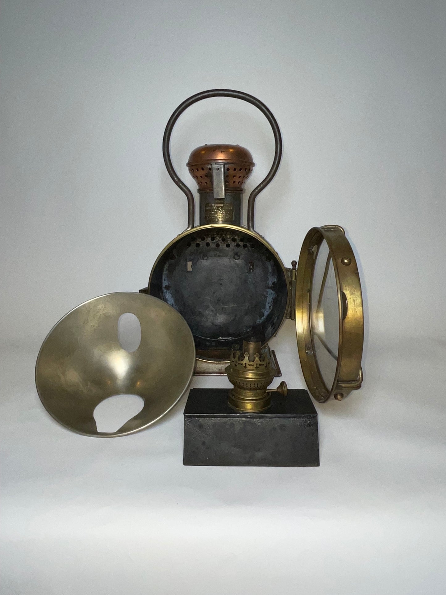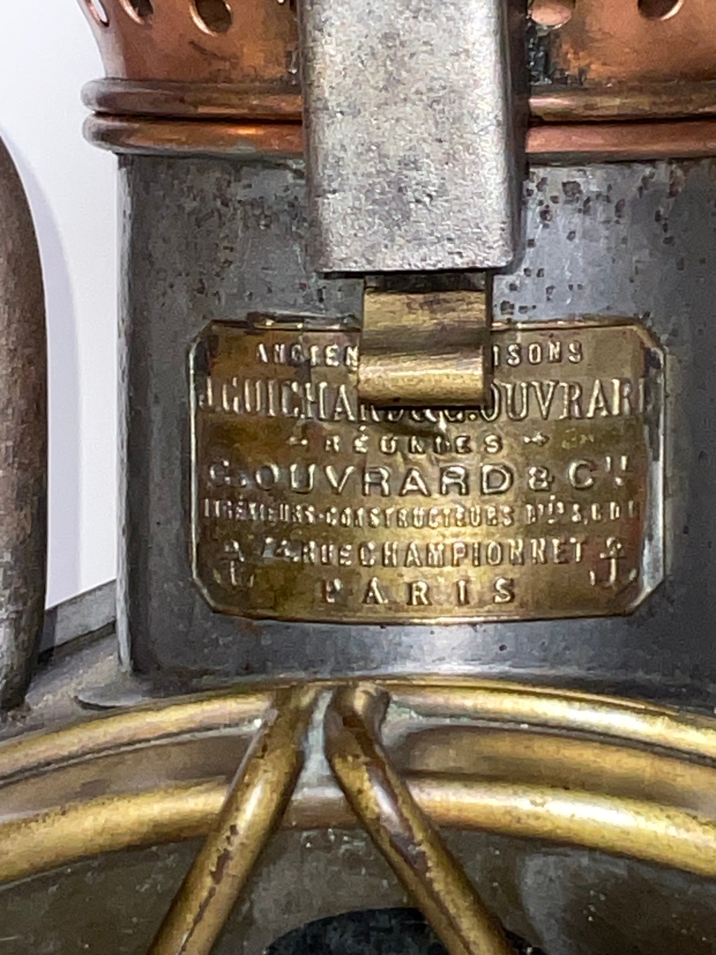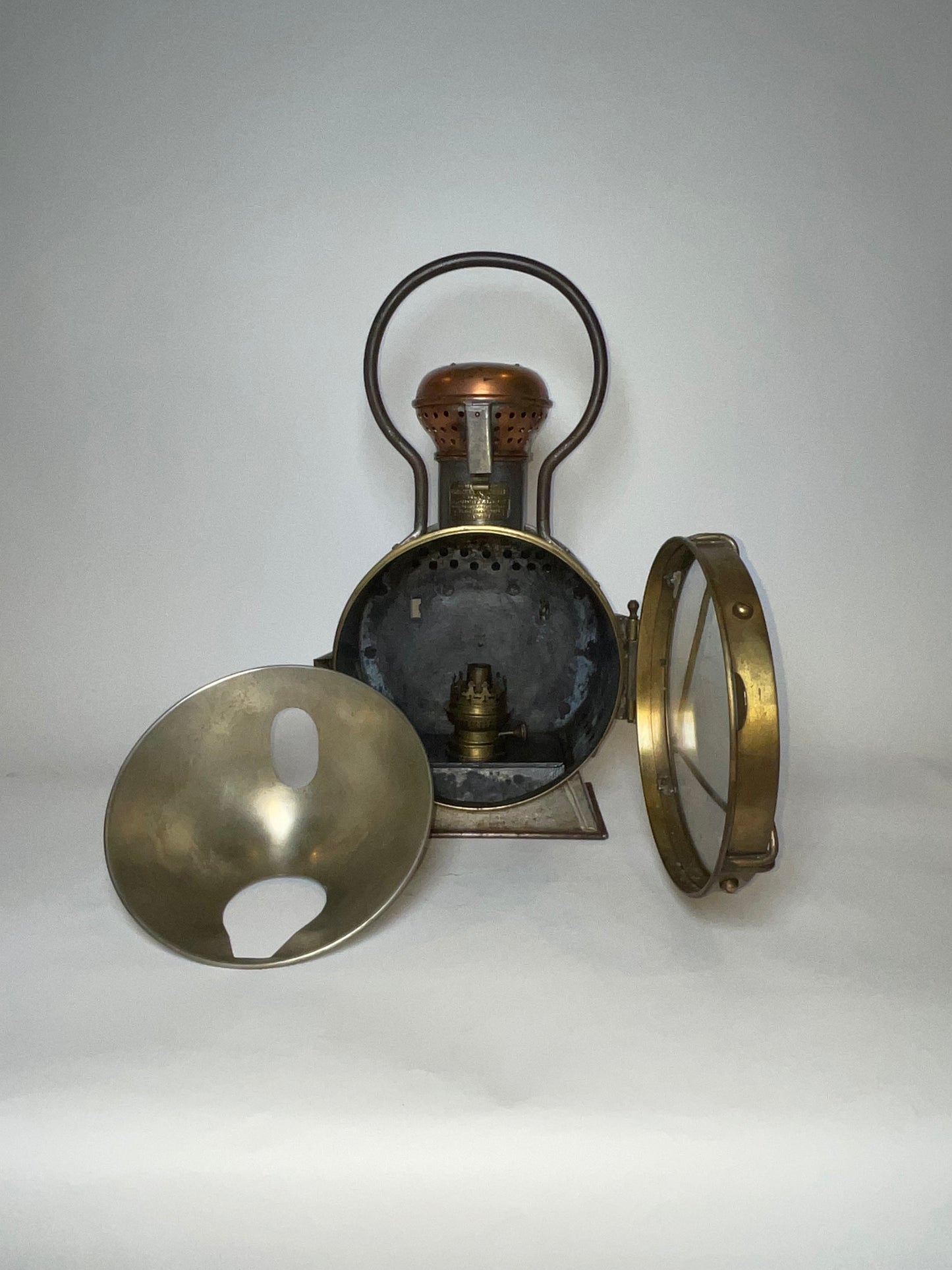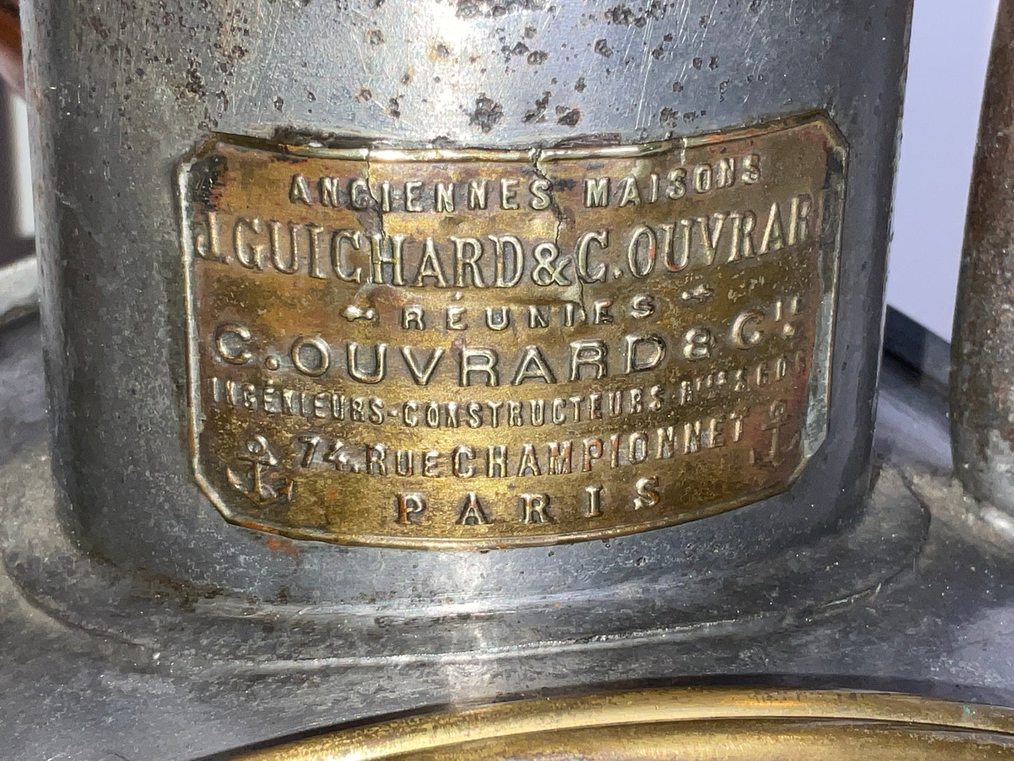 Industrial style early twentieth century signal lantern by French maker. Choice early twentieth century relic with embossed brass makers badge from J. Guichard & C. Ouvard, Reunies, C. Ouvard & Co. Ingenieurs, construceurs, Paris. This is a steel cased lantern with brass bezel and copper vent cap on hinge. Strong carry handle.