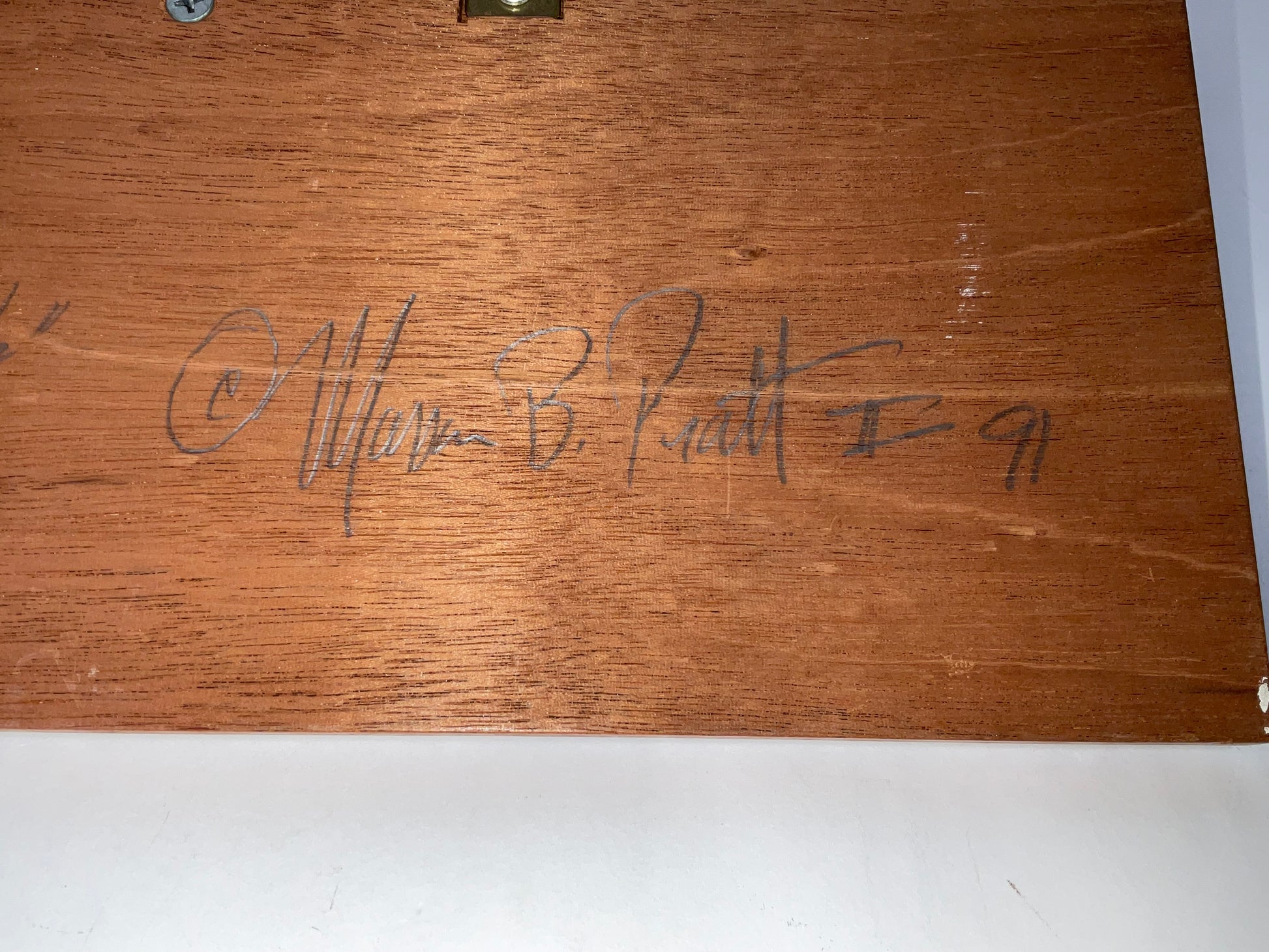 Fine half model of a "Block Island 40," designed by William H. Tripp Jr., an American naval architect. The model is by talented artist Marsom Pratt Jr., of North Dartmouth, Mass., 1981. The hull is white over green with mahogany cabin. Mounted to a hardwood backboard.