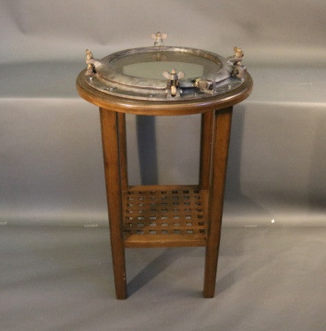 Heavy and sturdy bistro height ship's porthole table. A very large porthole has been stripped, polished, and sealed then fitted to a mahogany table with ship's grating shelf. Four tapered legs.
