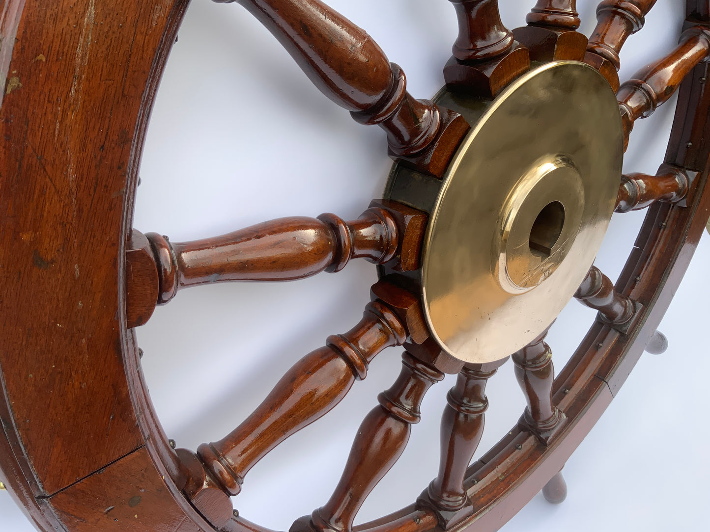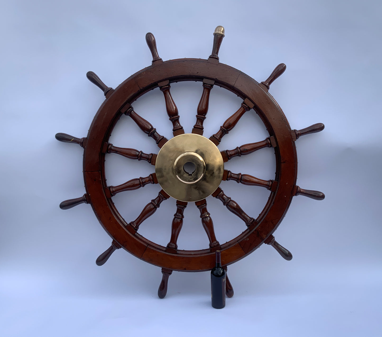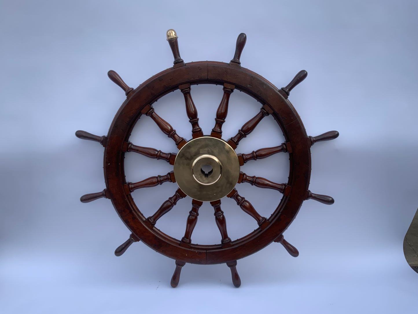 Antique five-foot ships wheel built to an exceptional standard of girth and strength. Massive brass hub with wide keyhole. Varnish finish on the hardwood wheel. Circa 1870. As heavy and impressive as they get.